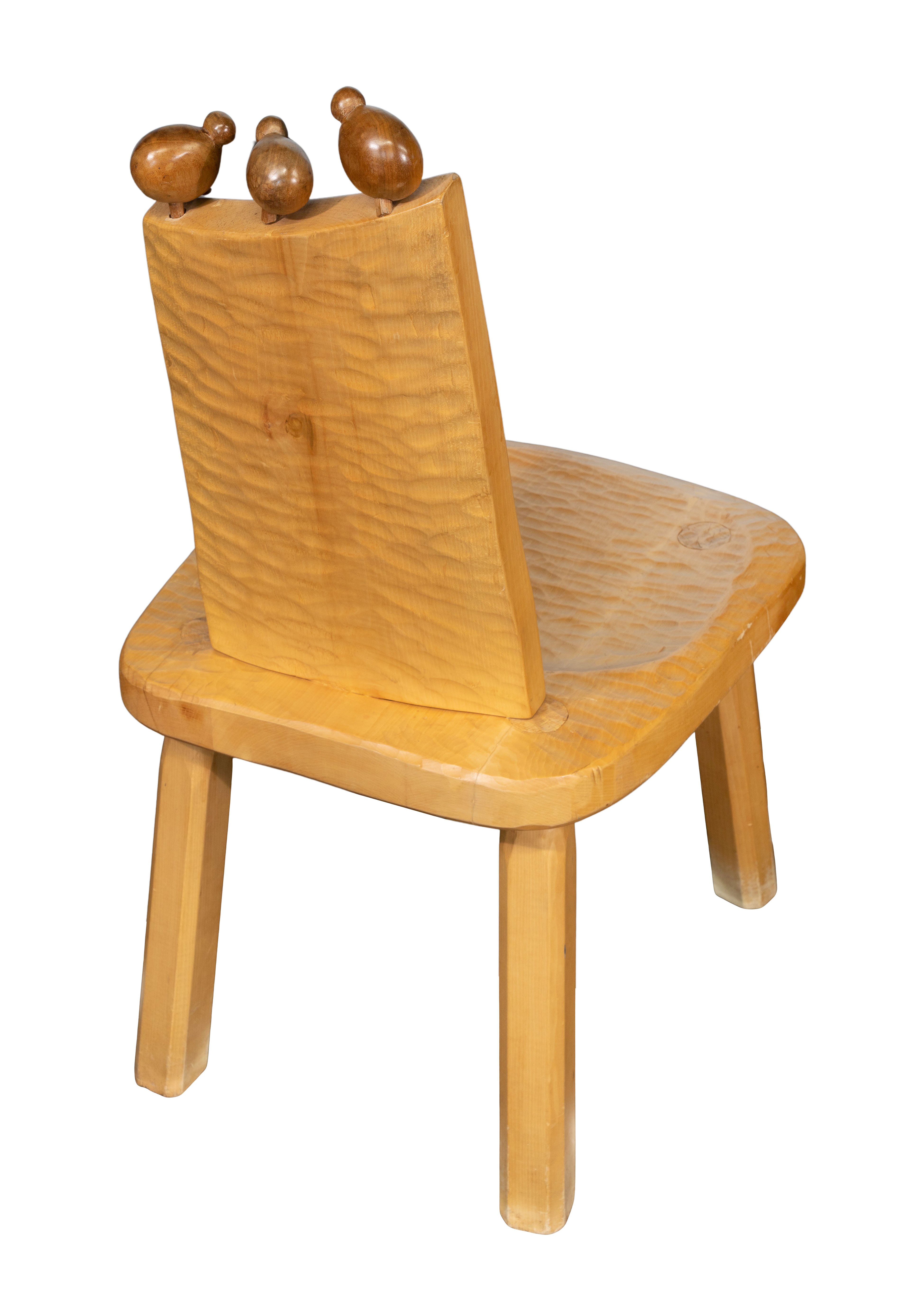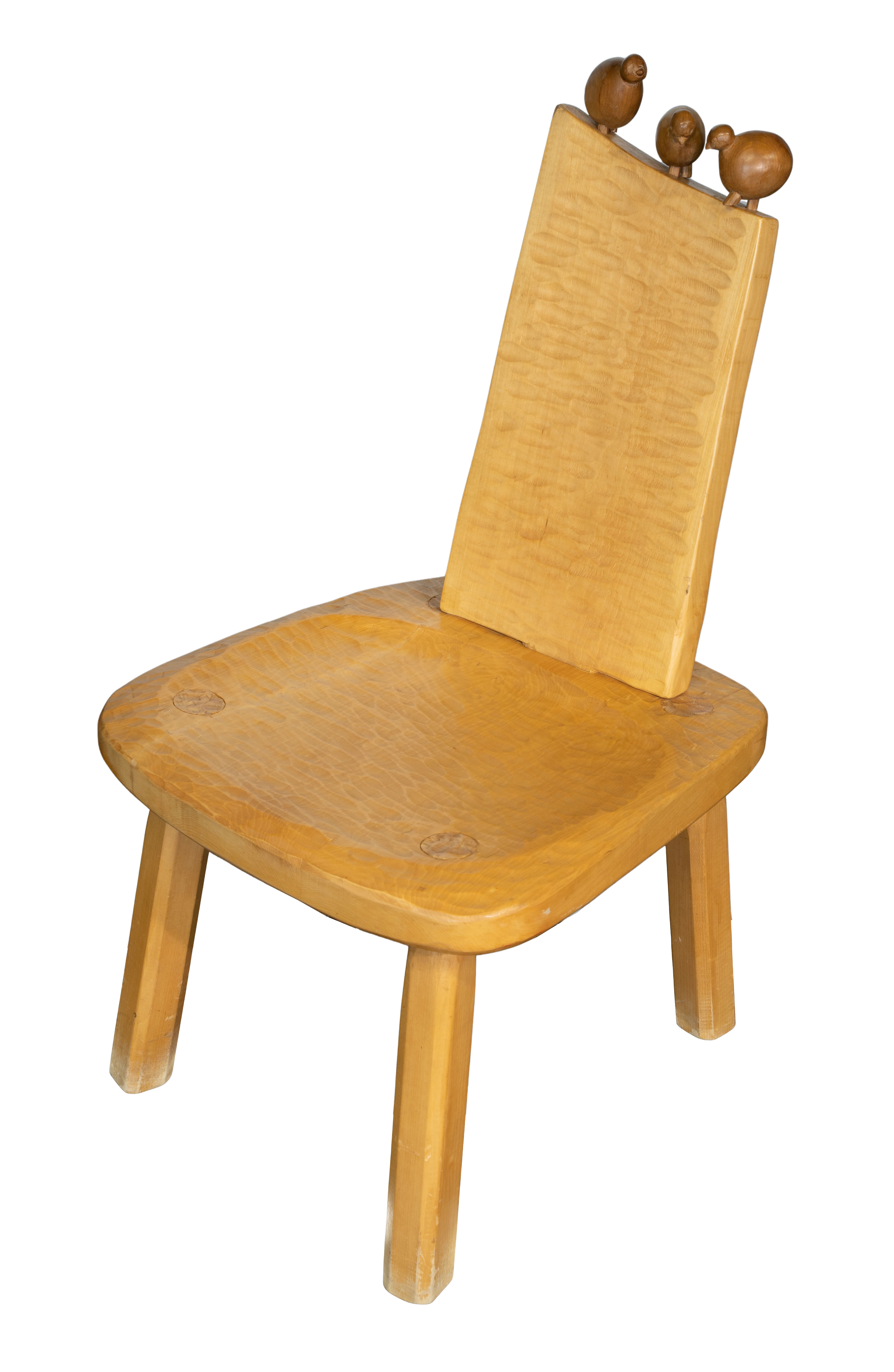Having carved textured details and three bird ornaments perched on chair back