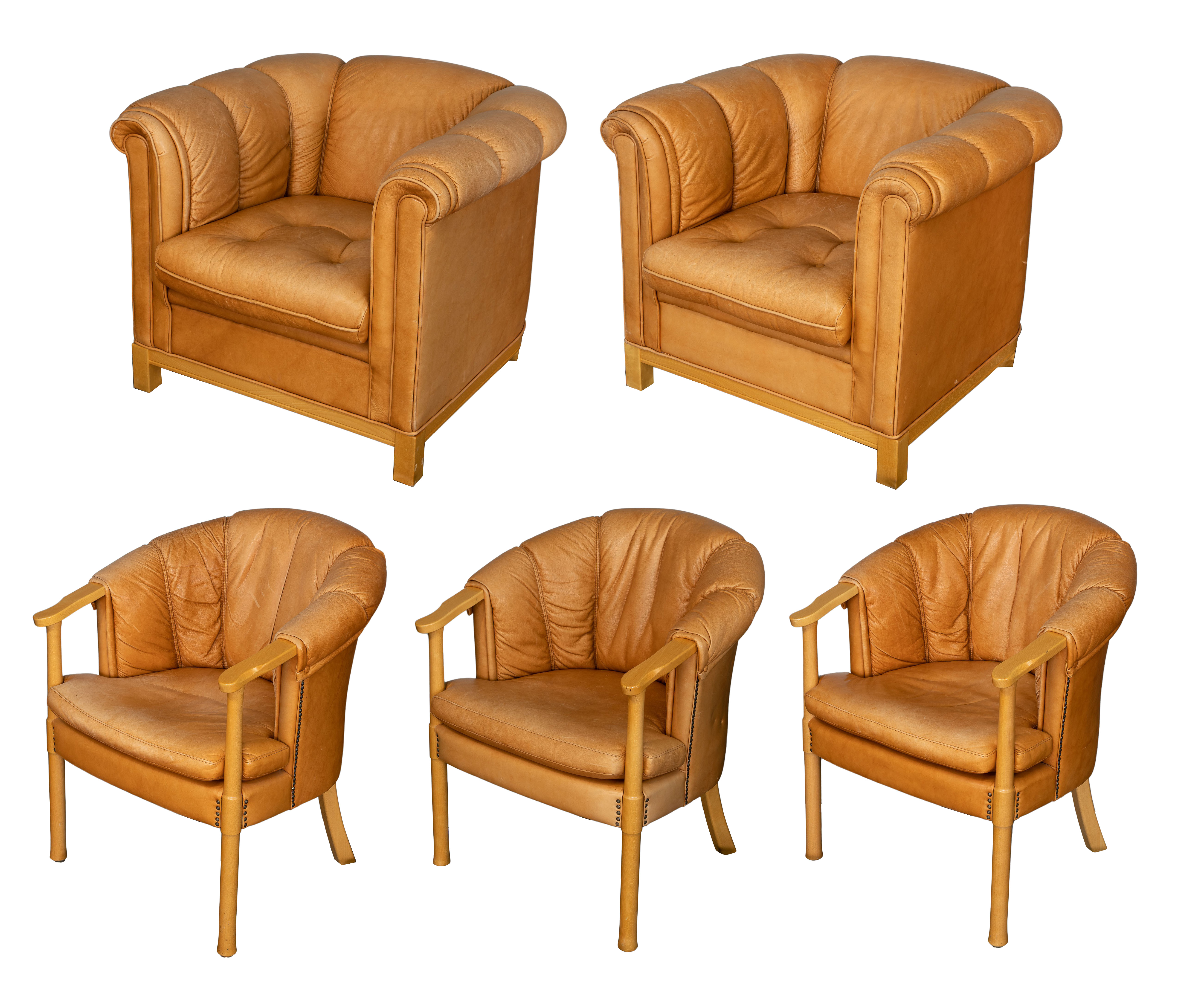 (5) items including a pair of club chairs and a set of (3) armchairs, all leather upholstered, the armchairs having nail head trim, marked underside