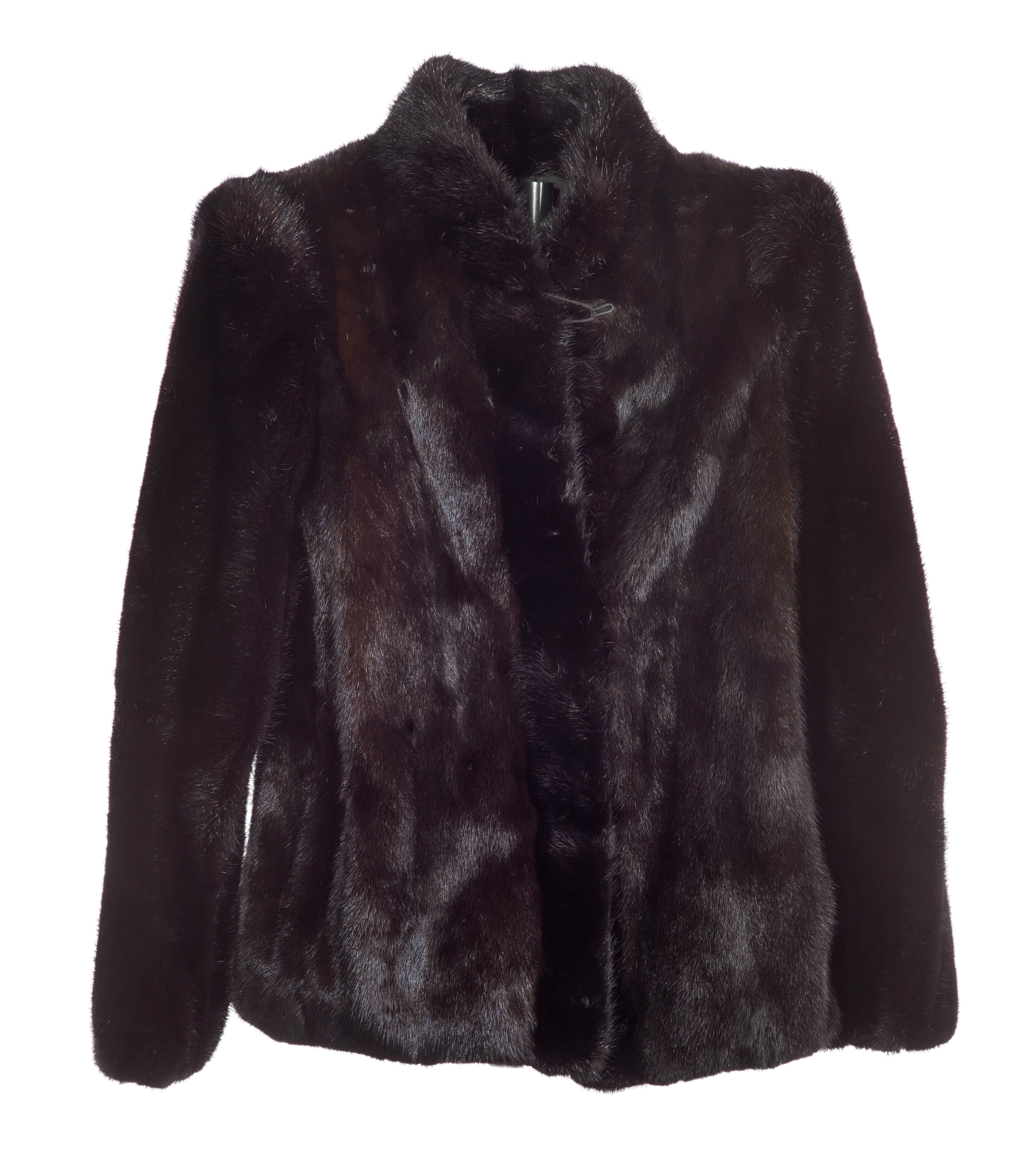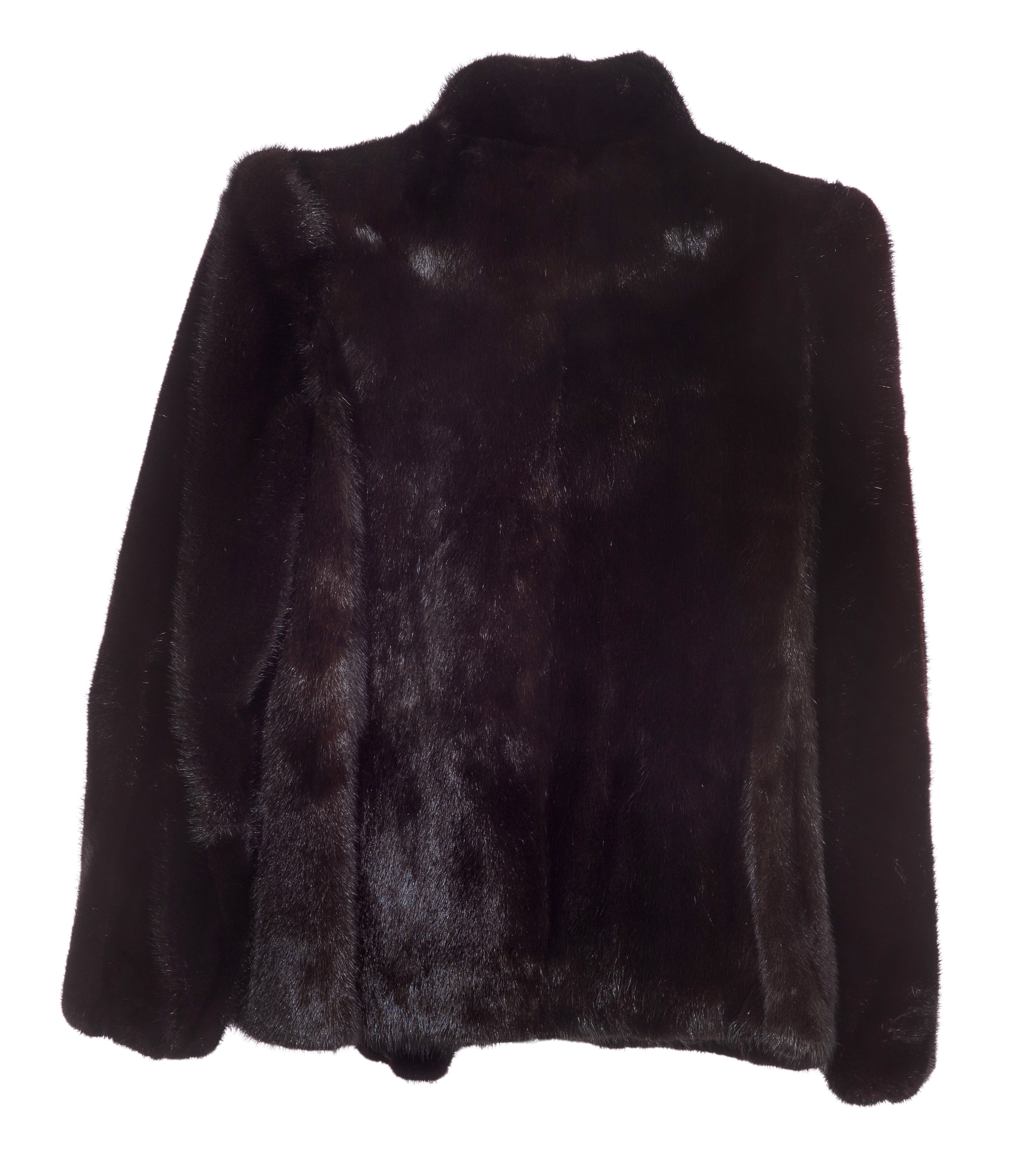Dark brown, bomber length, slit pockets, silk lining having monogram, elastic cuff and hook and eye closure