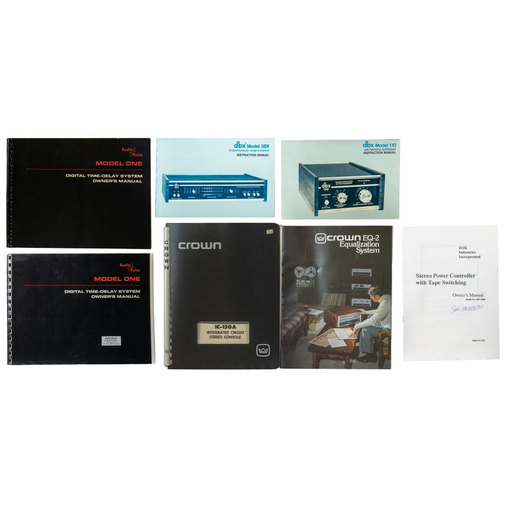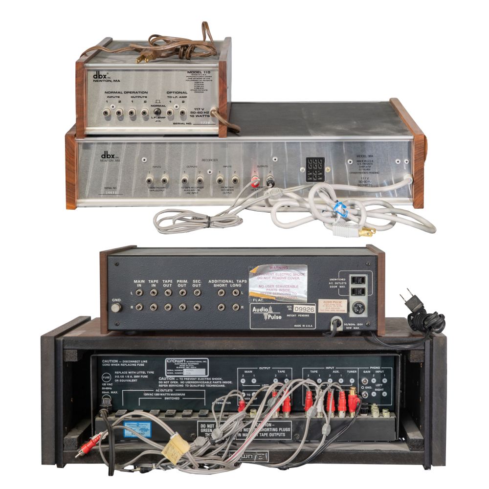 (4) items including a DBX model #3BX serial #18631 three-band range enhancer, a DBX model #110 serial #2719 sub-harmonic synthesizer, an Audio Pulse Model One serial #09926 digital time-delay system and a Crown model #IC-150 A serial #22991 stereo console, all having instruction manuals