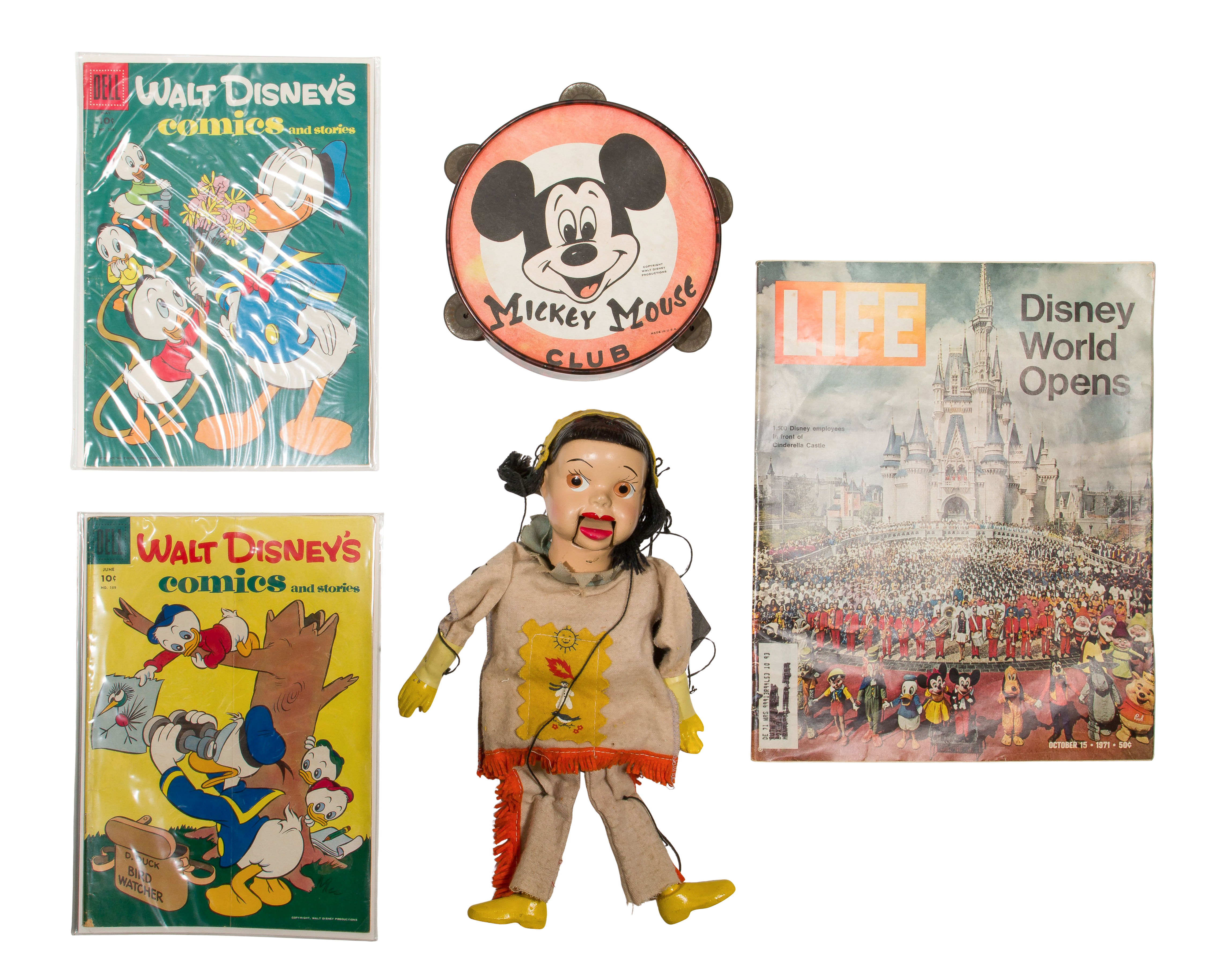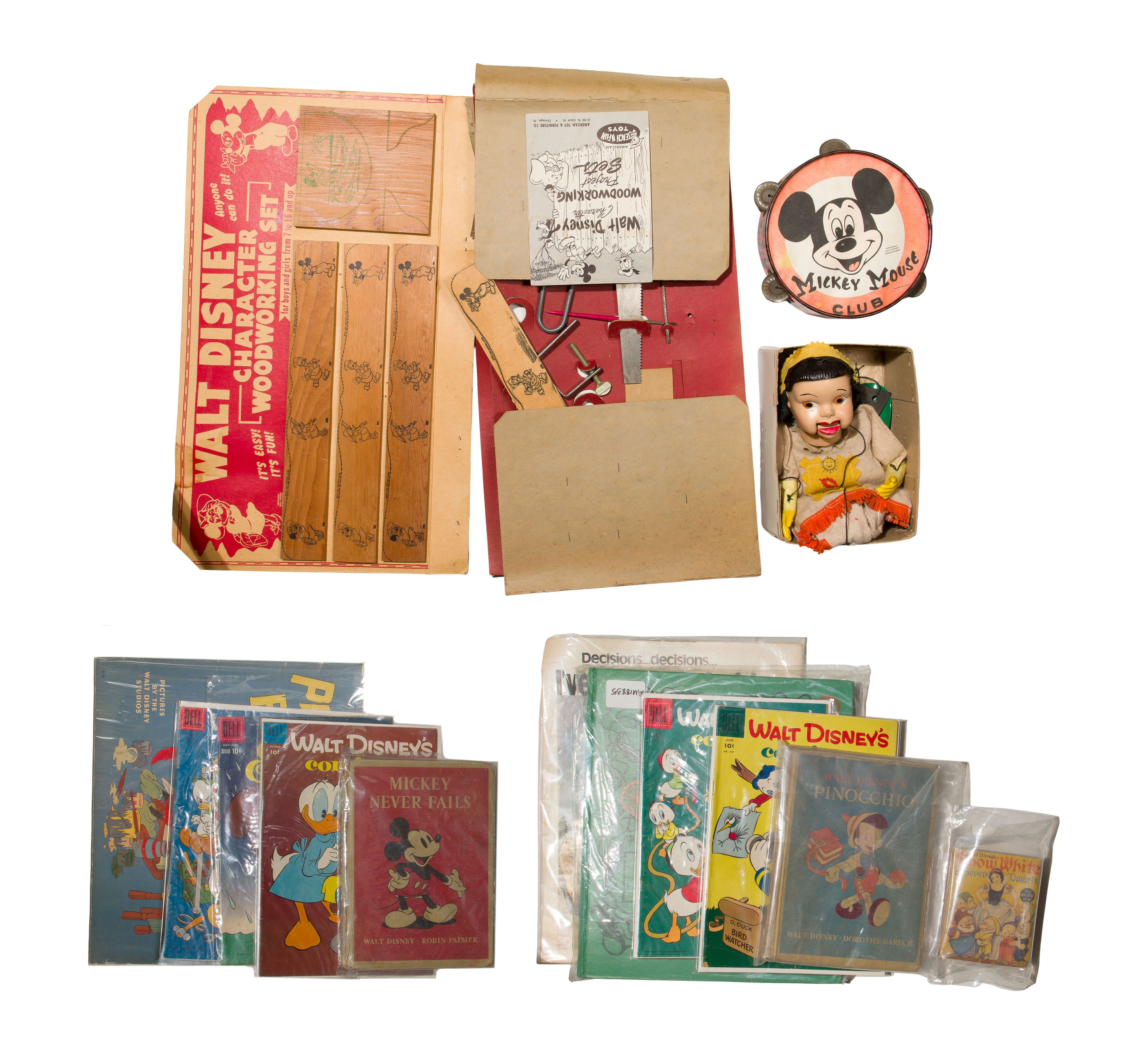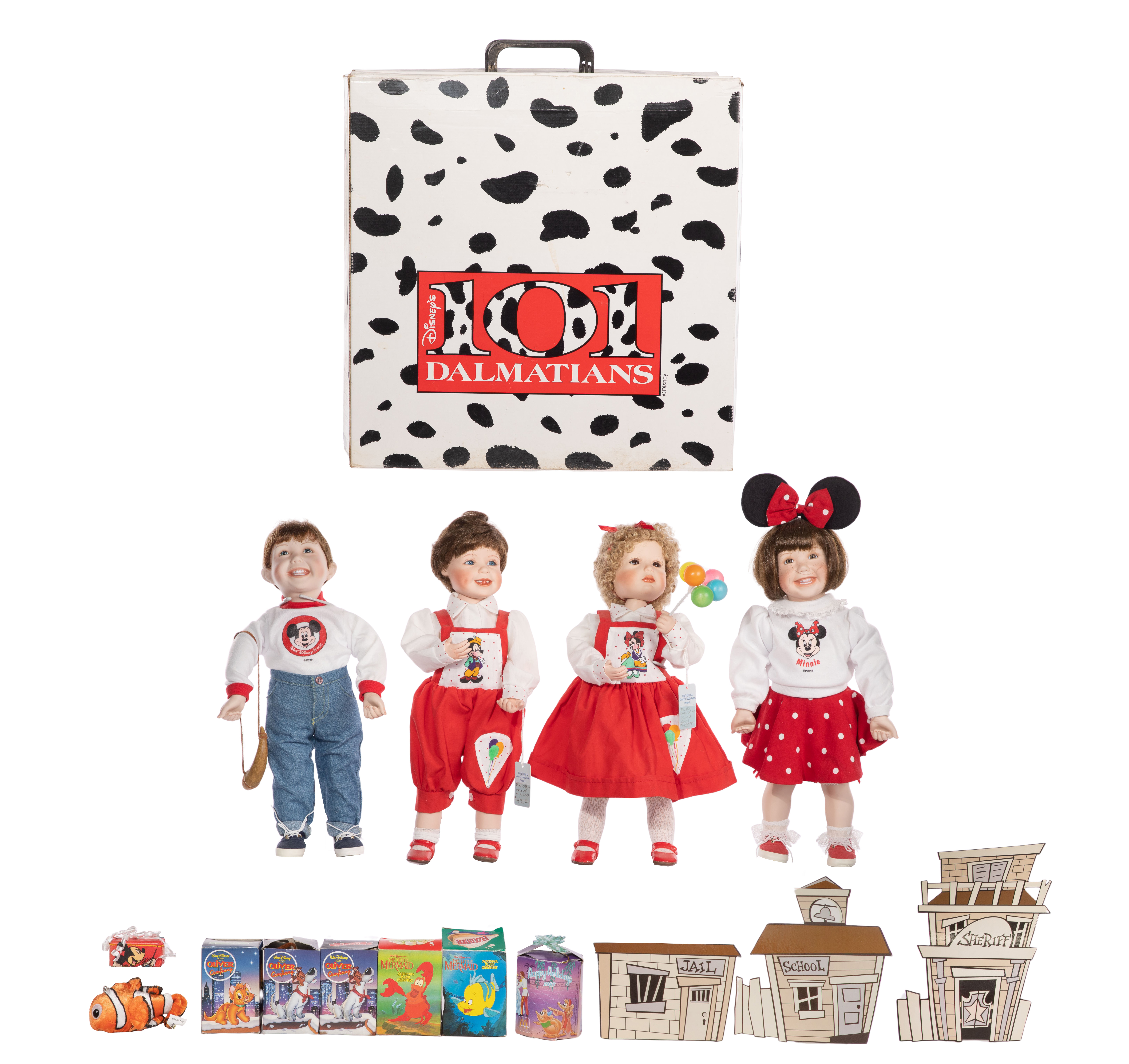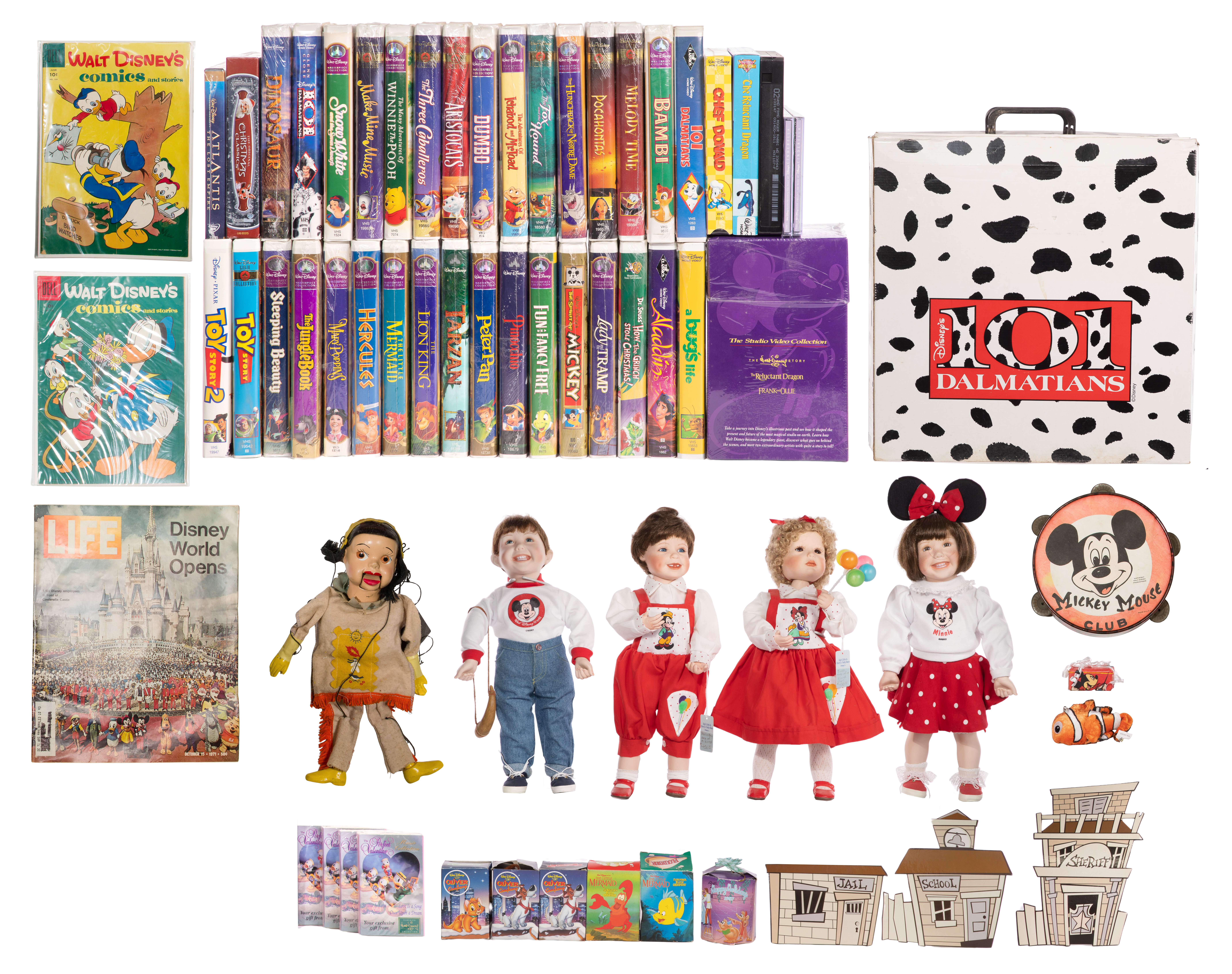 Approximately (30) items including a 1996 McDonald’s ‘One Hundred and One Dalmatians’ collection box set appearing complete, (5) Disney dressed dolls having resin heads and fabric bodies, (2) Barbies in original boxes, a 1938 coloring book, (5) Dell comic books, a wood working set, a Mickey Mouse Club tambourine and other objects as well as promo and other various items; together with approximately (35) VHS videos and compact discs including ‘Lady and the Tramp’, ‘Mary Poppins’, ‘The Lion King’, ‘Sleeping Beauty’ as well as music CDs, most being sealed