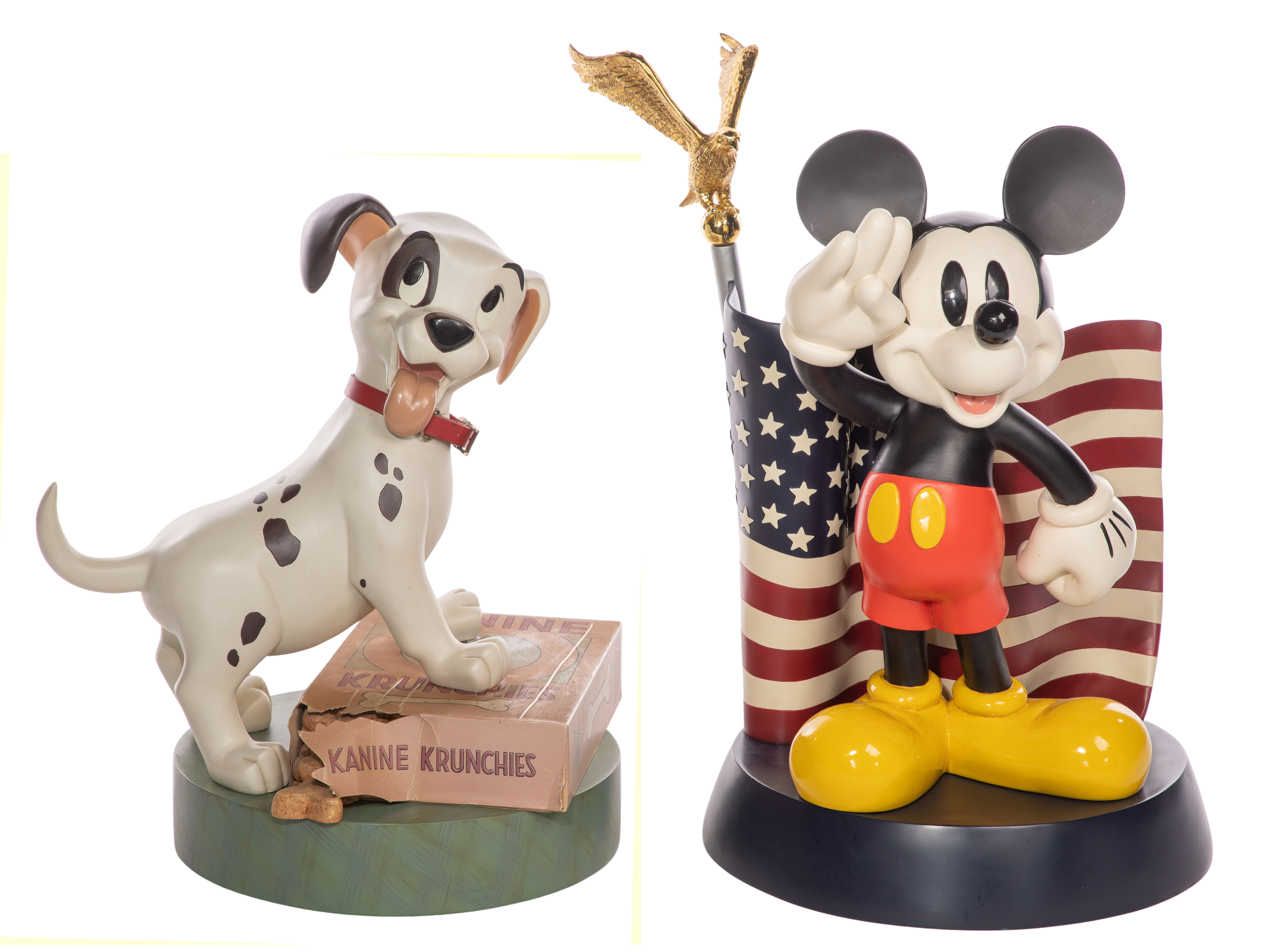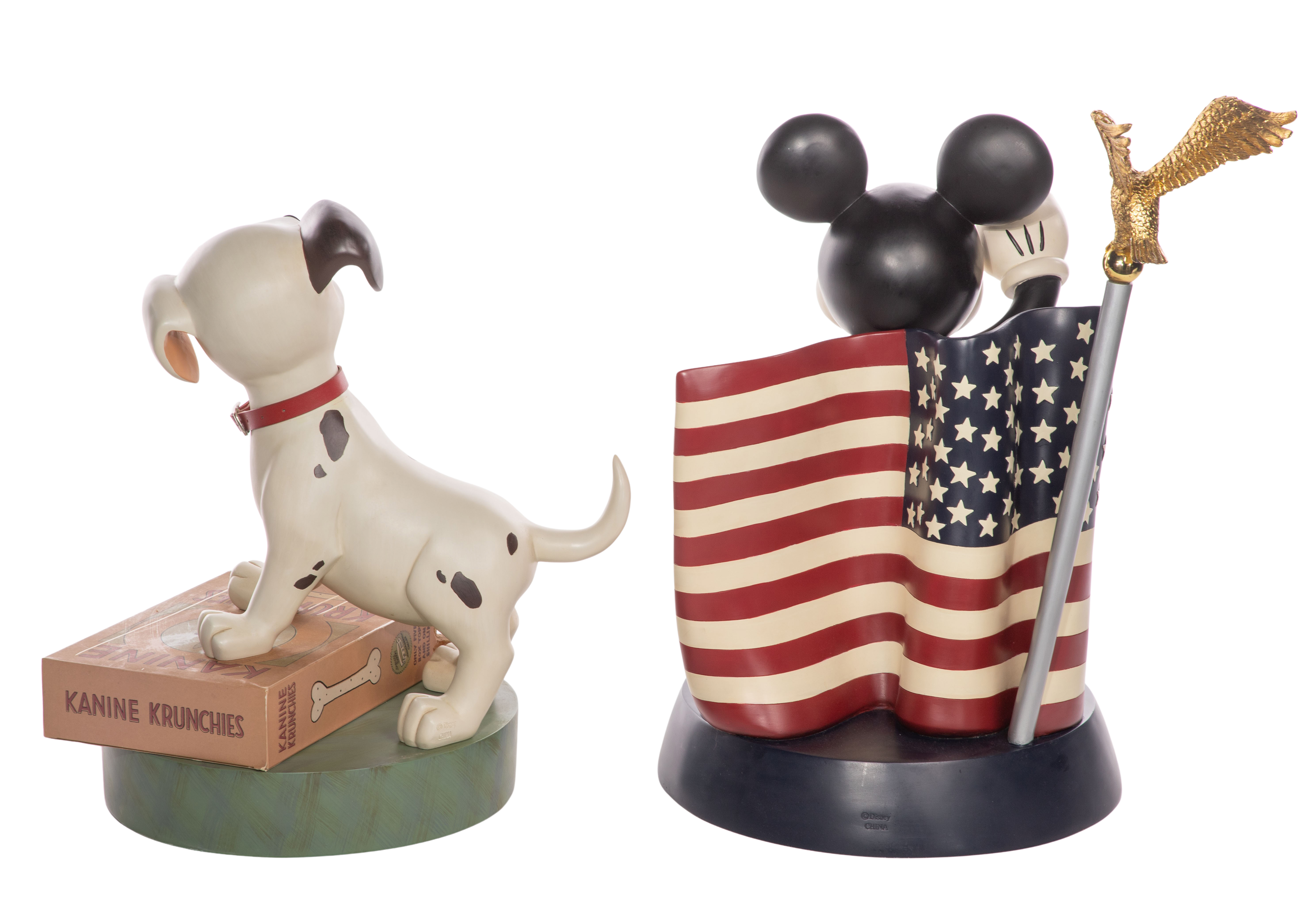 (2) cast resin items including Mickey Mouse on a flag motif stand and a puppy from ‘101 Dalmatians’ leaning on a paper-wrapped dog kibble box on a circular base