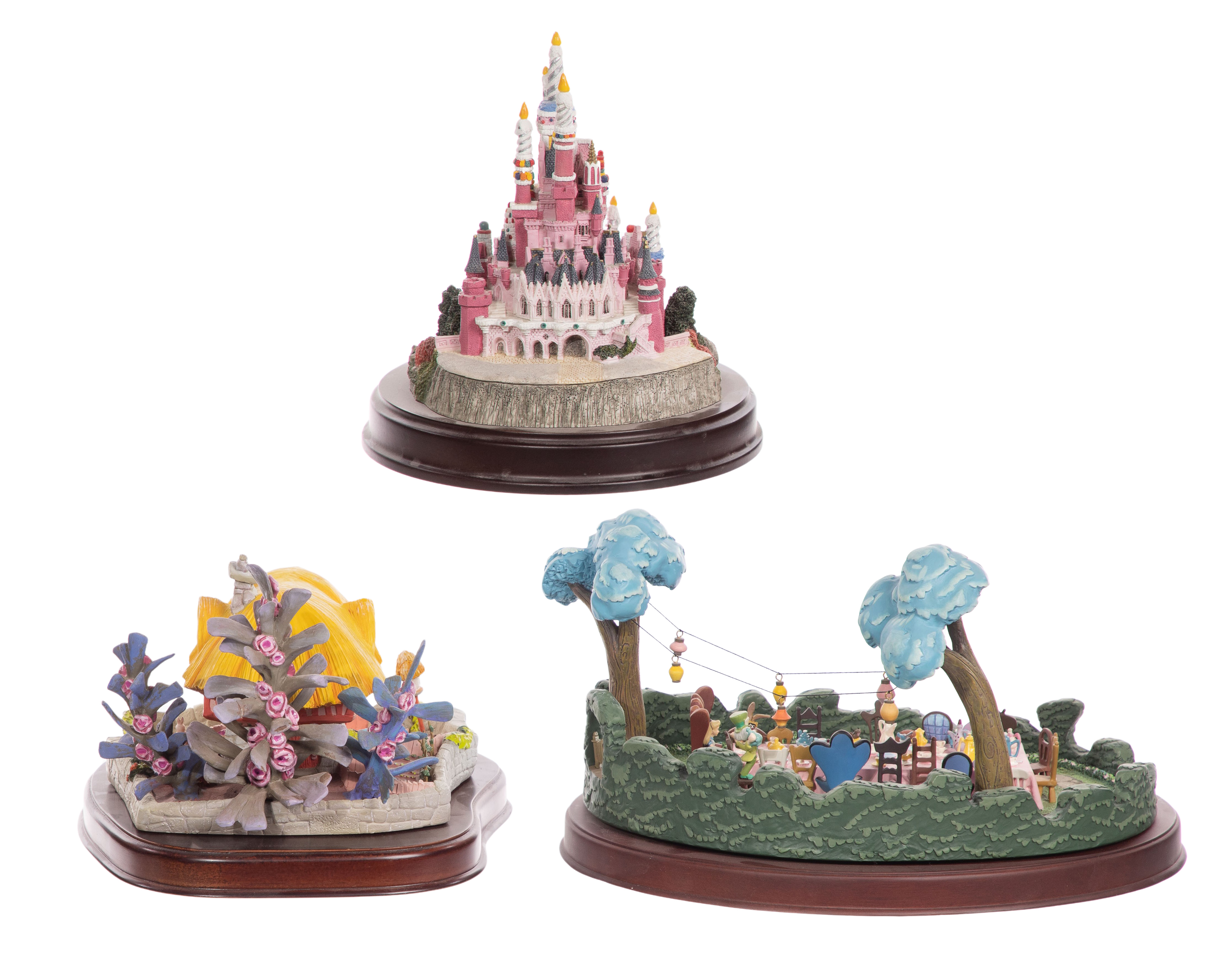 (3) resin items including ‘White Rabbit’s House’ and ‘Tea Party in Wonderland’ from ‘Alice in Wonderland’; together with a signed ’25 Magical Years Castle’, all set on wood bases having title plaques, all marked on underside