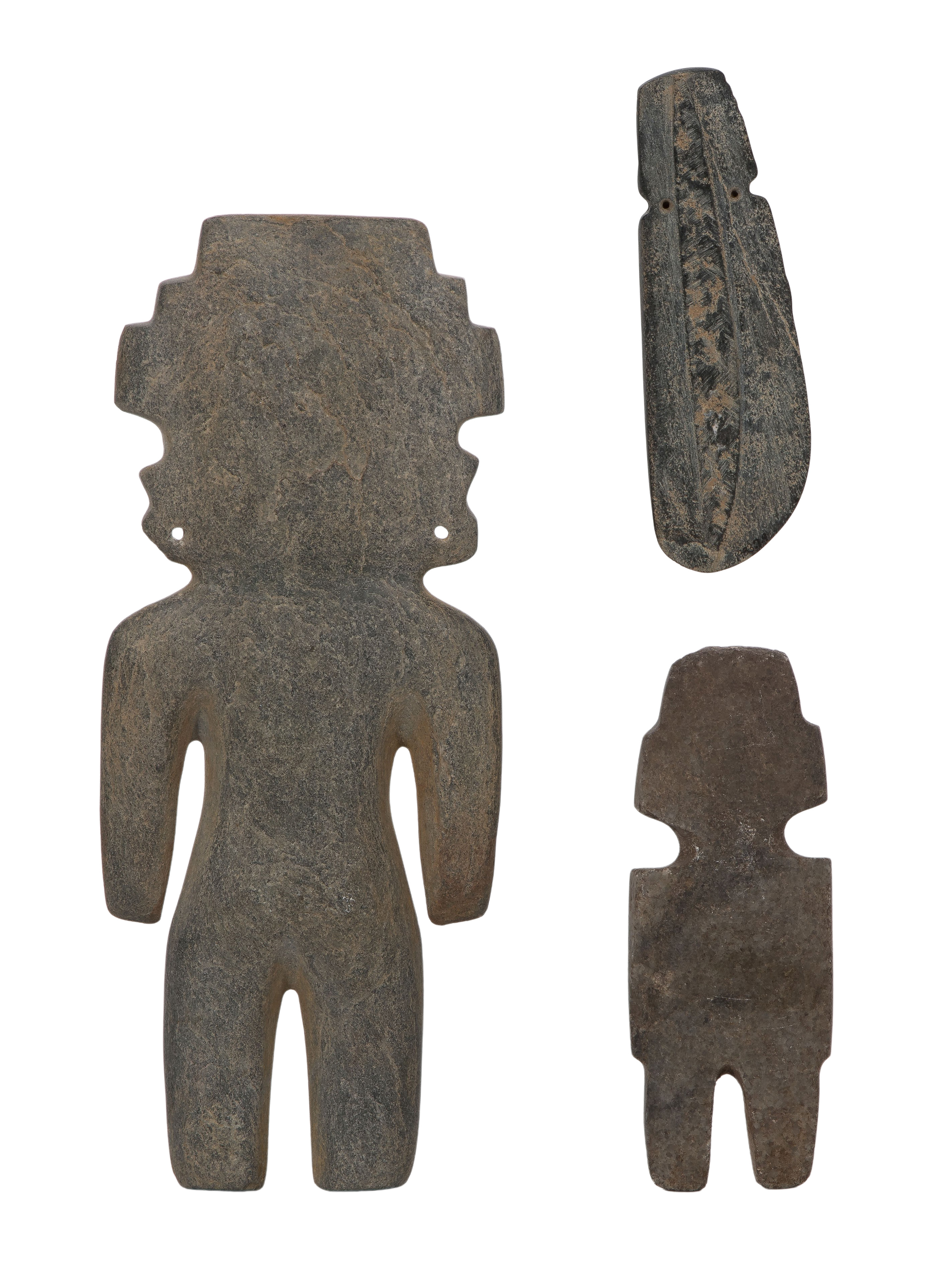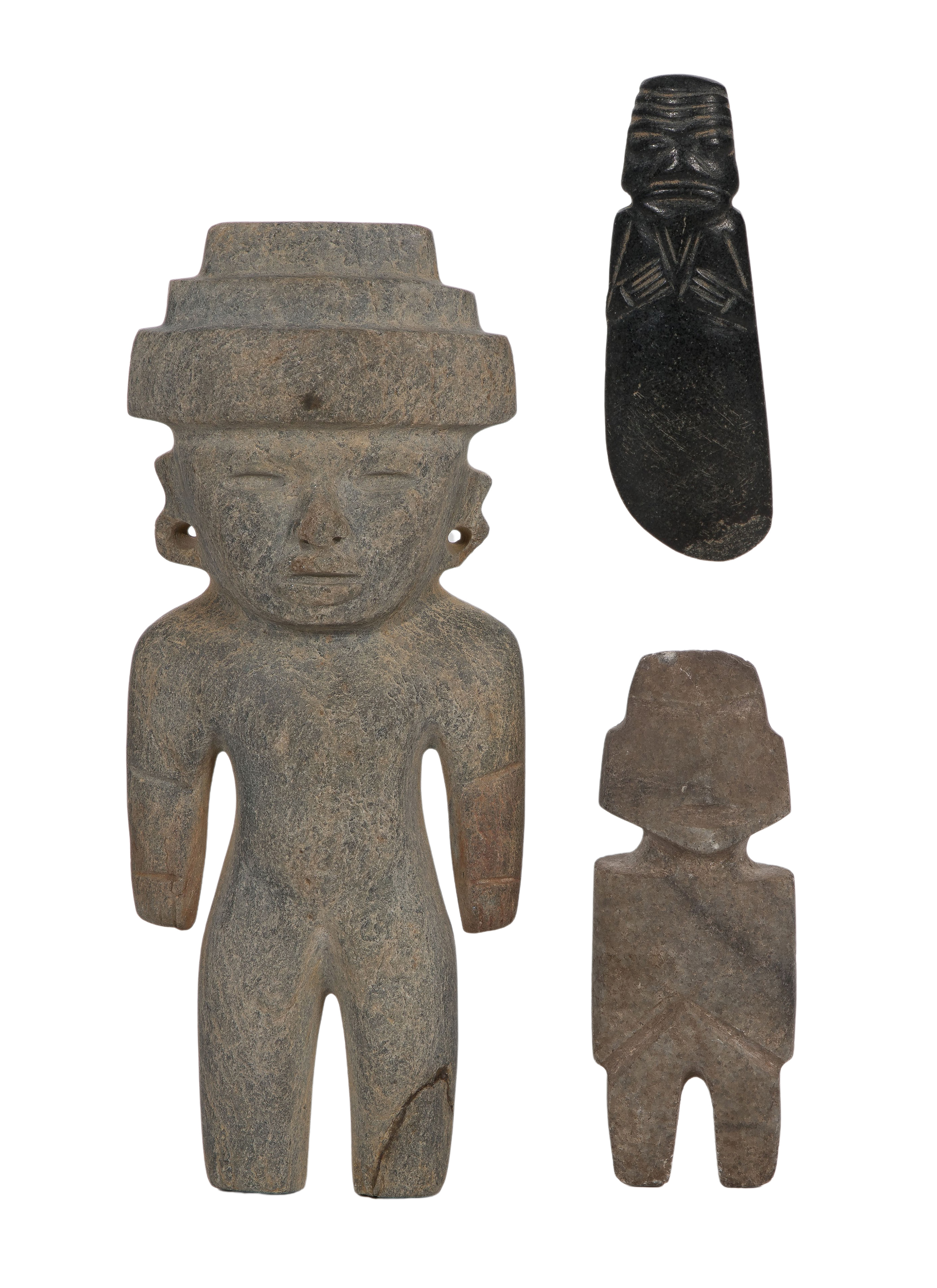 (3) items including a Teotihuacan figurine having ink numeric collection inventory mark and (2) axe gods including a Guerrero Mezcala style and a Costa Rican