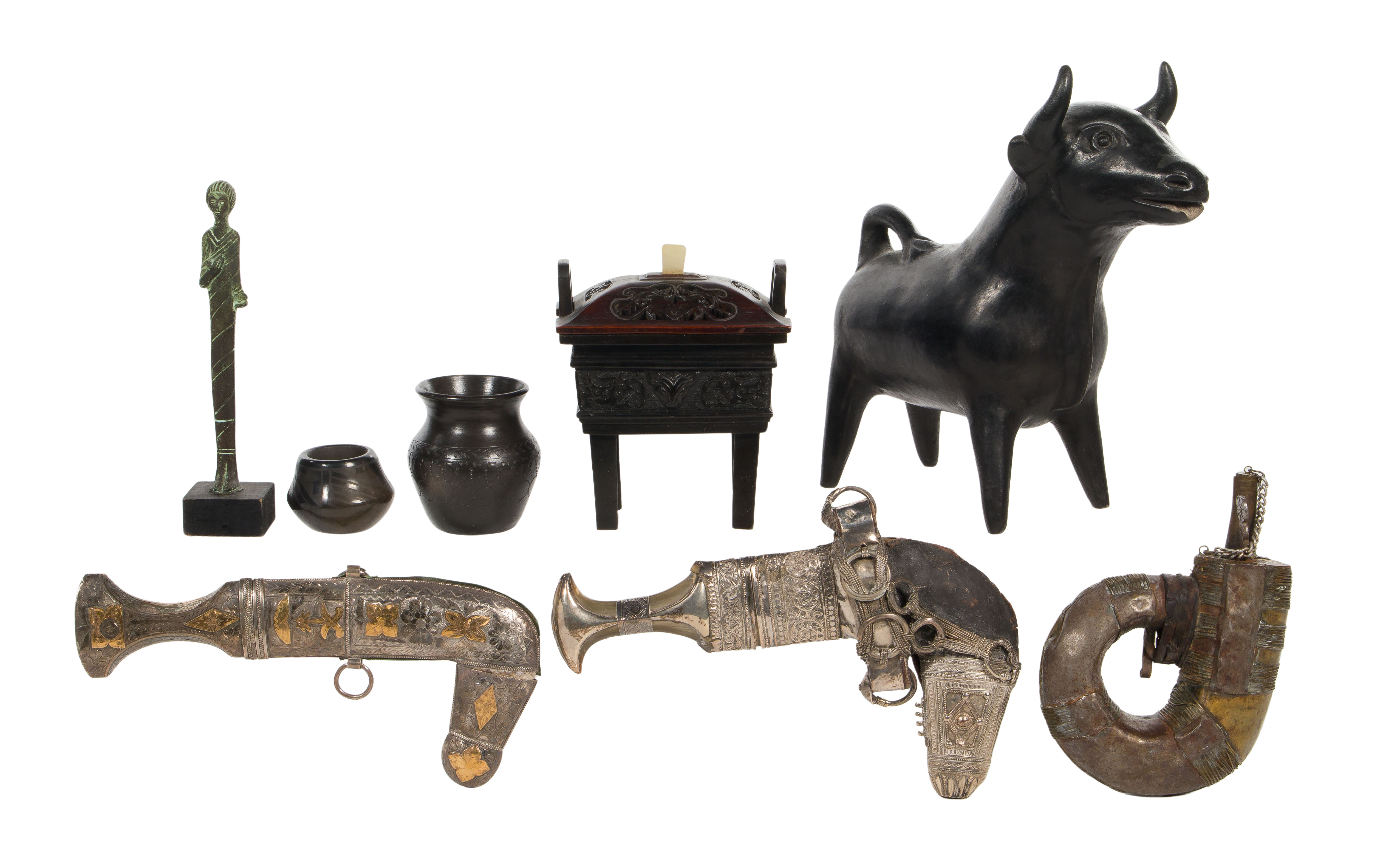 (8) items including a pencil signed ‘Blue Corn’ (Tewa, 1920-1999) San Ildefonso black on black jar, an incise signed Louise Bigmeat Maney (Cherokee, 20th century) black pottery jar, an Ottoman Yemeni copper alloy powder horn, (2) Arabic jambiya knives in white metal having metal mounted leather scabbards, an archaic style bronze figure on stand, a ceramic bull labeled ‘Made in Mexico’ and a Chinese style bronze incense burner having a pierced wood lid and white nephrite finial