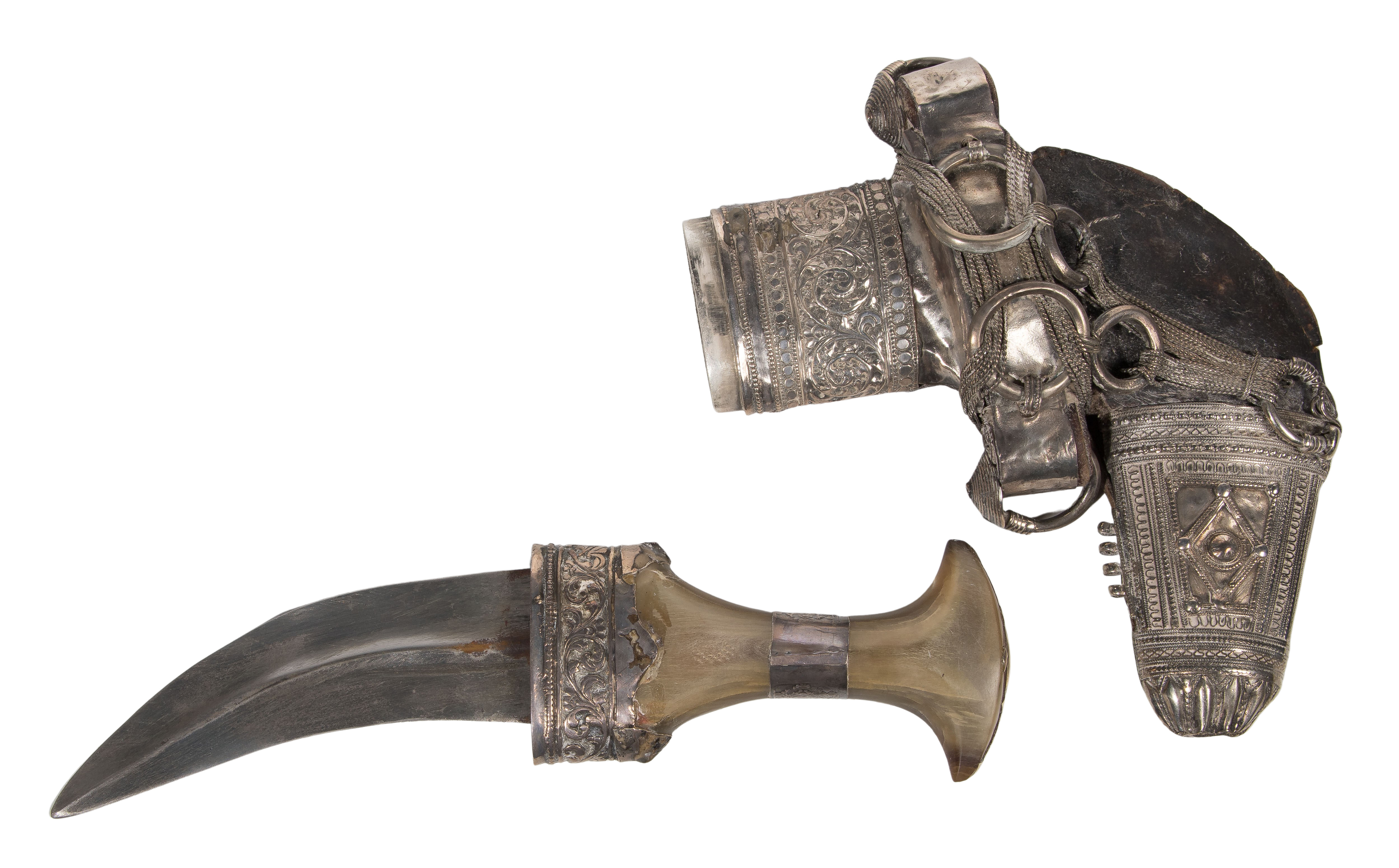 Condition: overall light wear consistent with normal use, a jambiya scabbard end loose