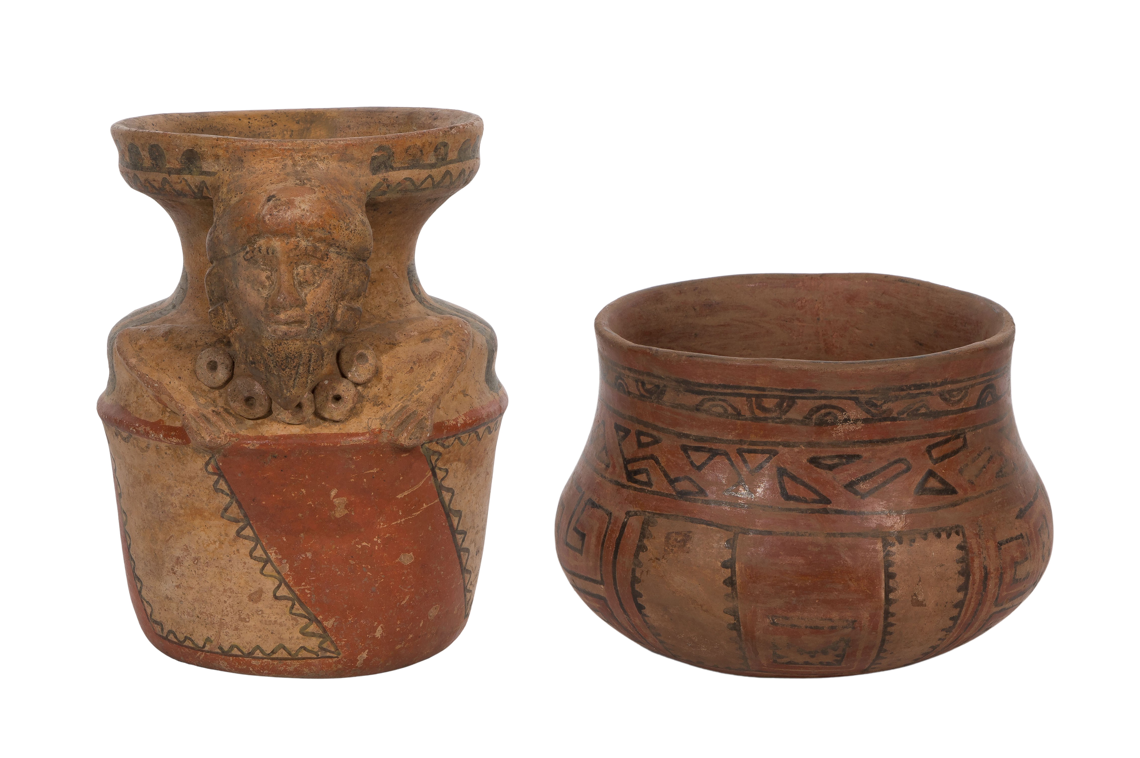 (2) items, both having black and red on cream ground decoration, including a jar / vase having an applied head and arms of a bearded figure and a wide-mouthed jar, both having ink numerical collection inventory marks