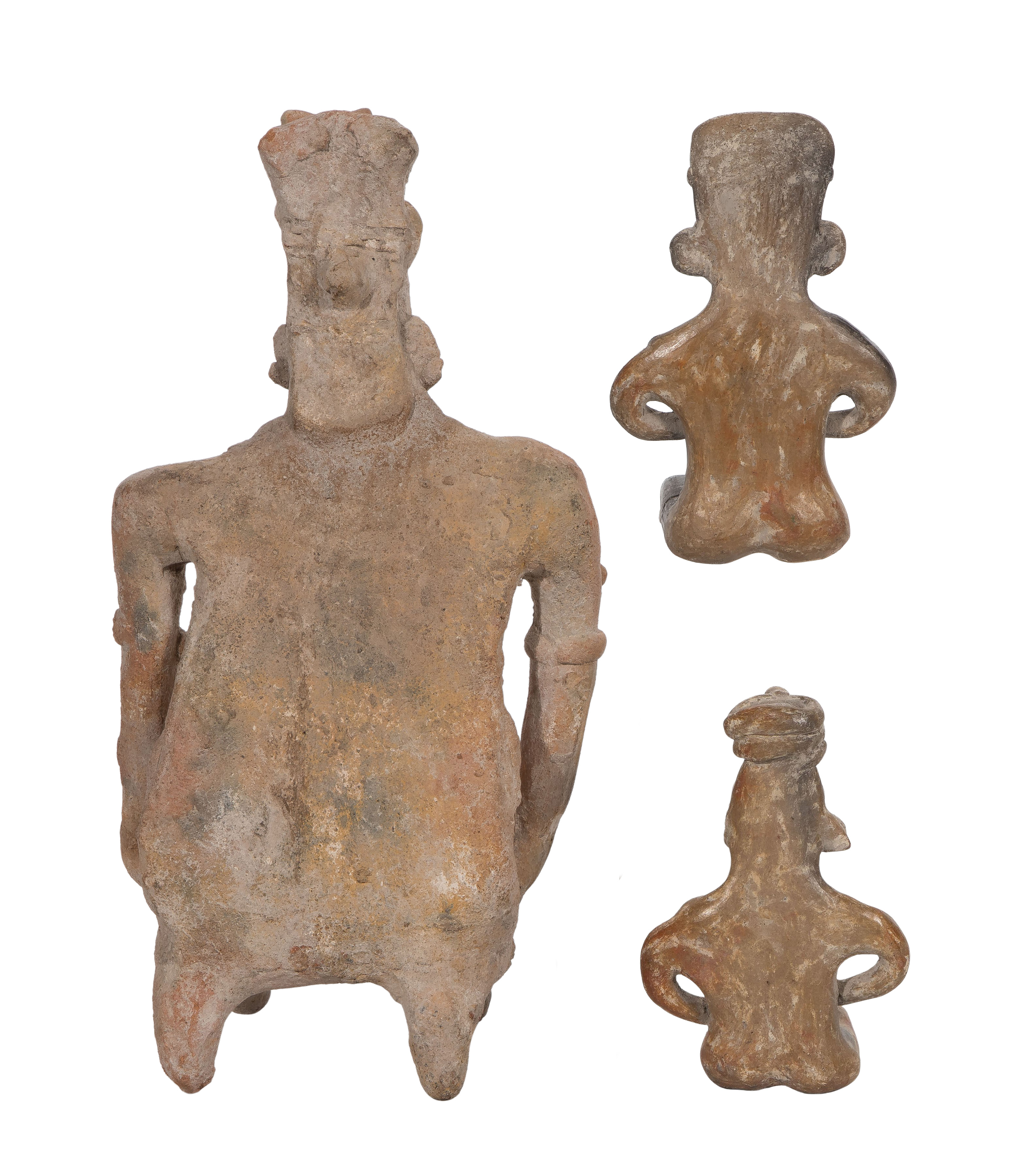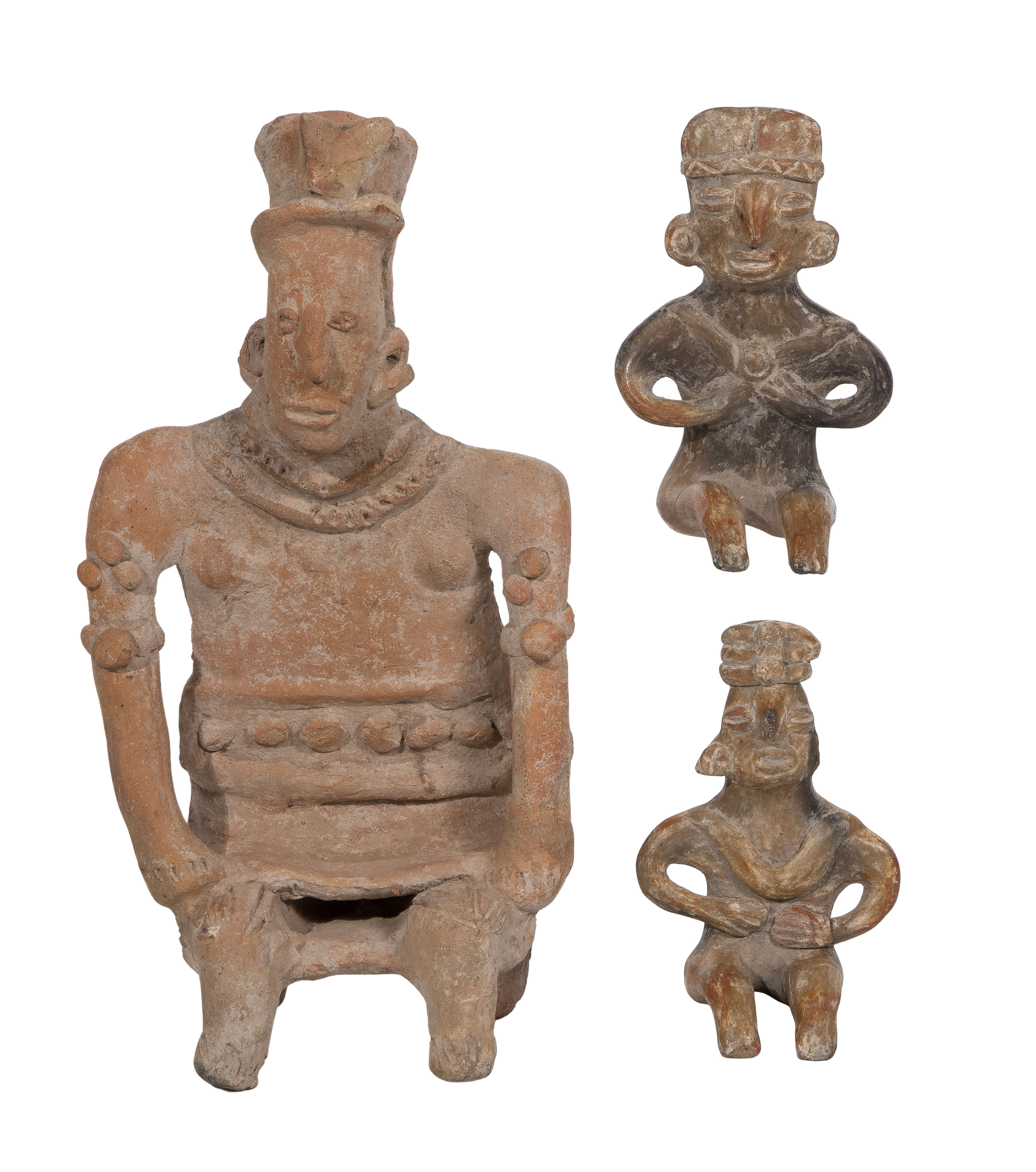 (3) total items including the Jalisco red ware (fired gray) seated figure having an ink numerical collection inventory mark underside; together with (2) burnished brown ware West Mexico style seated figurines