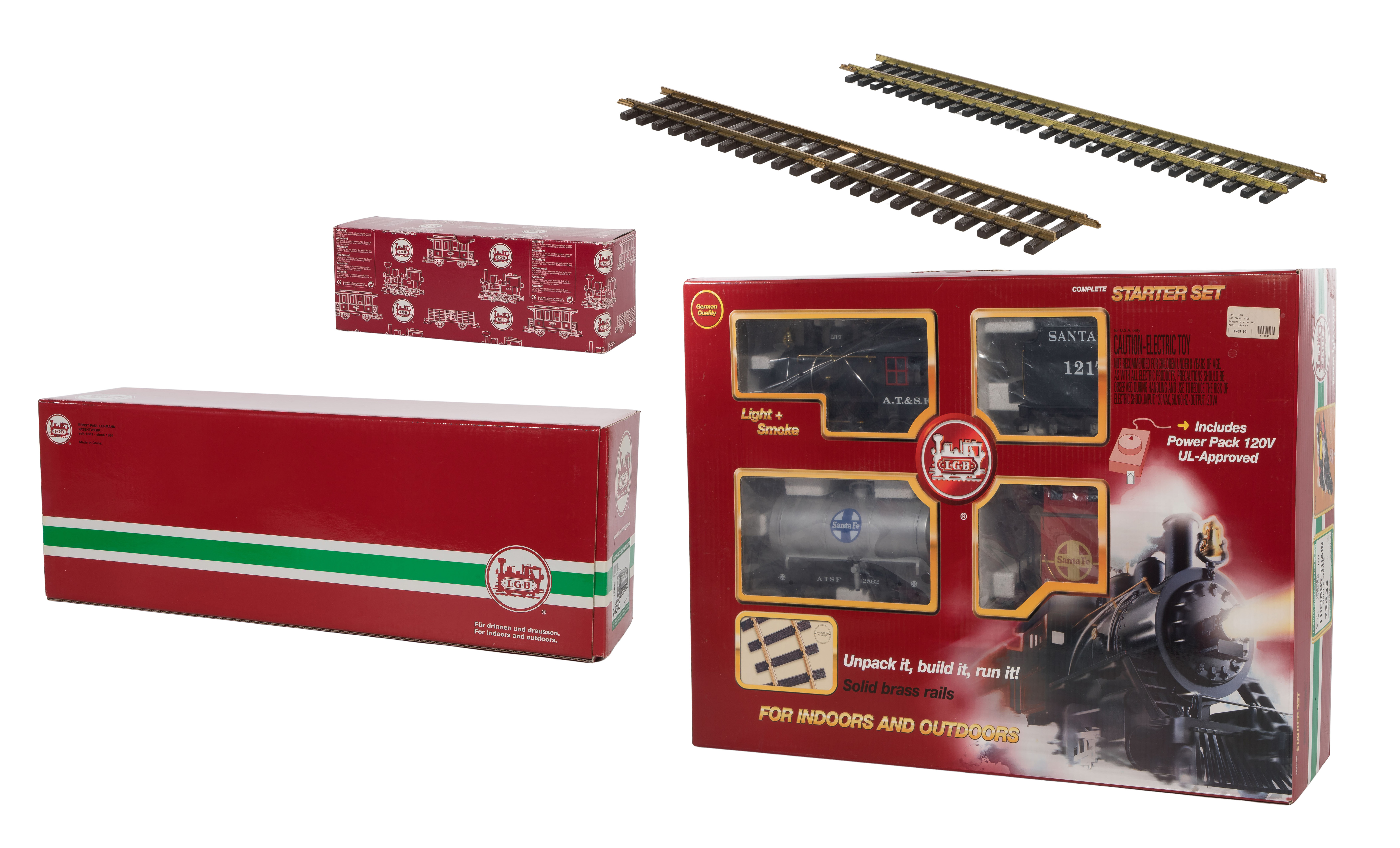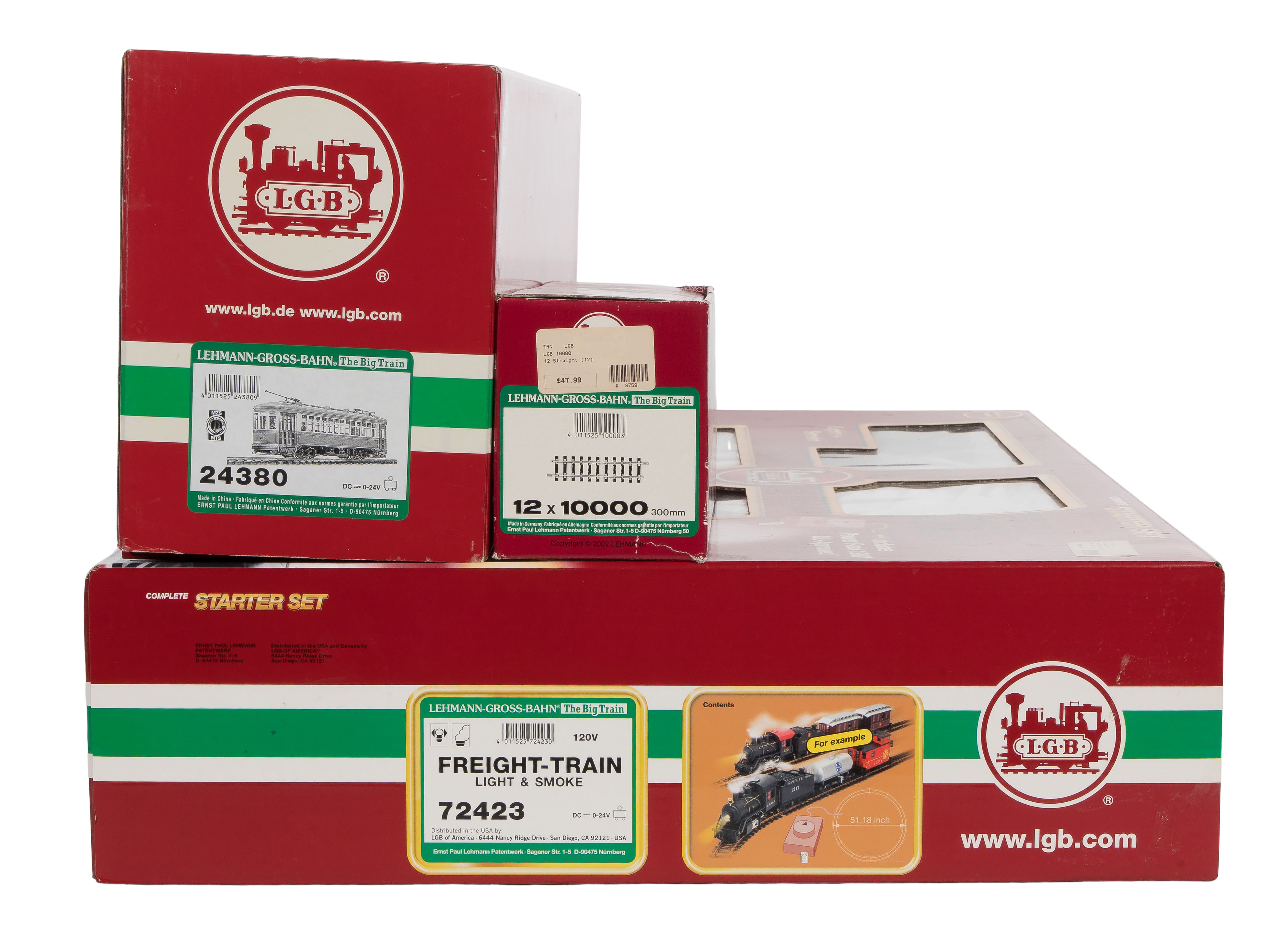 (5) total items including #24380 Chicago Street Car, a #72423 Santa Fe freight train starter set having light and smoke and a #10000 Straight Track 300 mm, all in original boxes; together with (2) extra pieces of straight track