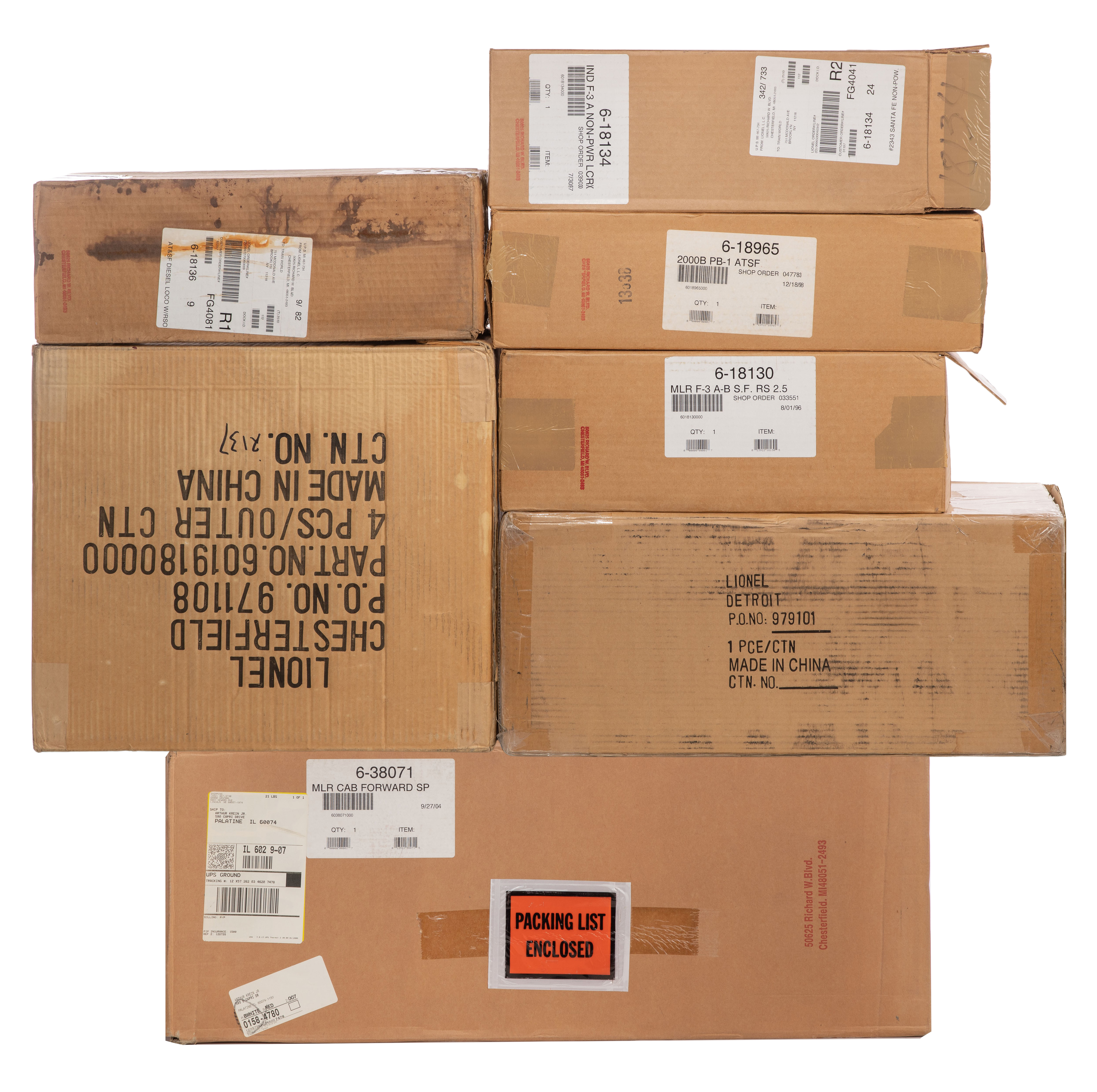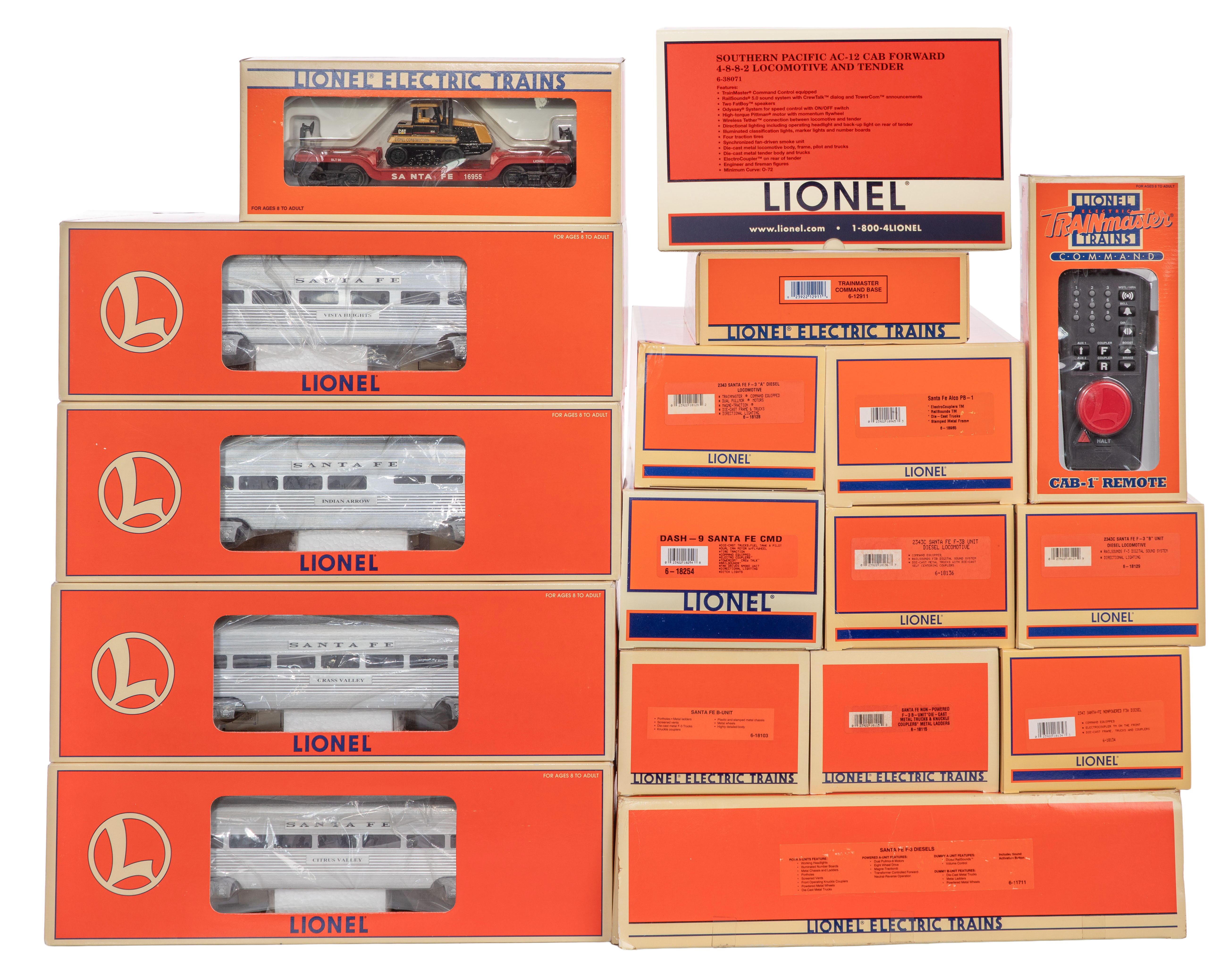 (17) items including a 6-38071 O-gauge Southern Pacific 4-8-8-2 AC-12 cab forward steam locomotive with tender, a 6-11711 O-gauge Santa Fe F-3 ABA diesel locomotive set as well as #18136, #18965, #18129, #18128, #181115, #12868, #12911, #19178, #18103, #18254 and #18955, all in original boxes some in shipping boxes