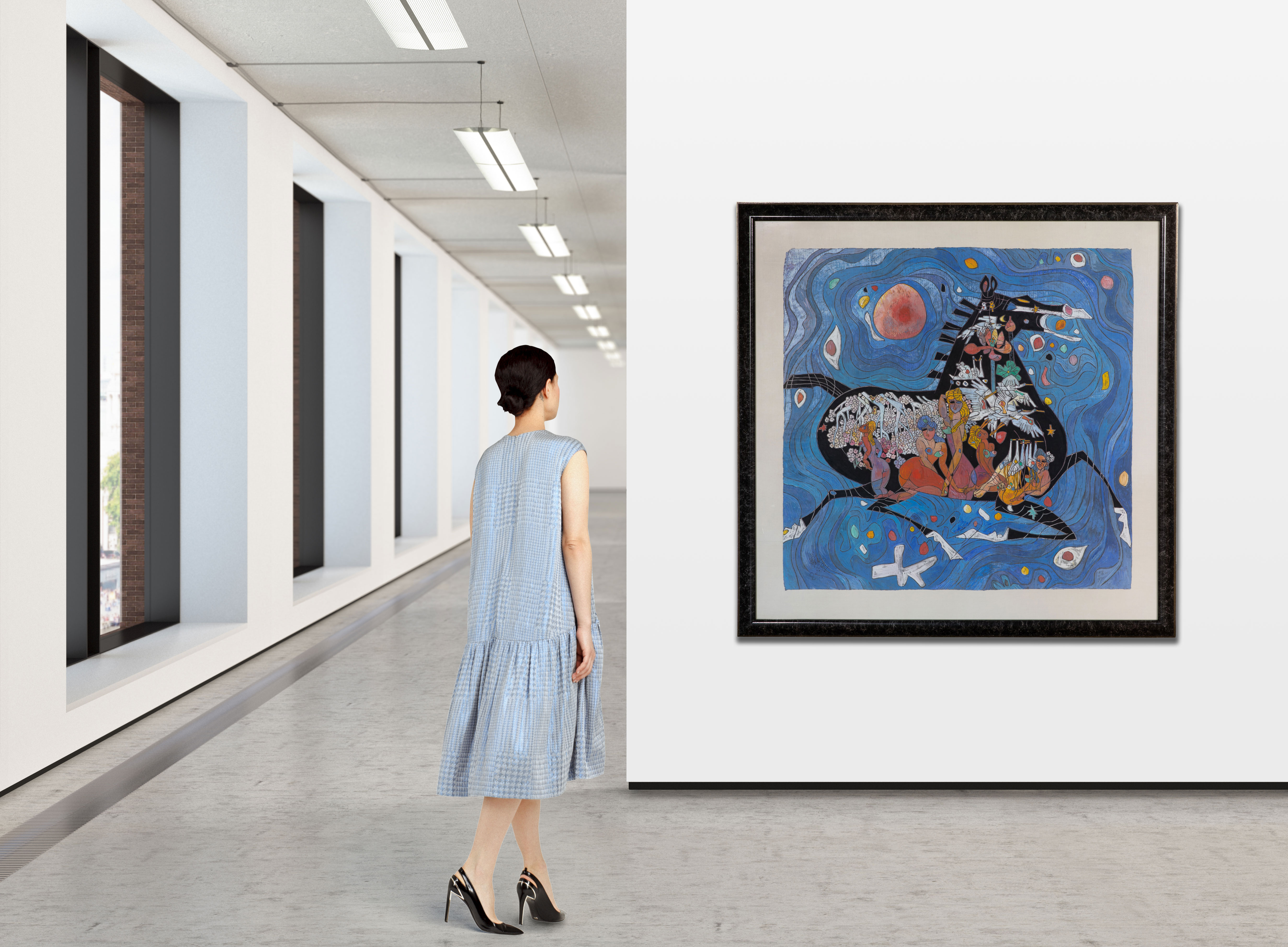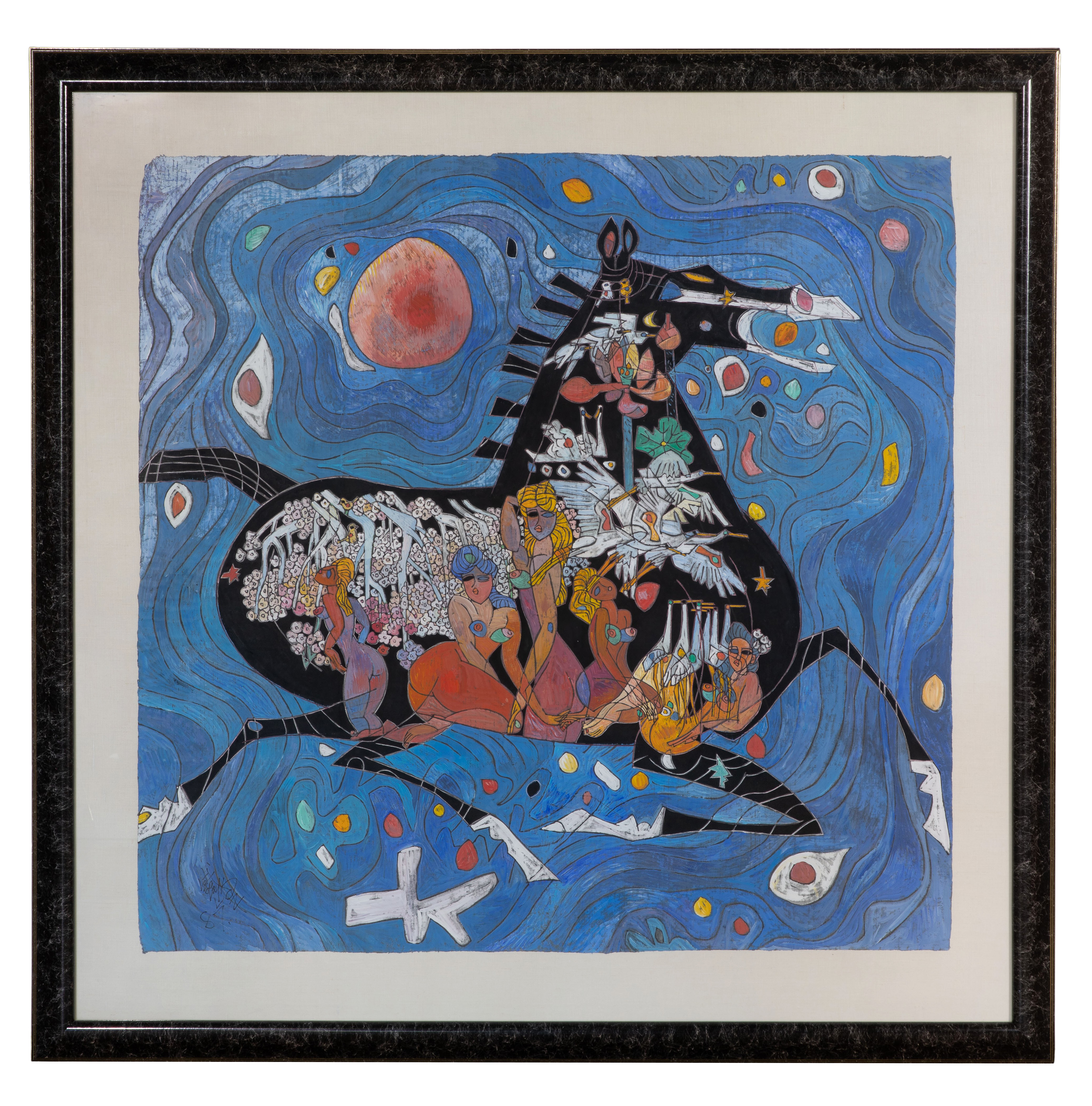 1987, signed, depicting abstract women inside a black horse, float mounted within a black lacquer wood frame
