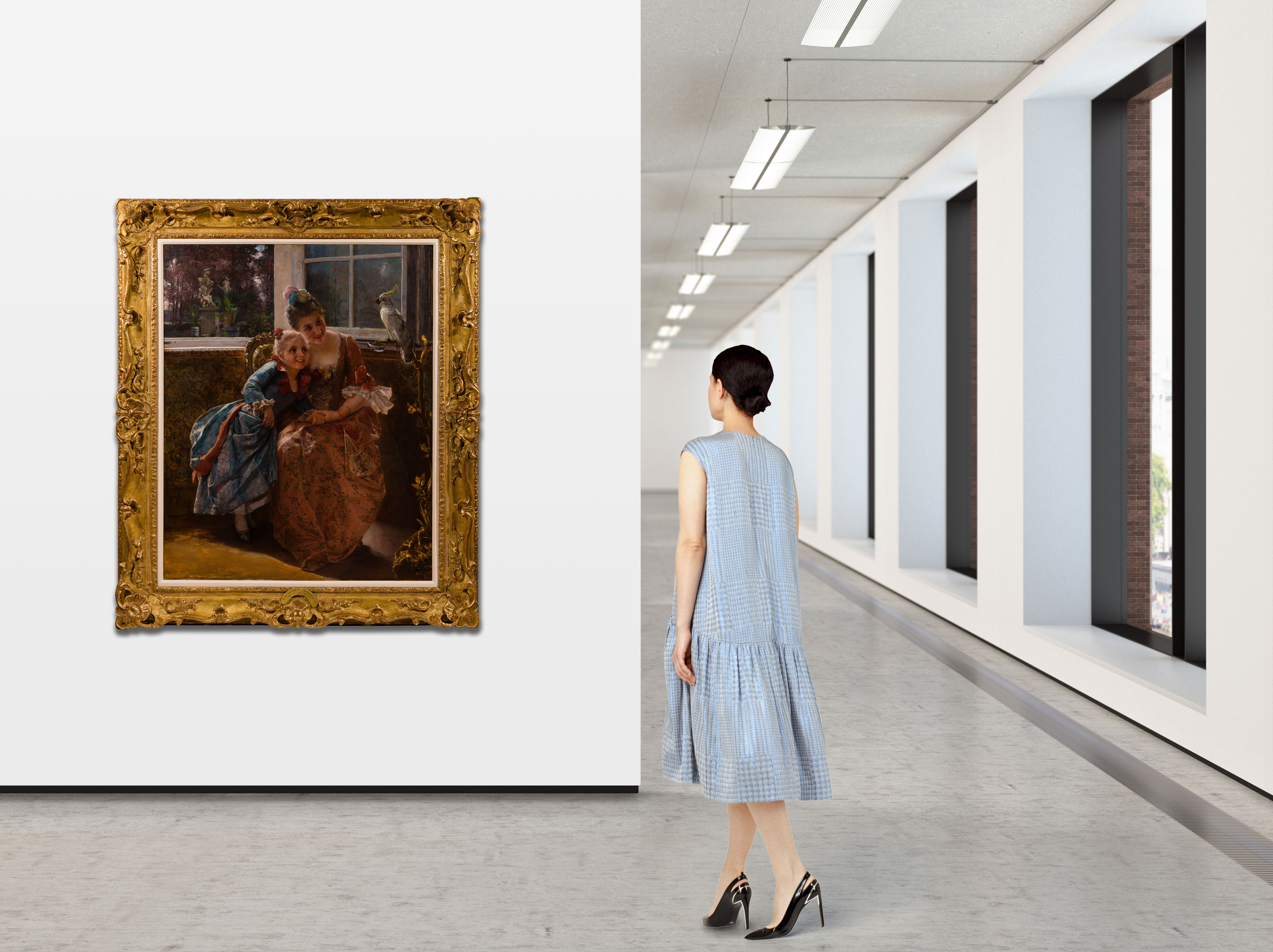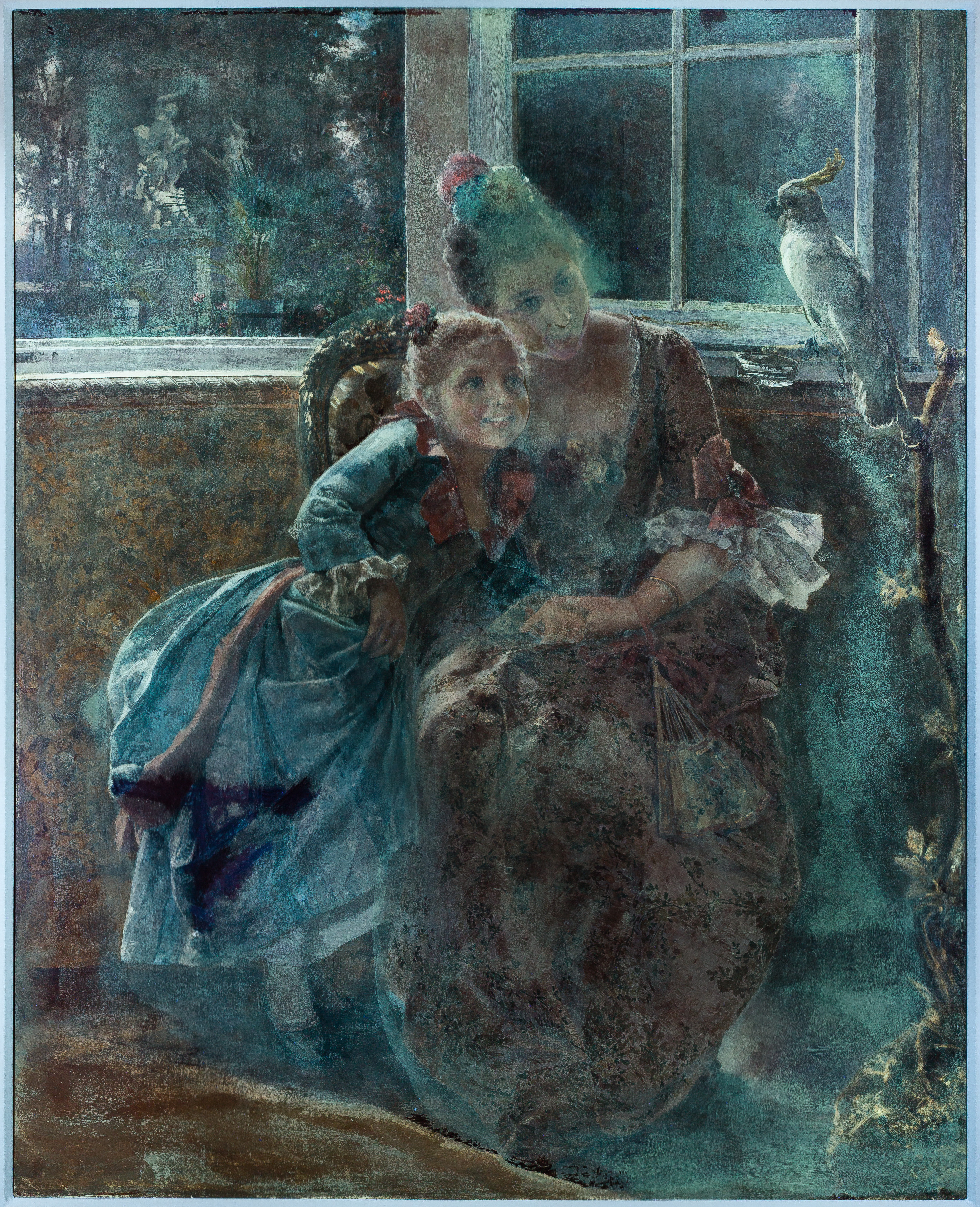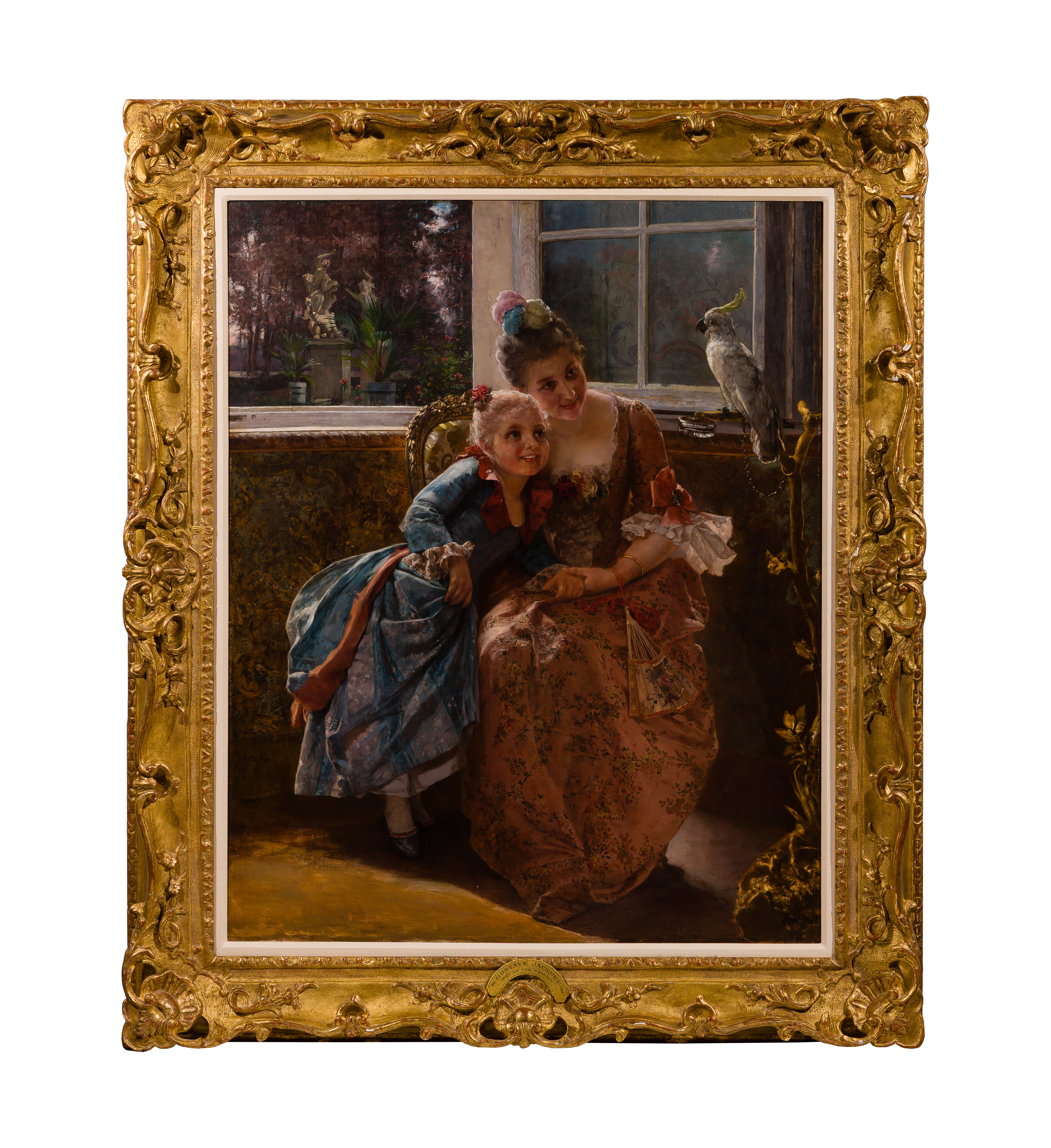 Undated, signed ‘Jacquet’ lower right, depicting a mother and daughter being amused by a cockatoo, in a linen lined gold-tone gesso on carved wood frame, accompanied by a Galt Gallery, Ft. Lauderdale, Florida 1975 invoice and a conservator’s checklist and invoice for work done on the canvas
