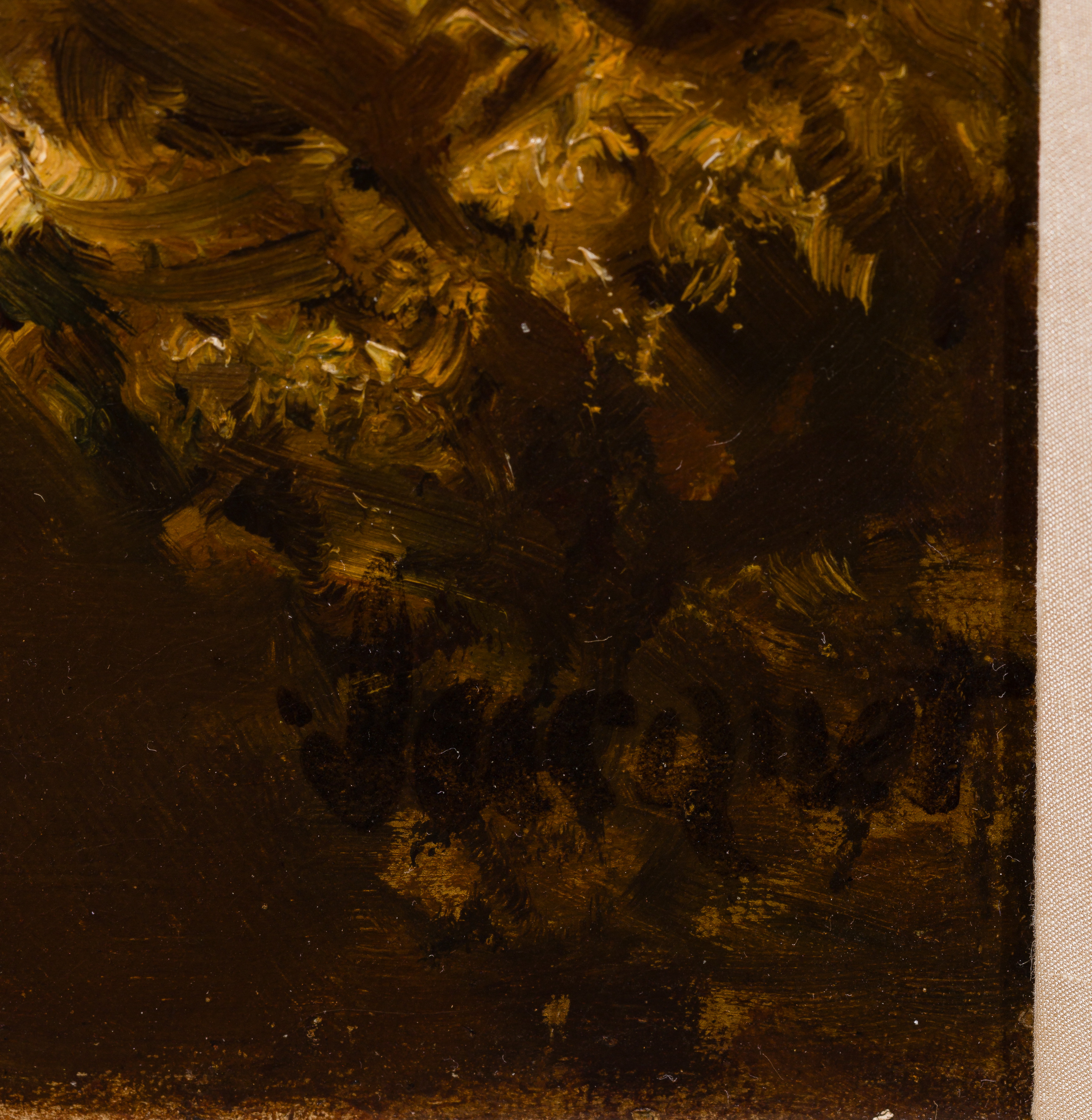 Condition: inspected under UV light, repairs and restorations including repaired tear, strip lining of canvas, inpainting, cleaning, revarnishing (UVS varnish) and vapor treatment, frame having light to moderate wear