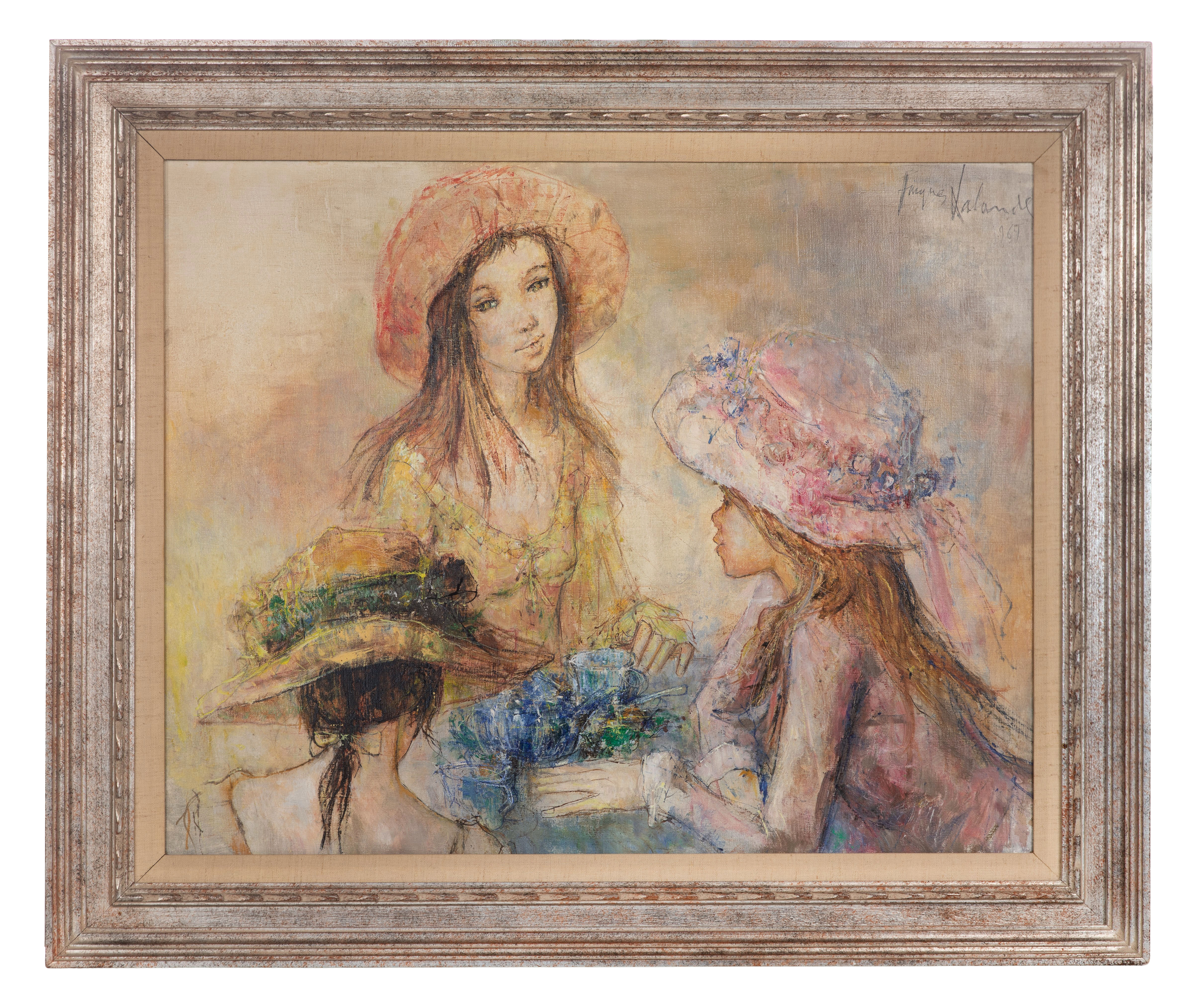 1969, signed, depicting three young women in hats, in a silver-tone wood frame