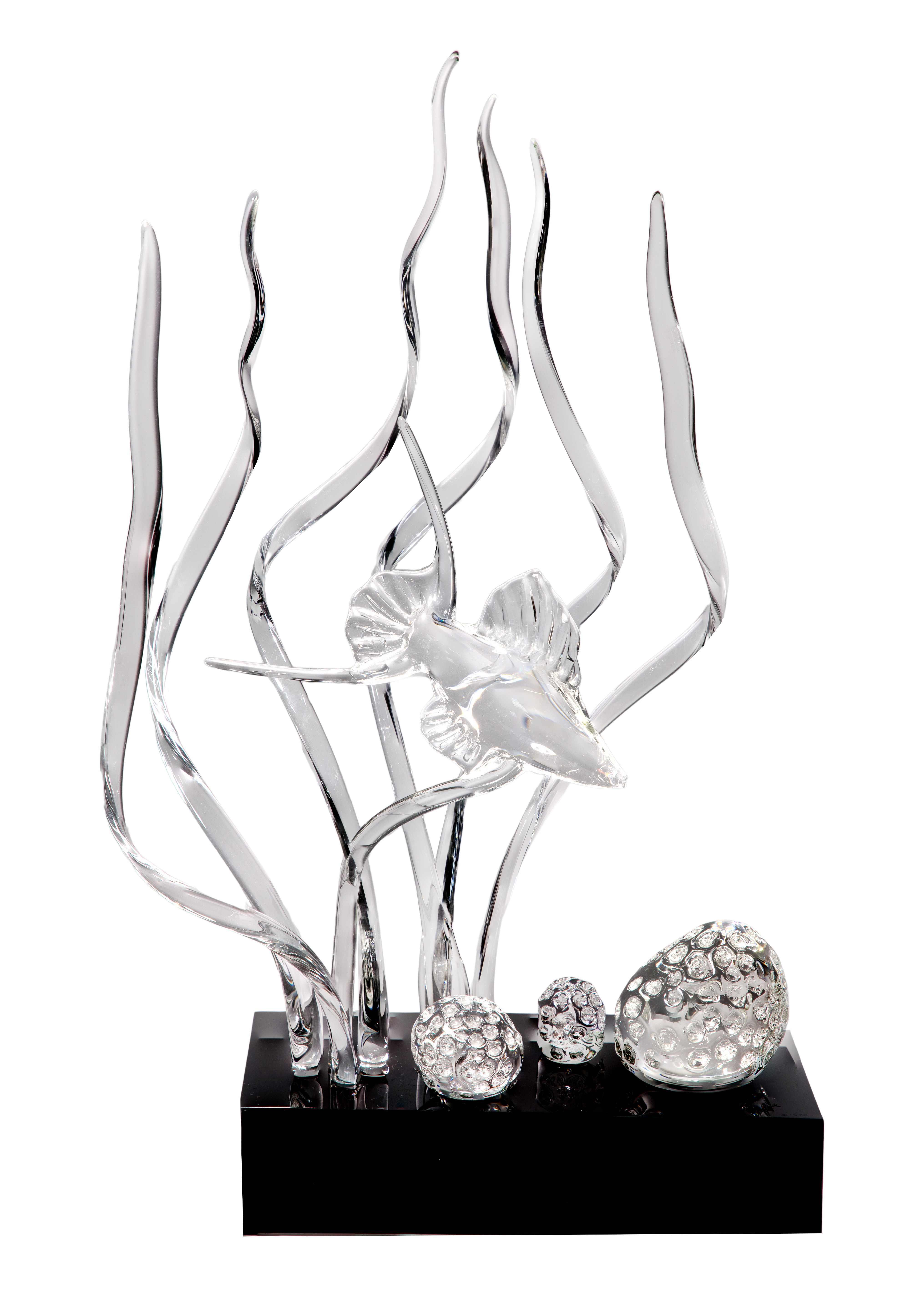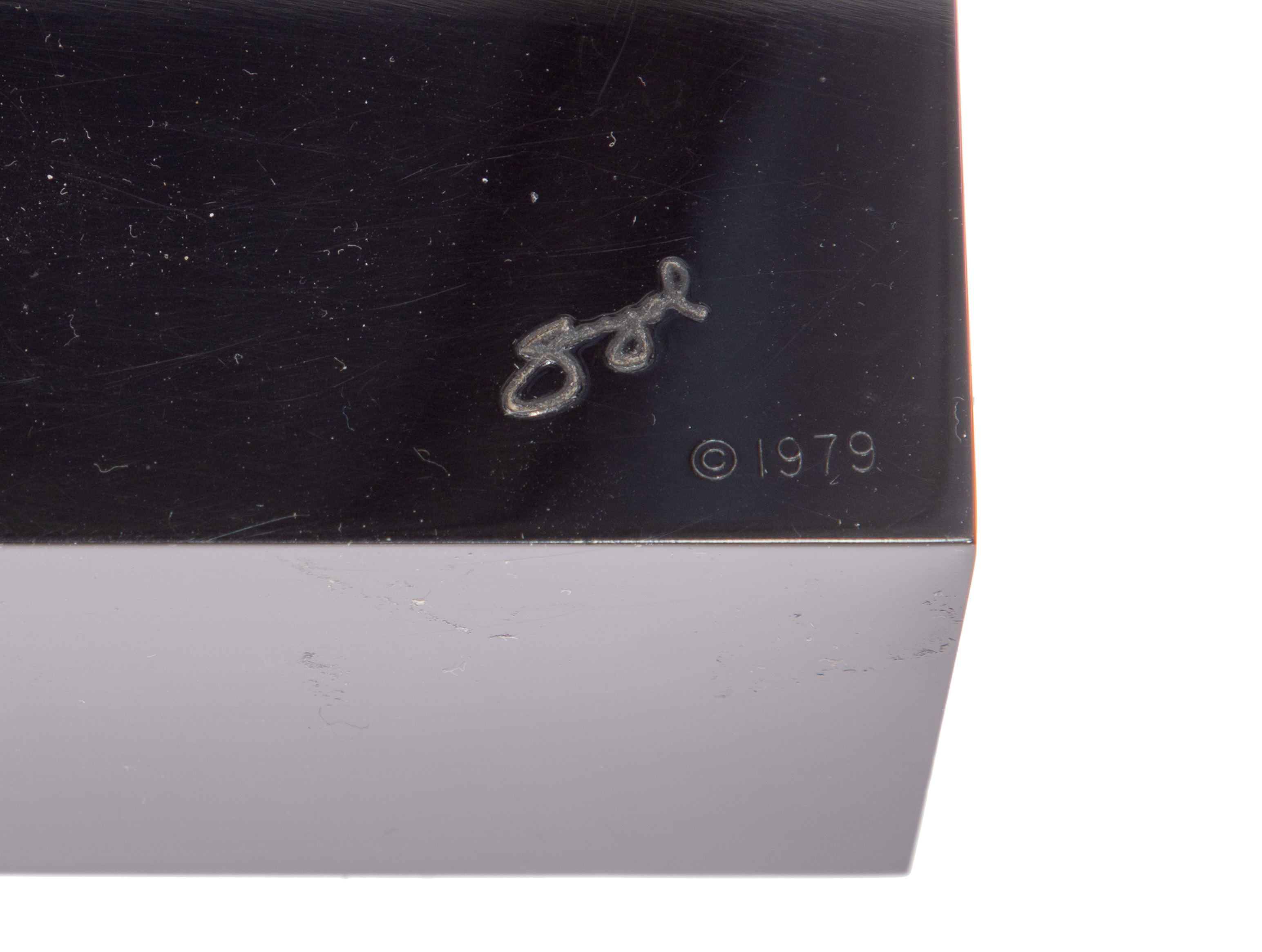 1979, engraved signature and stamped date on base, depiction of a tropical fish, sponges and seaweed, having ten individual removable pieces of clear crystal fitting into holes in a polished black acrylic base, an artist bio sheet and sheet illustrating placement of pieces in base (each piece of seaweed numbered in ink at ends) in a Whitt / Krauss, San Diego, California envelope