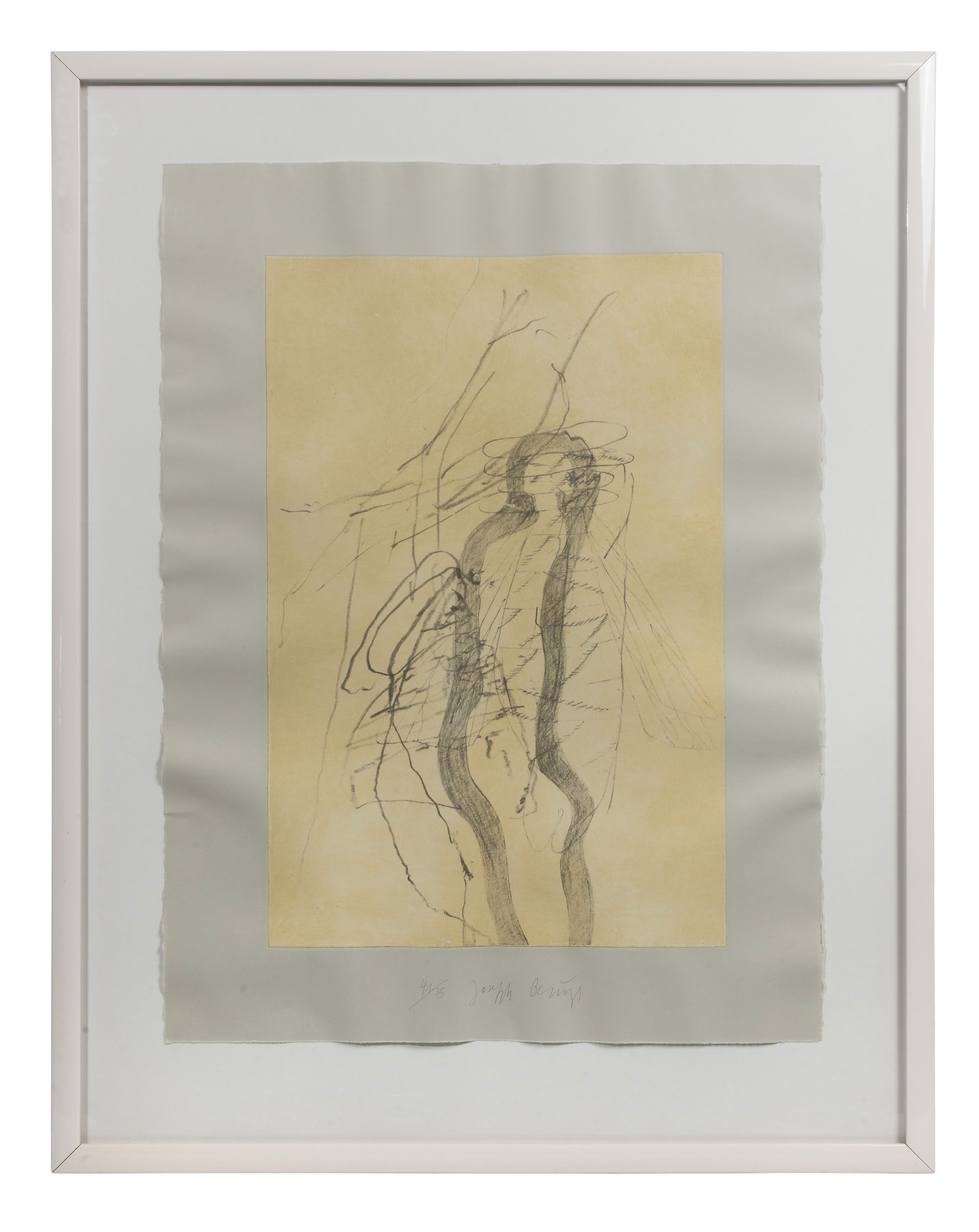 Undated, pencil signed, #41/75 lower gray margin, abstract figural lithographic image on yellow aquatint ground (within plate line) on gray wove paper float mounted behind glass in a painted wood frame