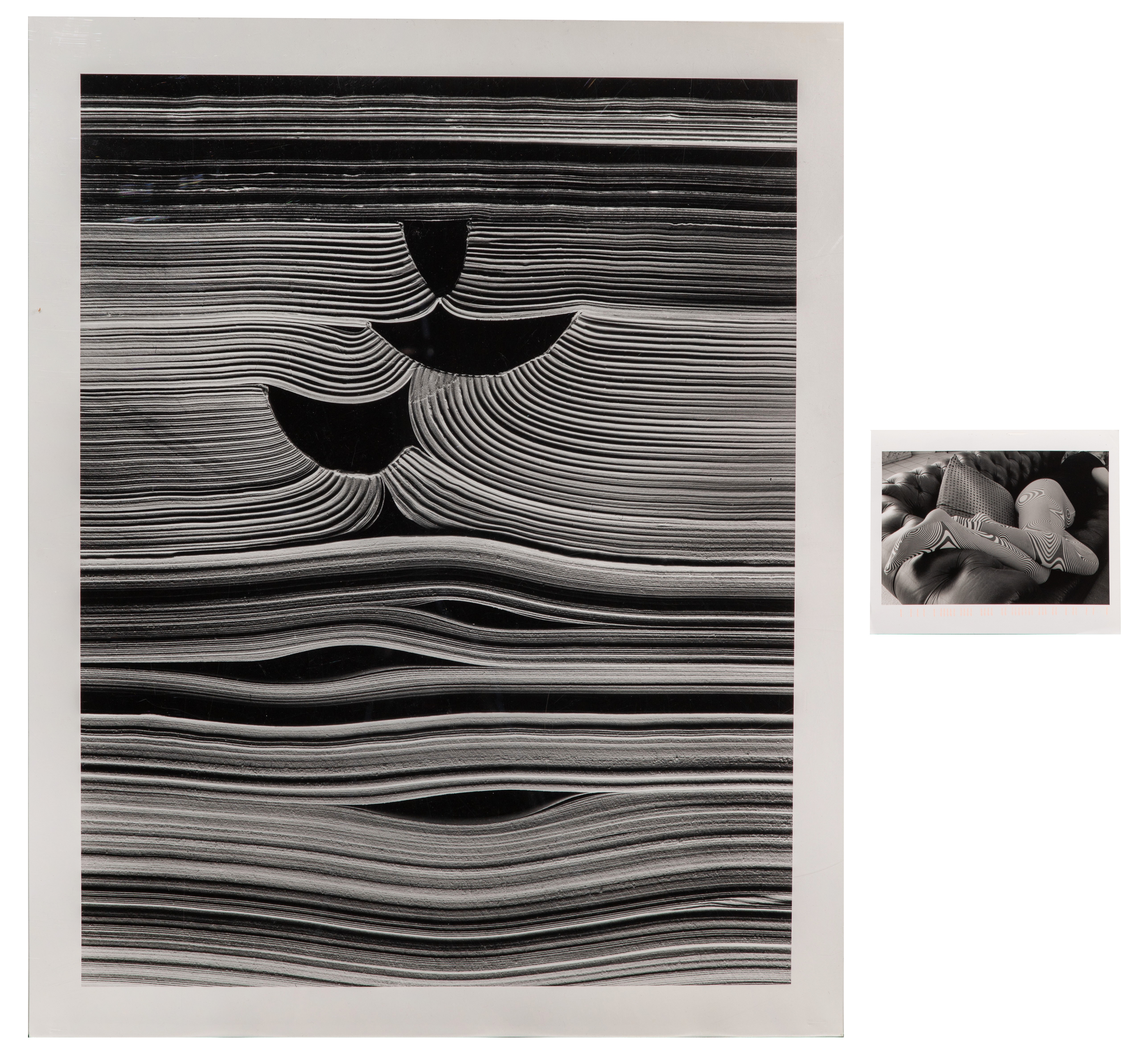 (2) items including ‘Chicago (88-4-235)’ pencil signed, #7/25 verso, 2001 printing of the 1988 image of stacked open books and a real photo greeting card from the photographer, ink signed and dated 2007, depicting a woman in Op Art tights, both unframed