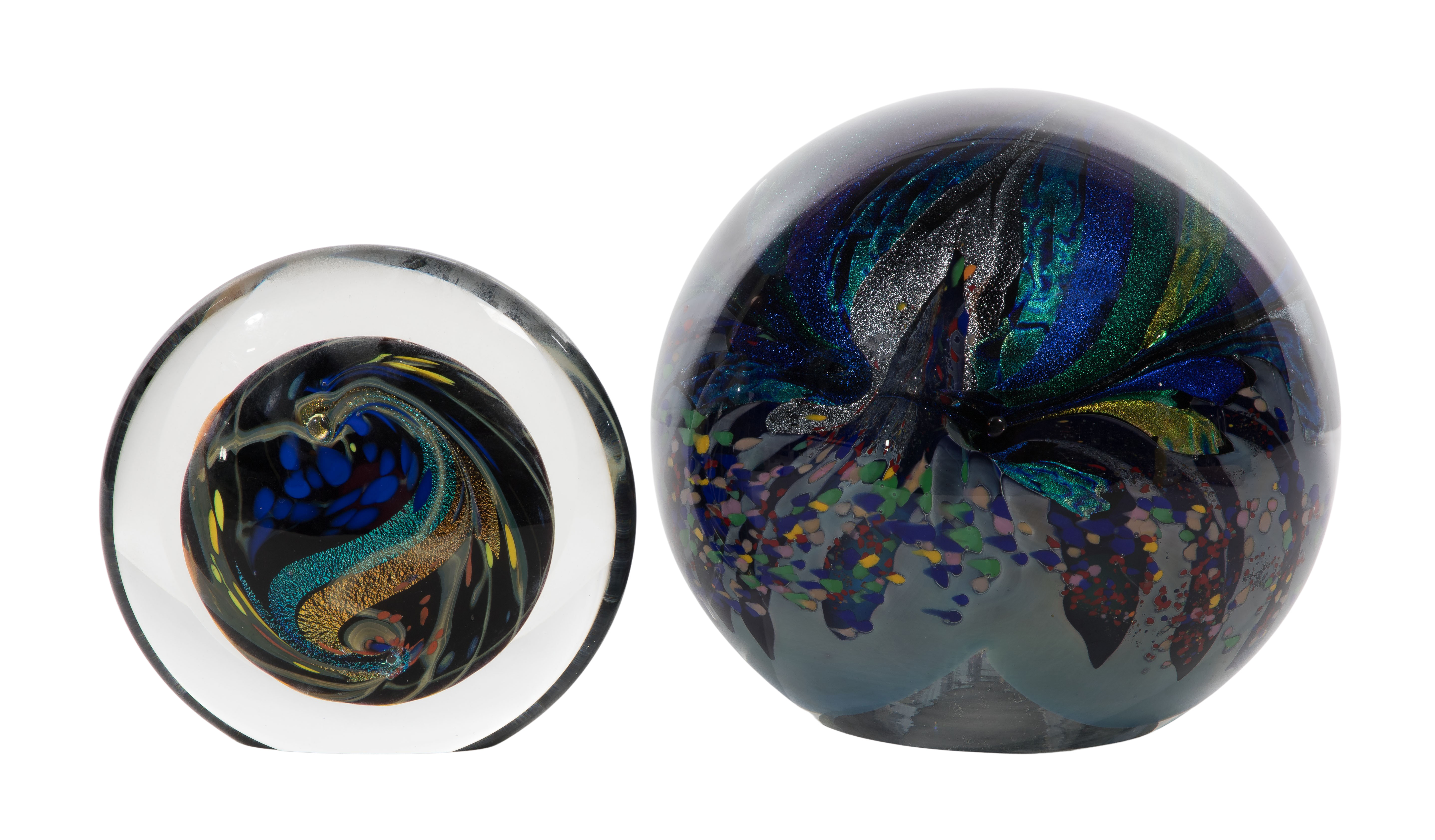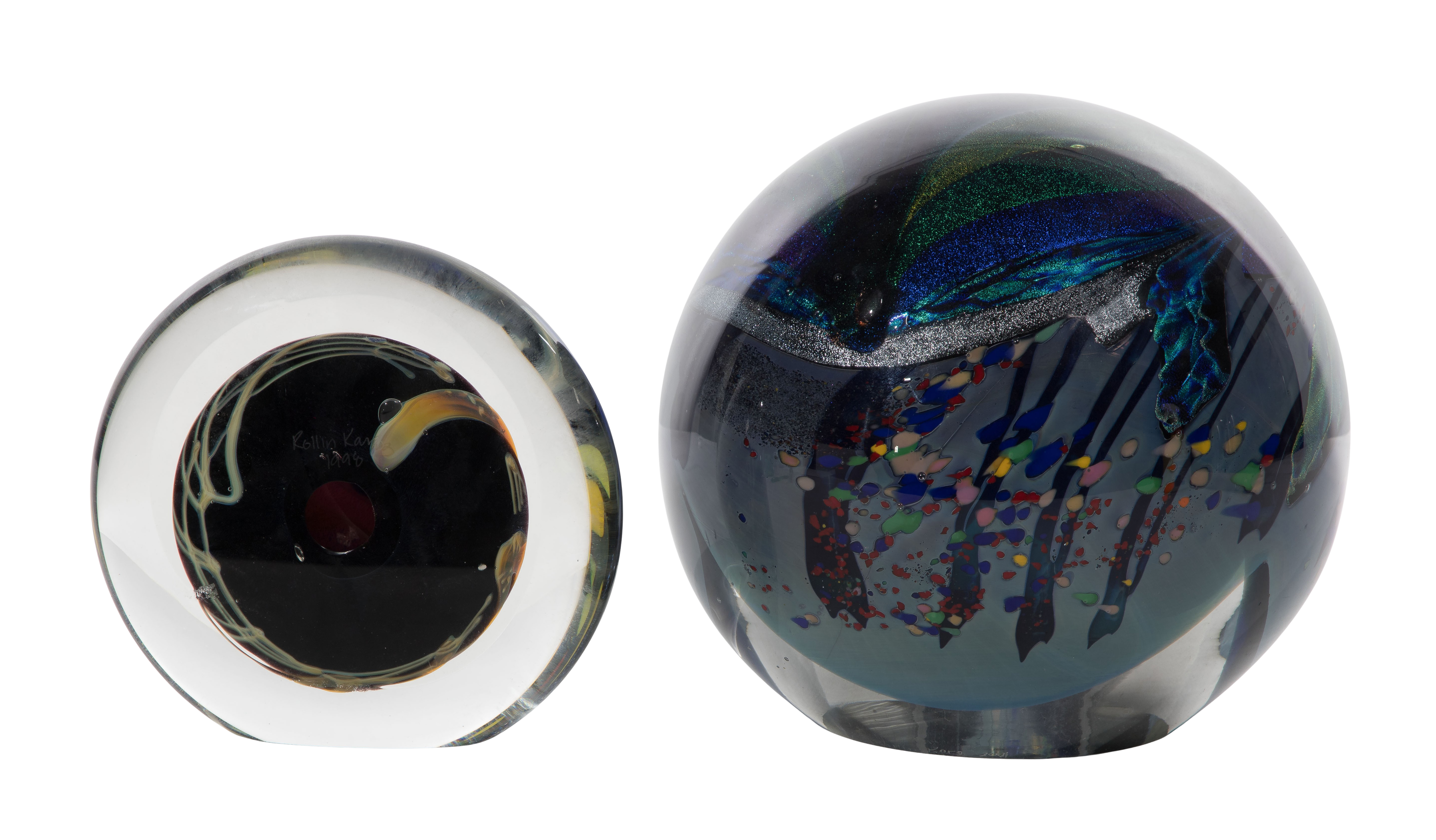 (2) items, blown glass having multi-color dichroic and trailed elements cased in clear, including an unsigned spherical having its undersides ground flat and polished, leaving an opening underside and a flattened round having its back and undersides ground flat, an opening on back and an engraved signature and dated 1998 underside