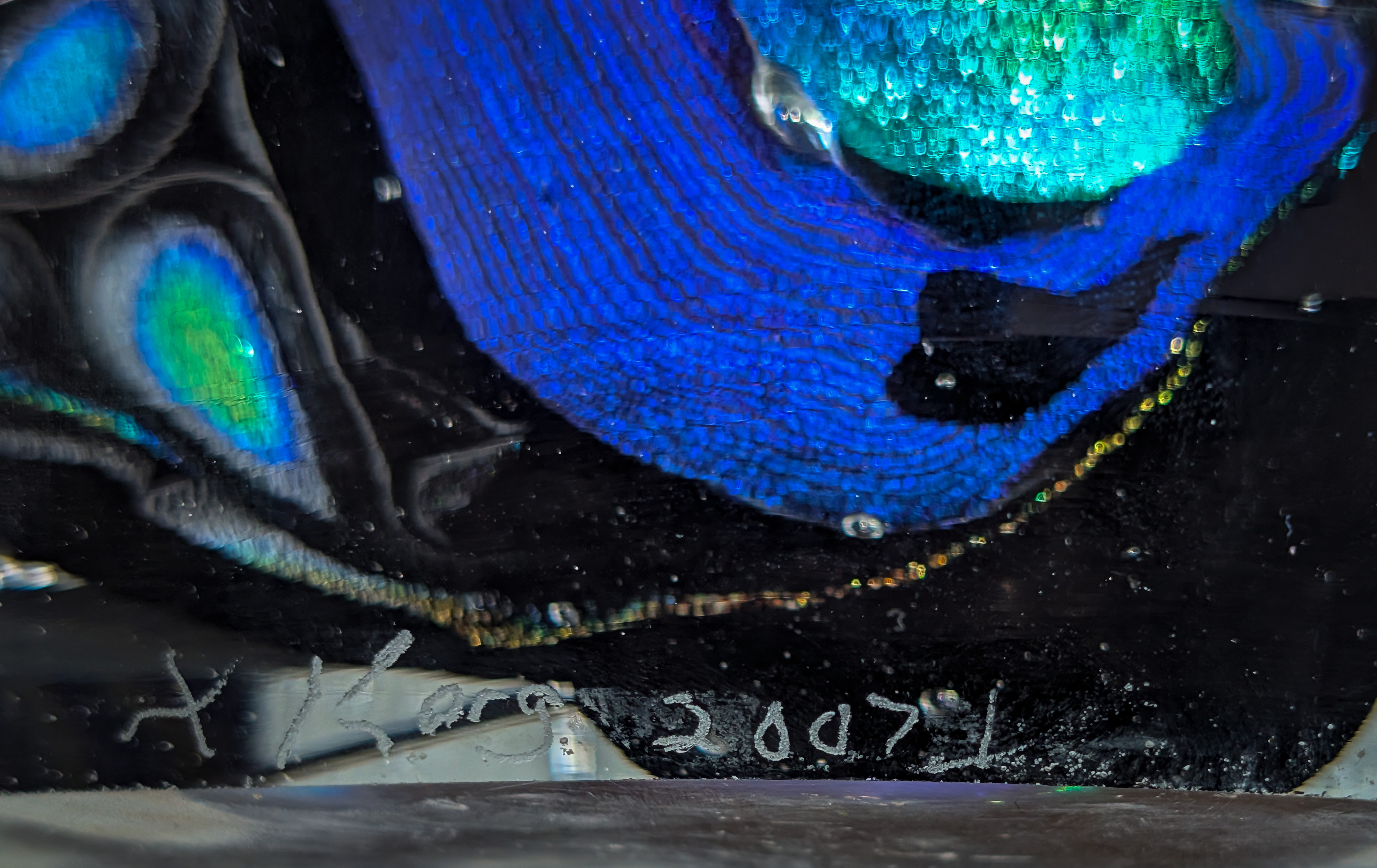 Undated, engraved signature, elongated form having spiral ribbon and dichroic decorative inclusions