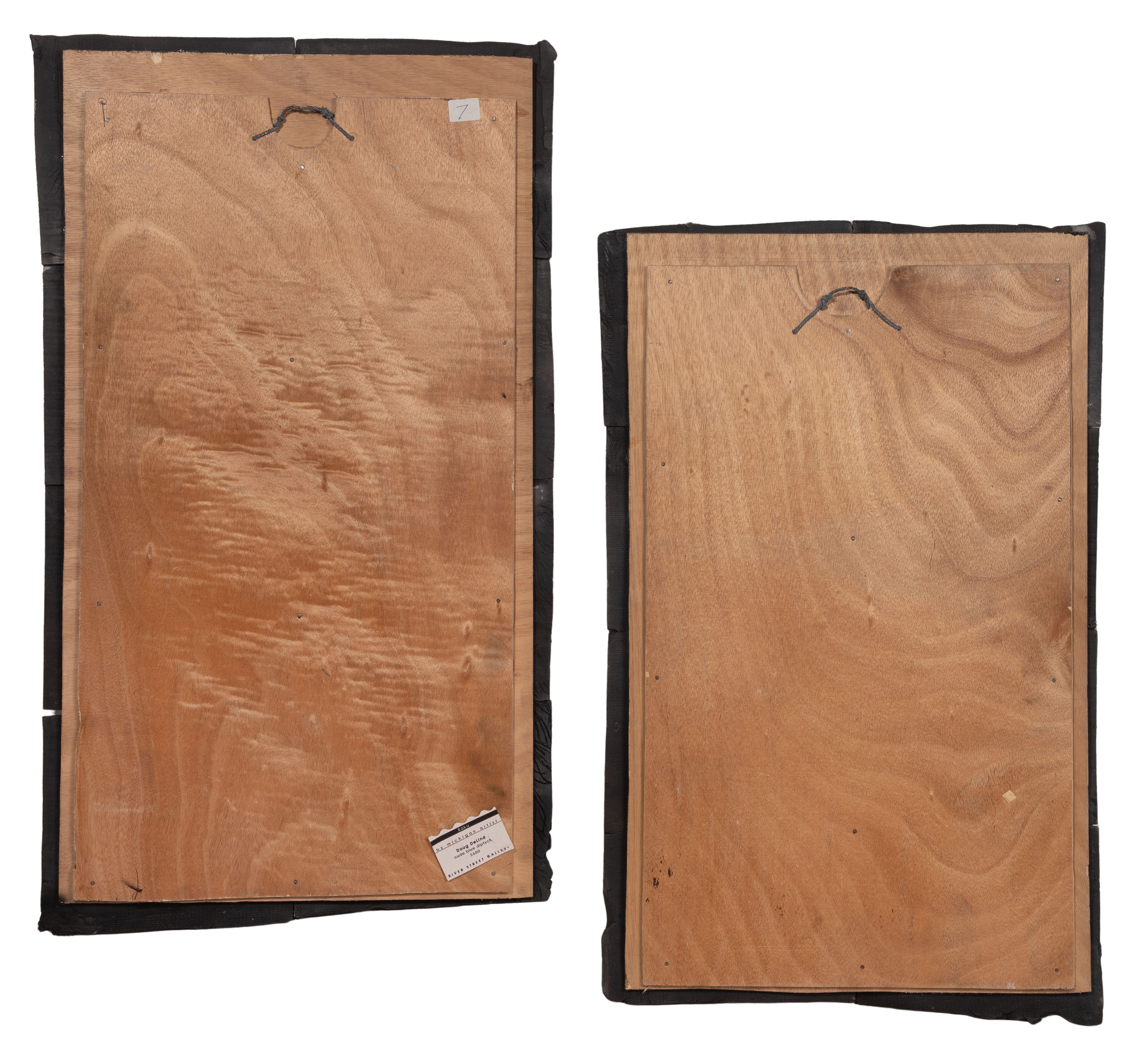 Raku pottery tiles mounted to wood backing, two pieces forming a diptych, signed lower left and having a River Street Gallery label verso