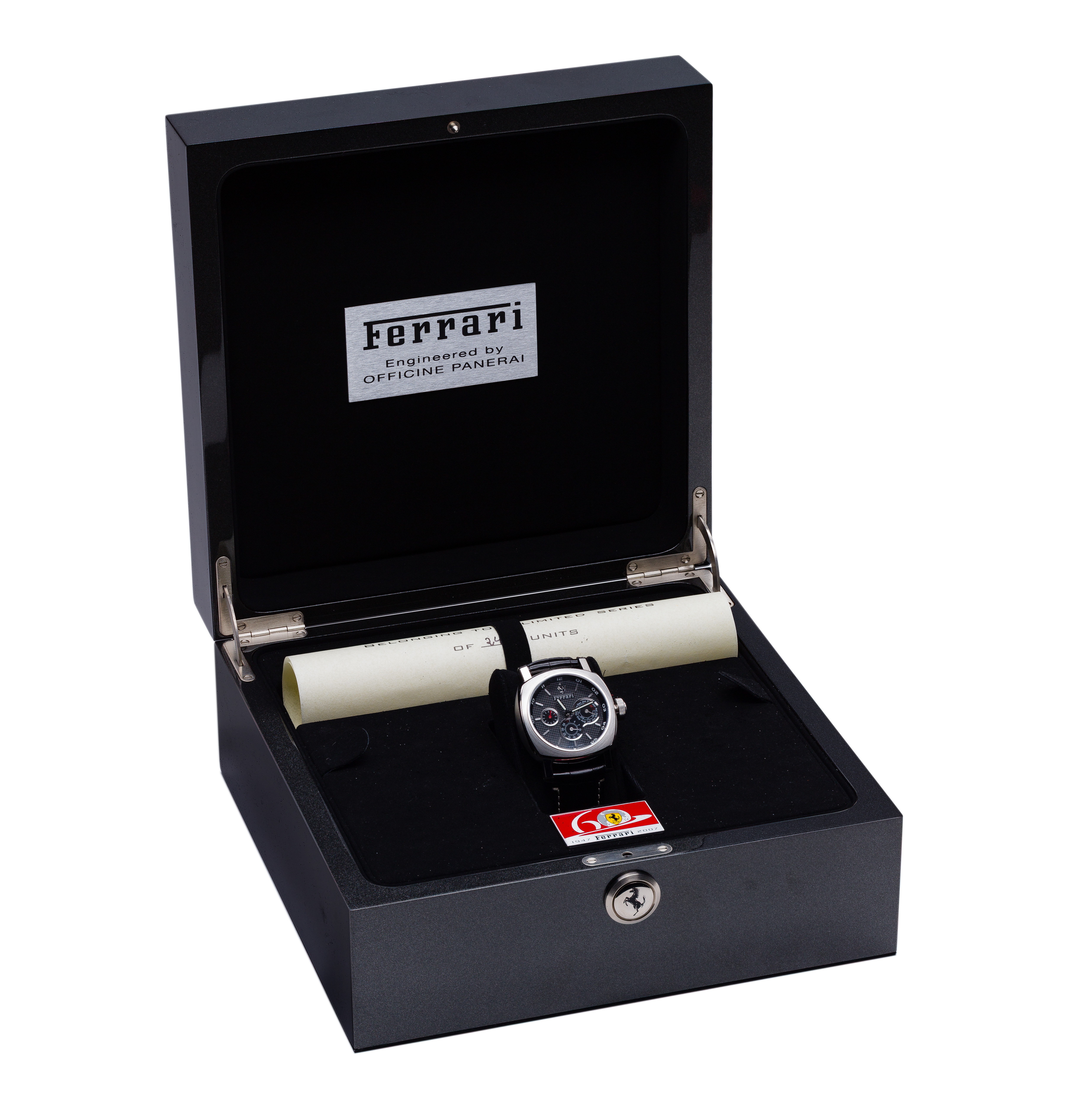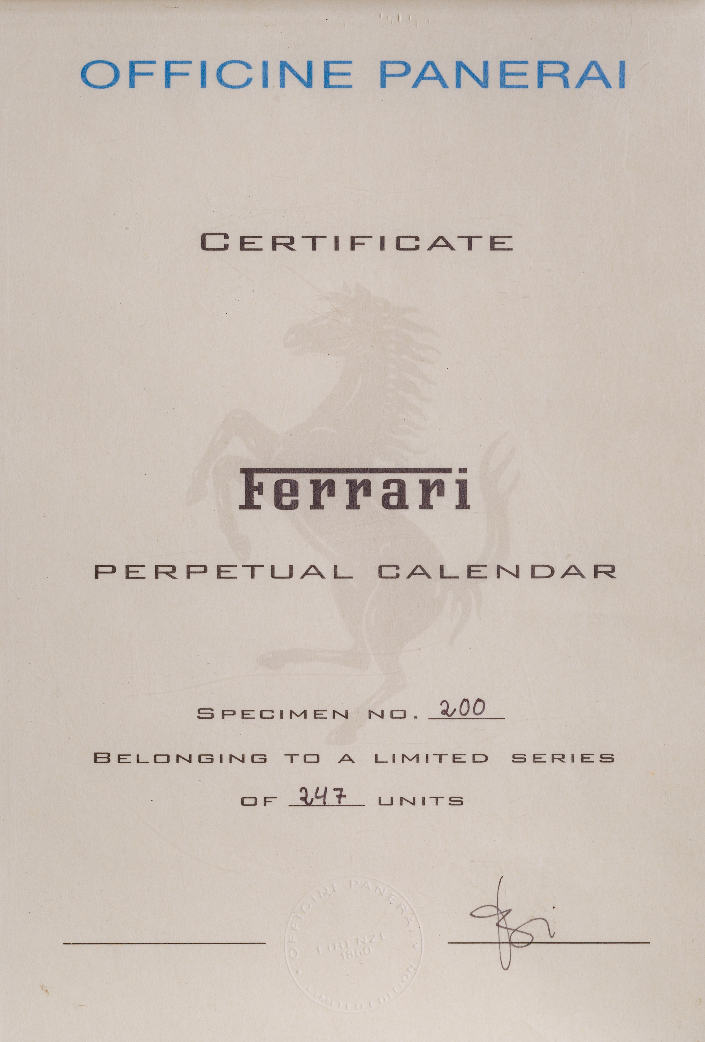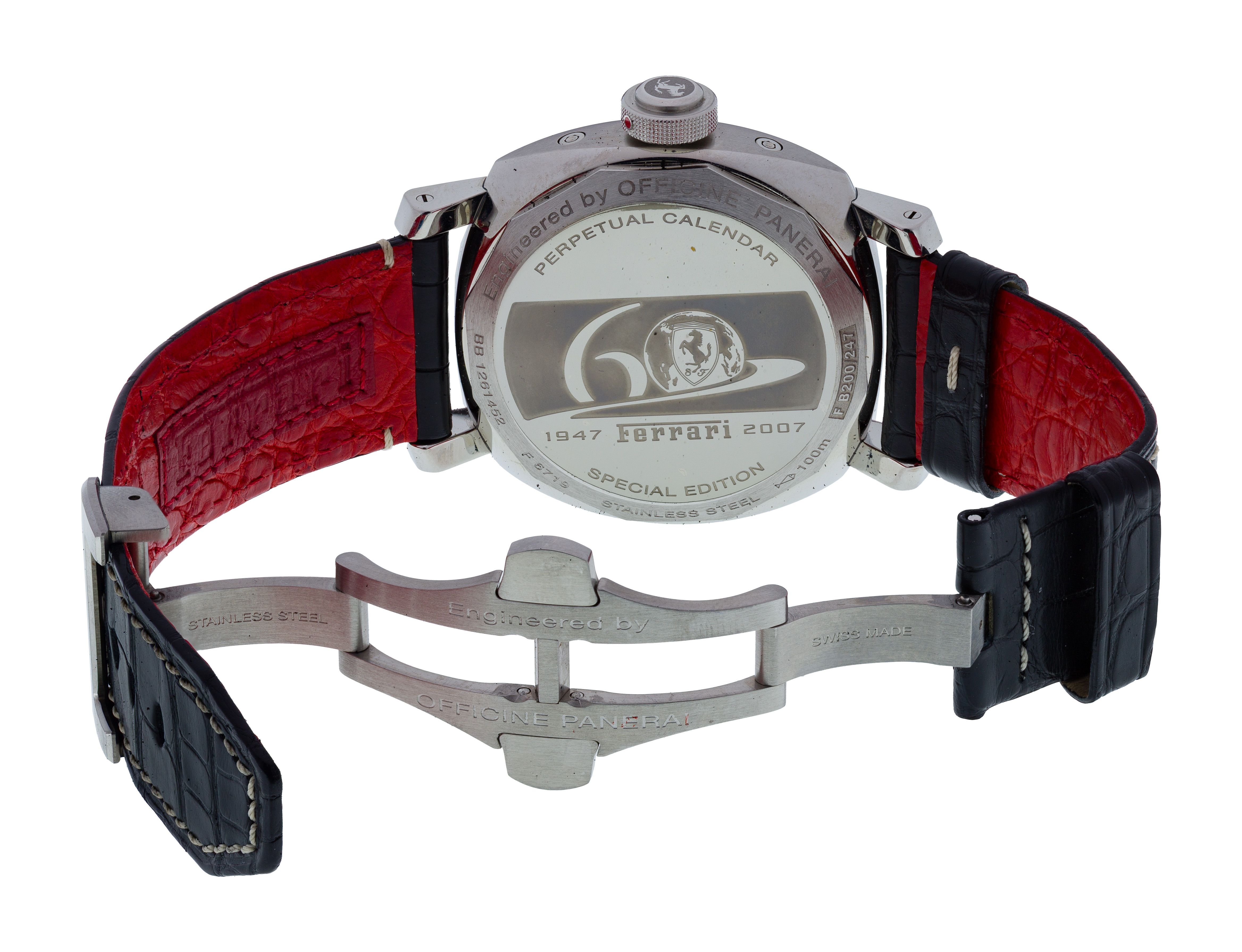 Serial #BB1261452, ref #FER00015, special edition #200 / 247, automatic having three sub-dials at 3, 6 and 9 o’clock, perpetual calendar, mechanical movement, illuminated hands, black dial, stainless steel case on a black leather straps with deployment buckle, COA and original box and presentation box