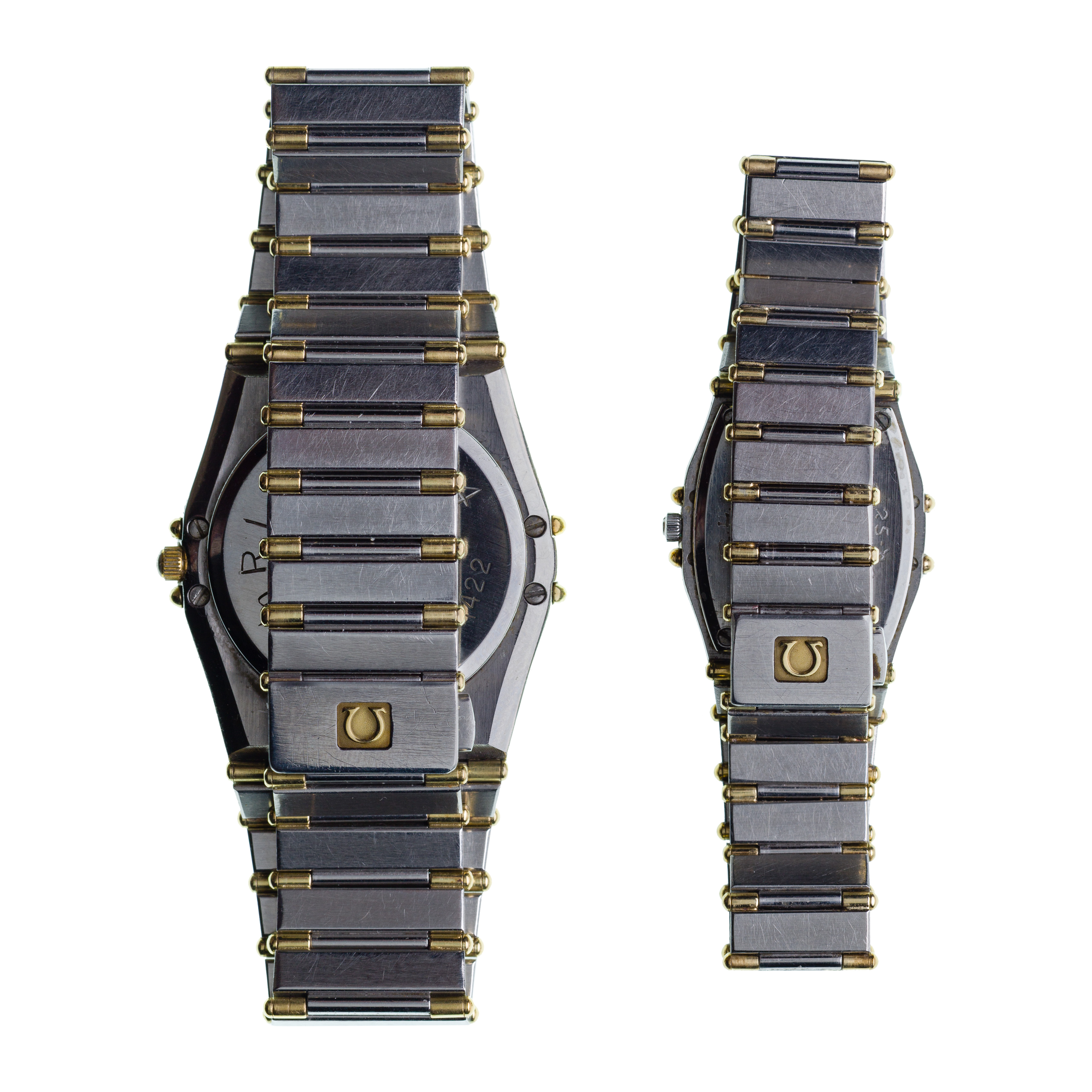 Condition: overall light wear consistent with normal use, overall dirt accumulation, both having engraved back plates, gold unmarked but XRF tested as gold of varying karats, possibly plated, men’s running when tested, not tested further, new battery, lady’s not running, fibers trapped by dial