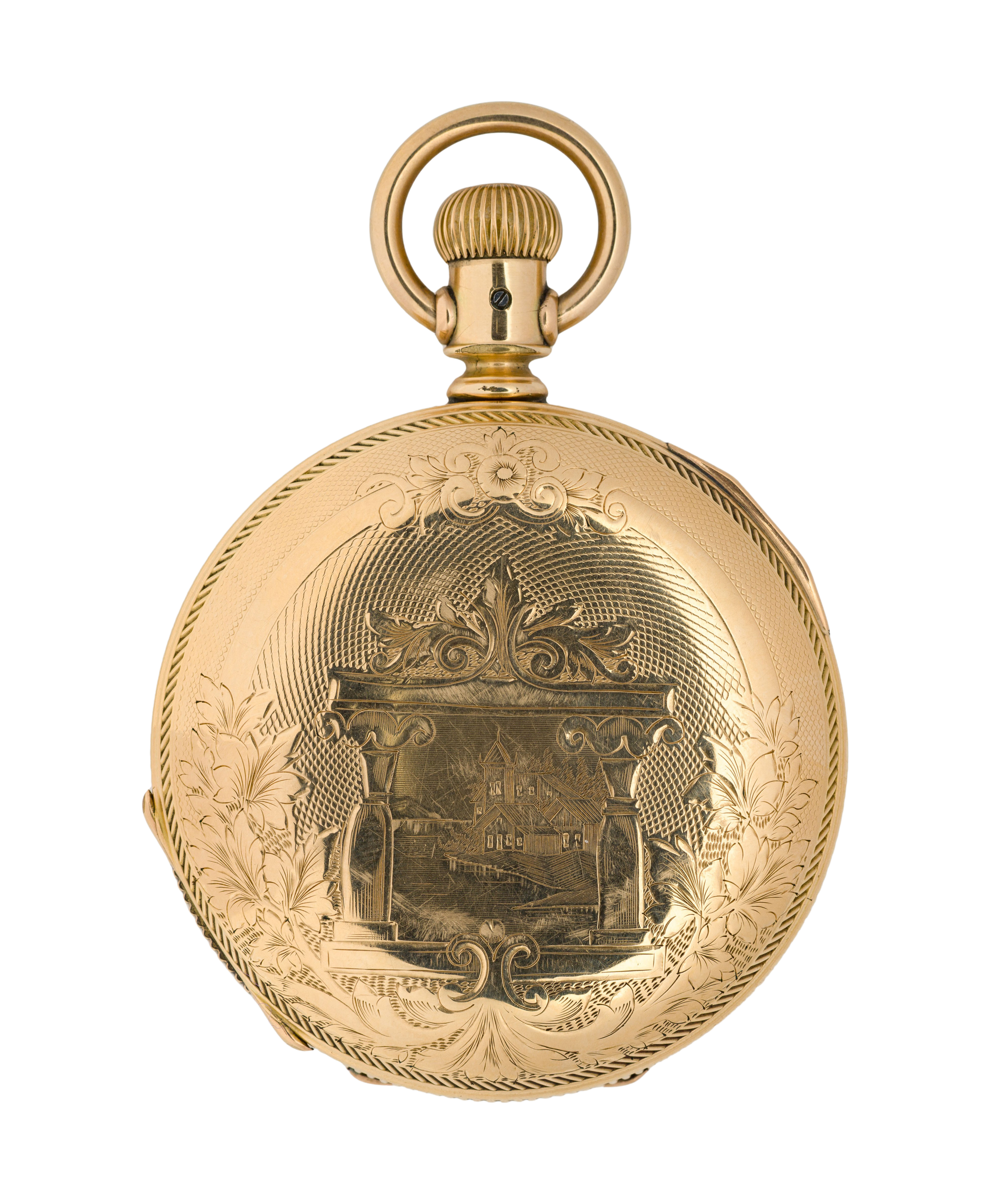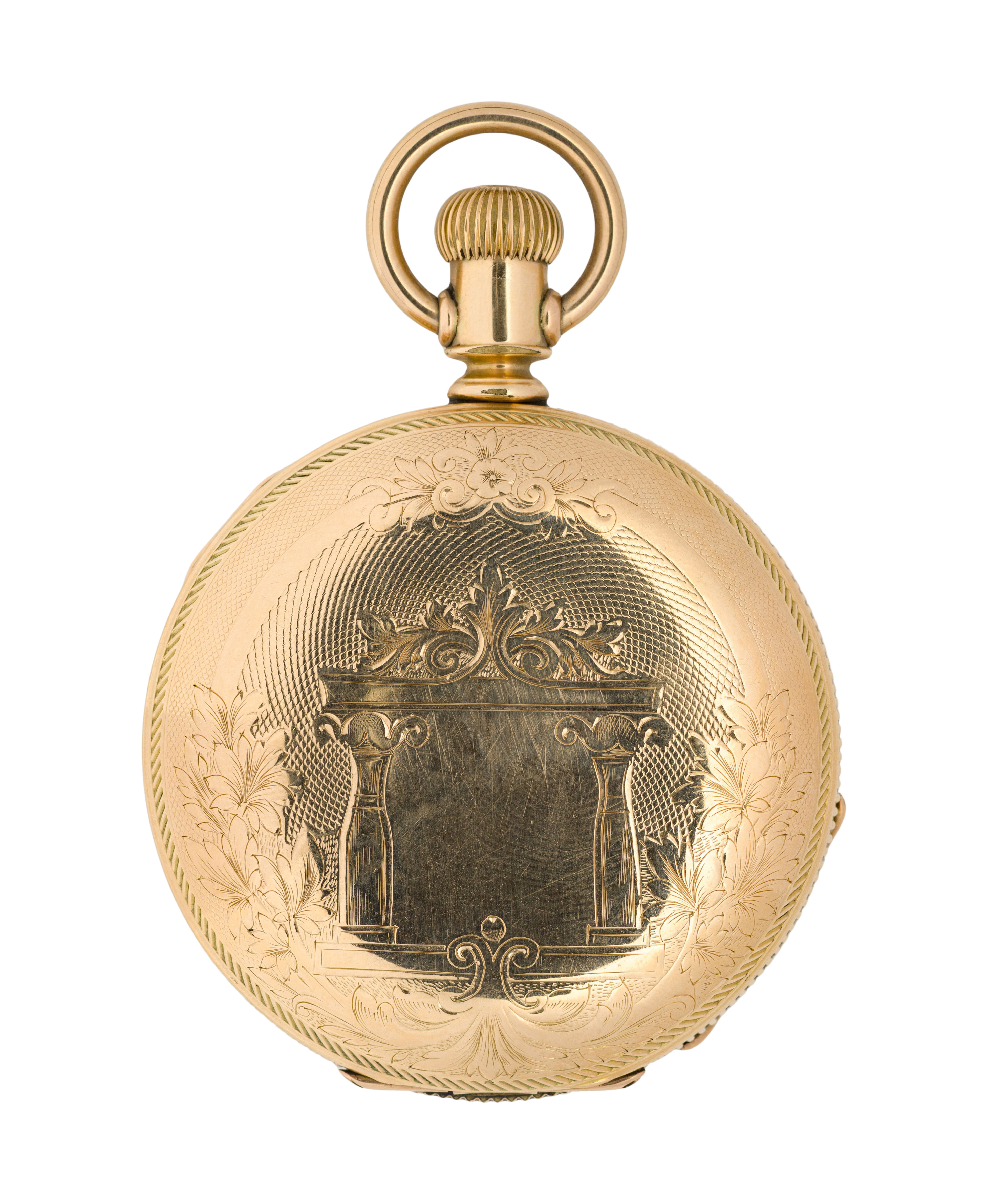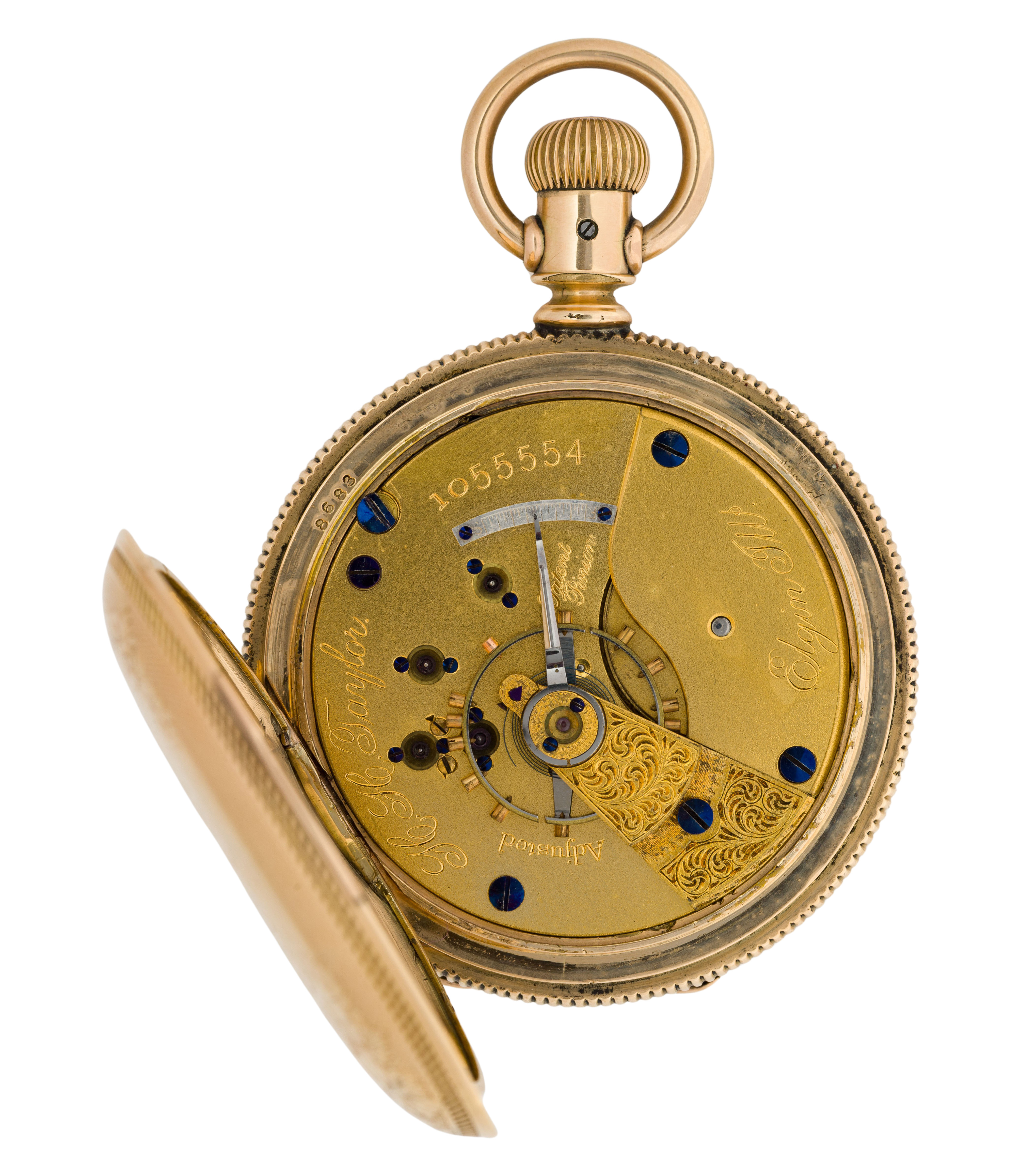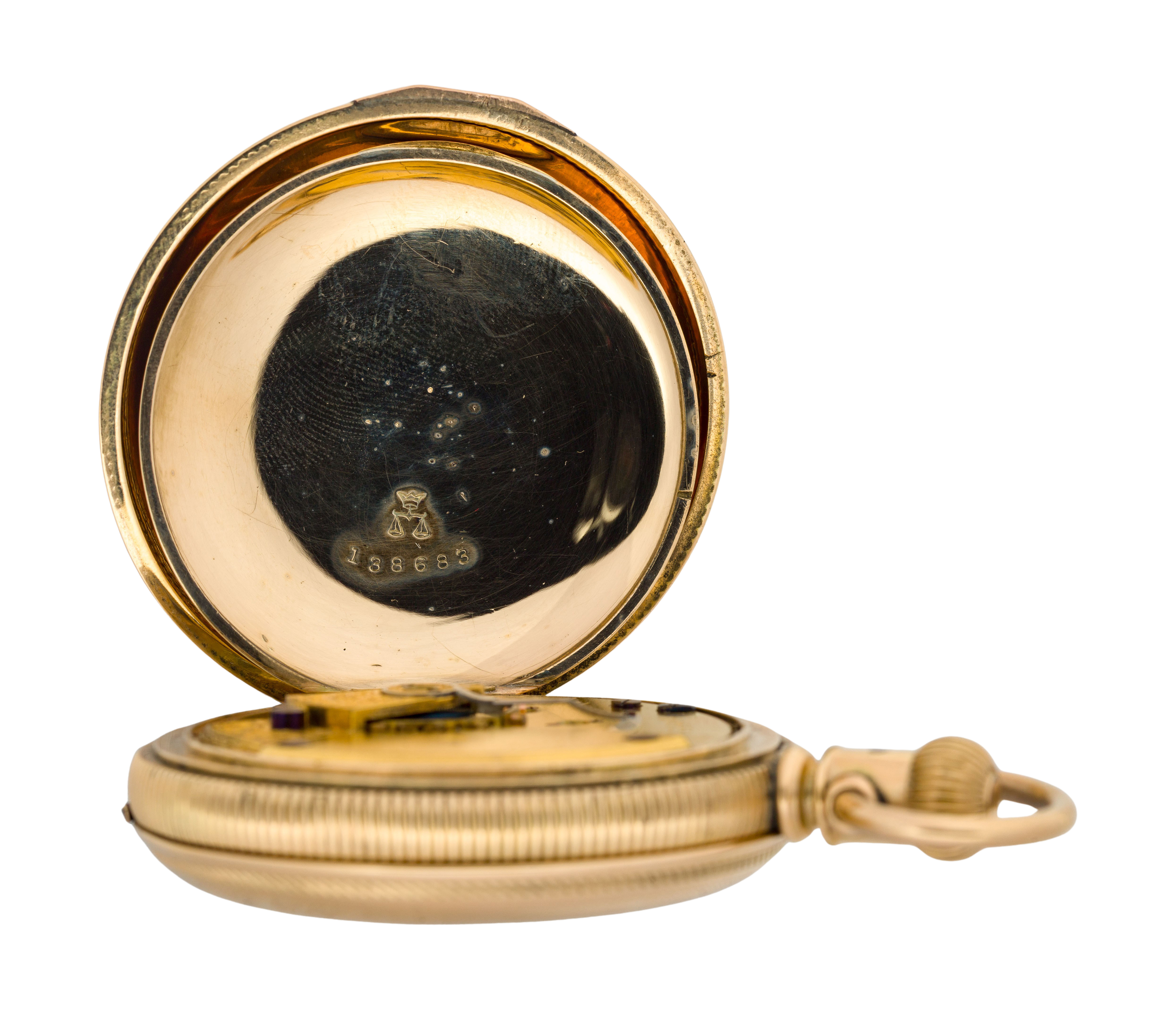 Serial #1055554 dating to c.1883, 15-jewel movement, No.80 grade, white dial having Roman numerals, blue hands, subsidiary dial for seconds, stem wind, lever set, Keystone gold-filled case