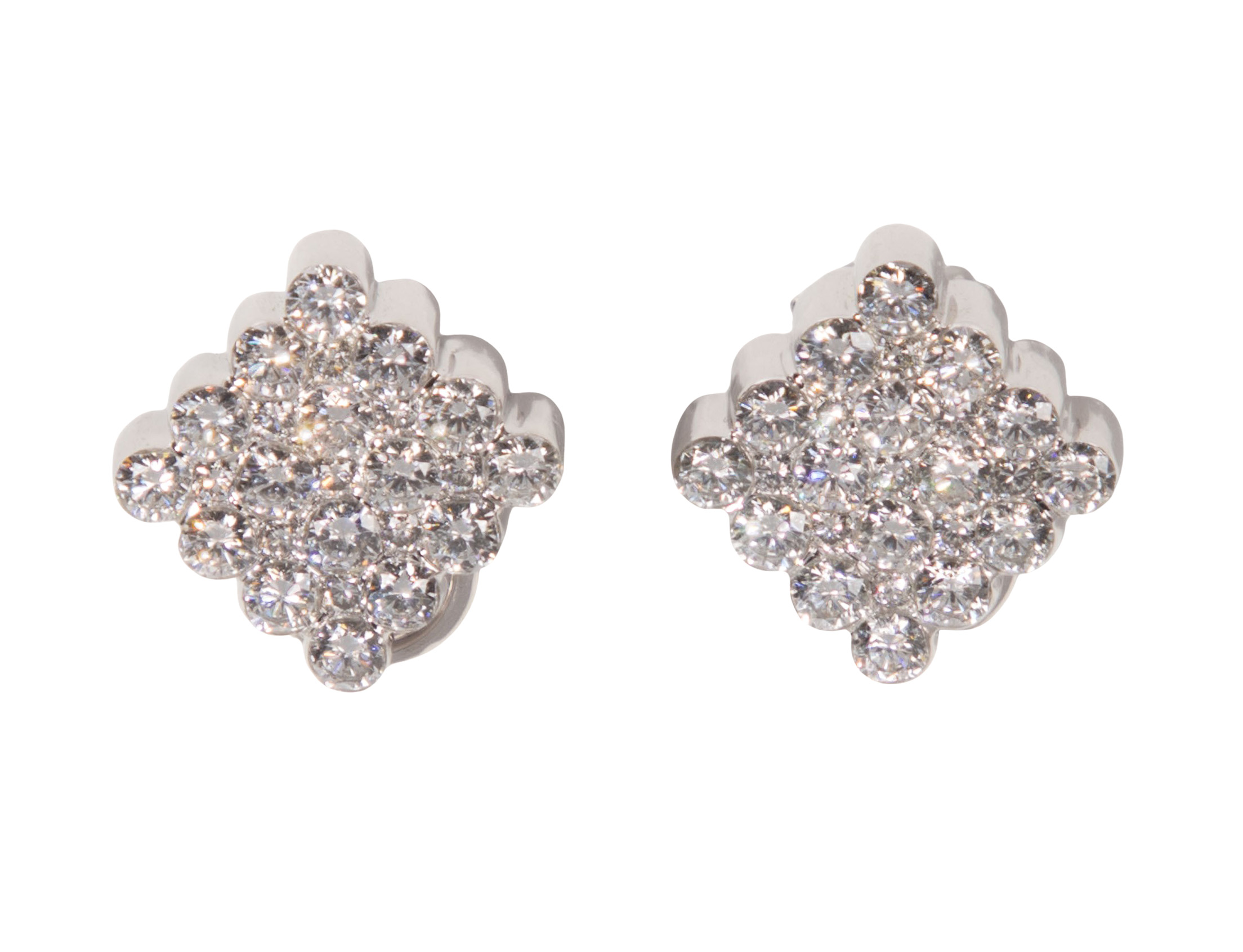 A pair, each having sixteen round brilliant cut diamonds separated by nine smaller round cut diamonds, diamonds weighing approximately 3.24 carats total, H-I color, VS-SI clarity, no florescence noted (marked ’18k’)