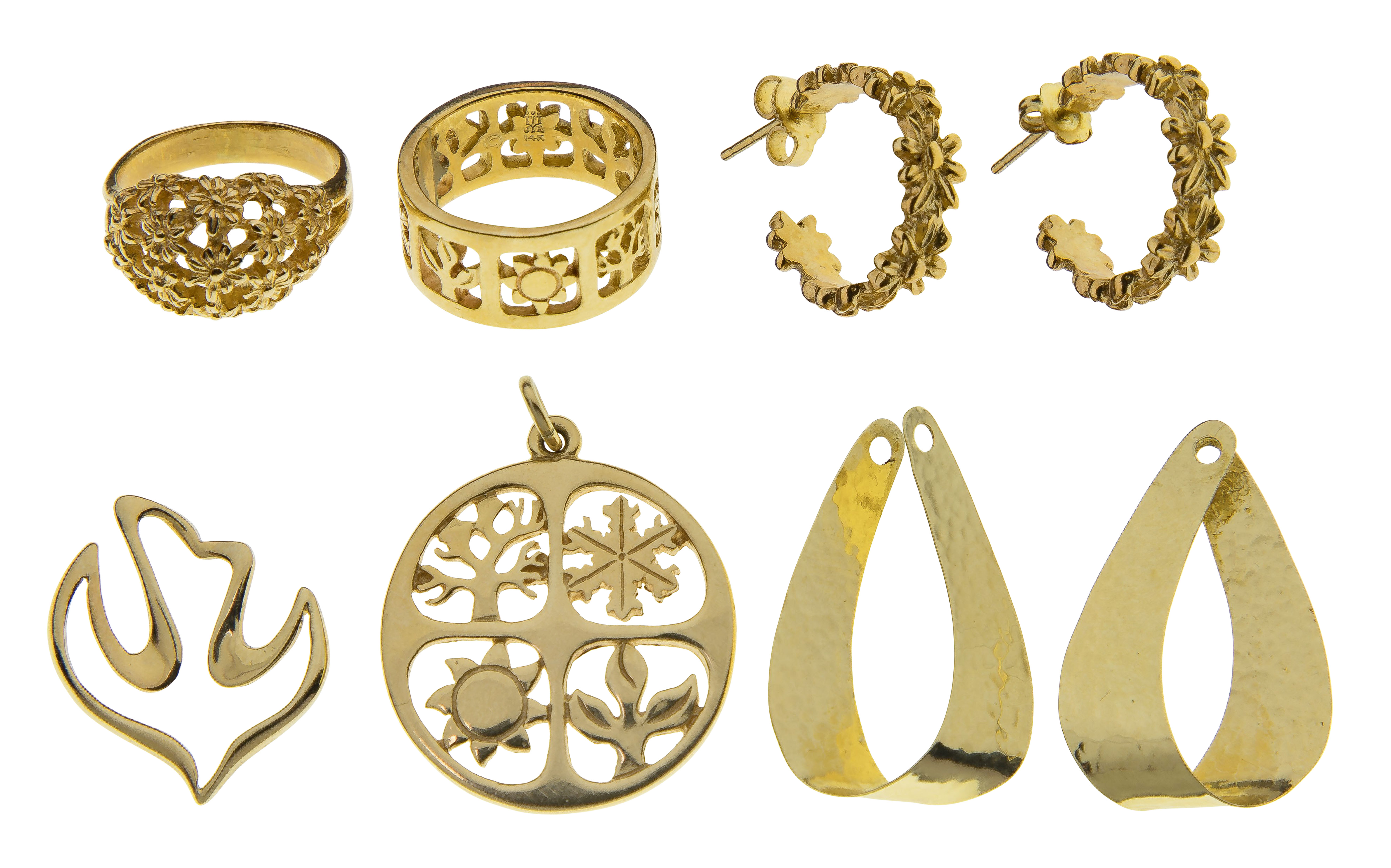 (6) items including a four seasons themed pendant and ring, a stylized dove form pendant, a floral motif ring and pierced earrings as well as a matched set of modern design earring jackets (all marked ’14k’)