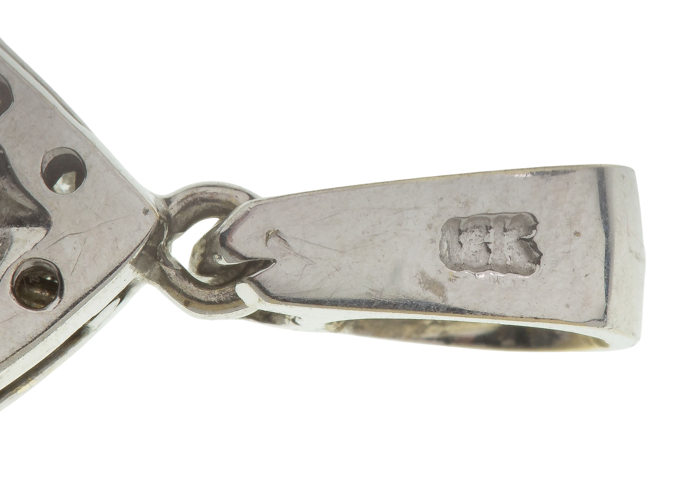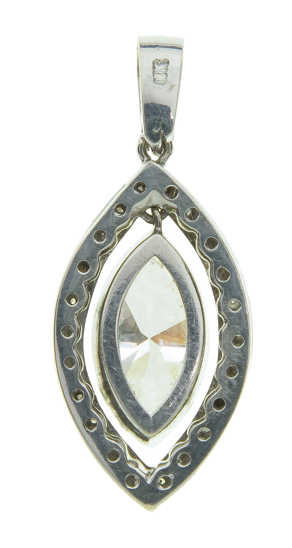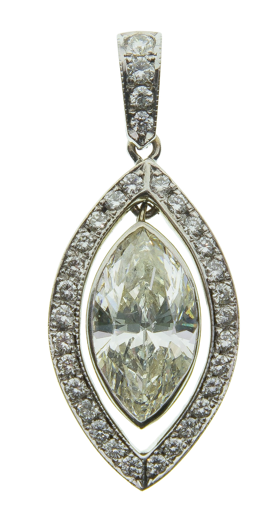 Diamond pendant set with a marquise cut diamond (15 x 8 x 4.82mm, approximately 3.35 carats) in a swing mount, J color, SI-2 clarity, strong blue fluorescence, mount further set with thirty-two round brilliant cut diamonds measuring 1.7mm each (marked "18k"), diamonds weighing approximately 3.87 carats total