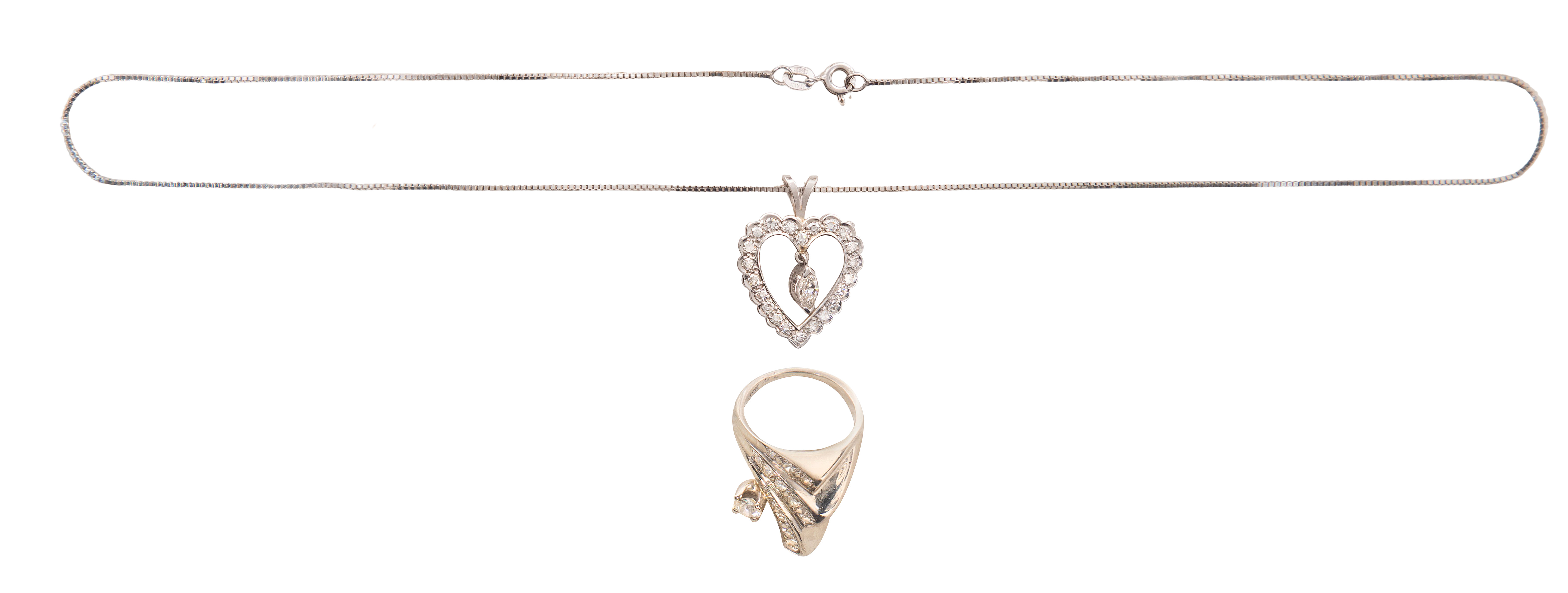(2) items including a ring having a solitaire round cut diamond flanked by three rows of diamond accents and a diamond heart pendant on necklace (marked ’14k’)