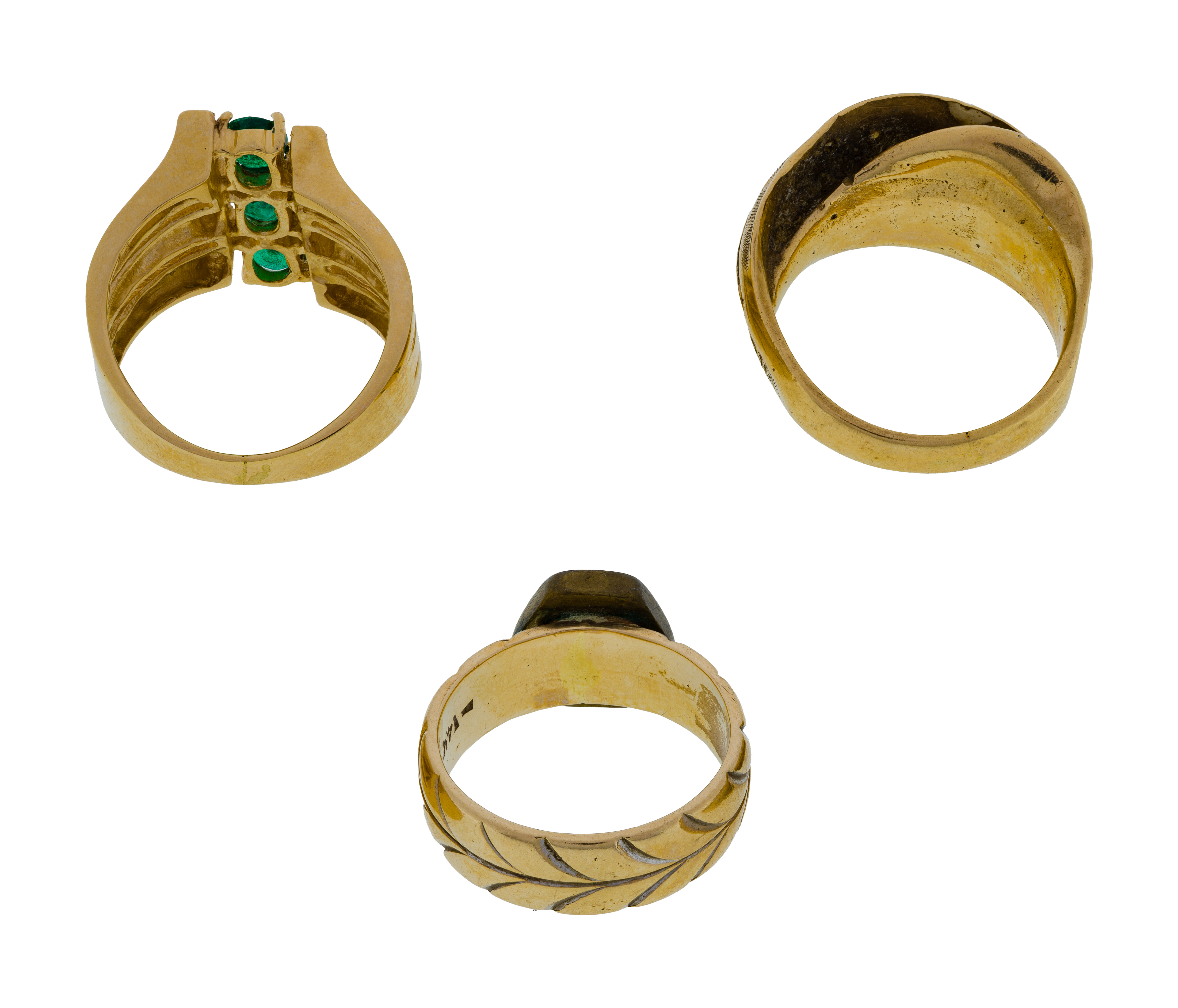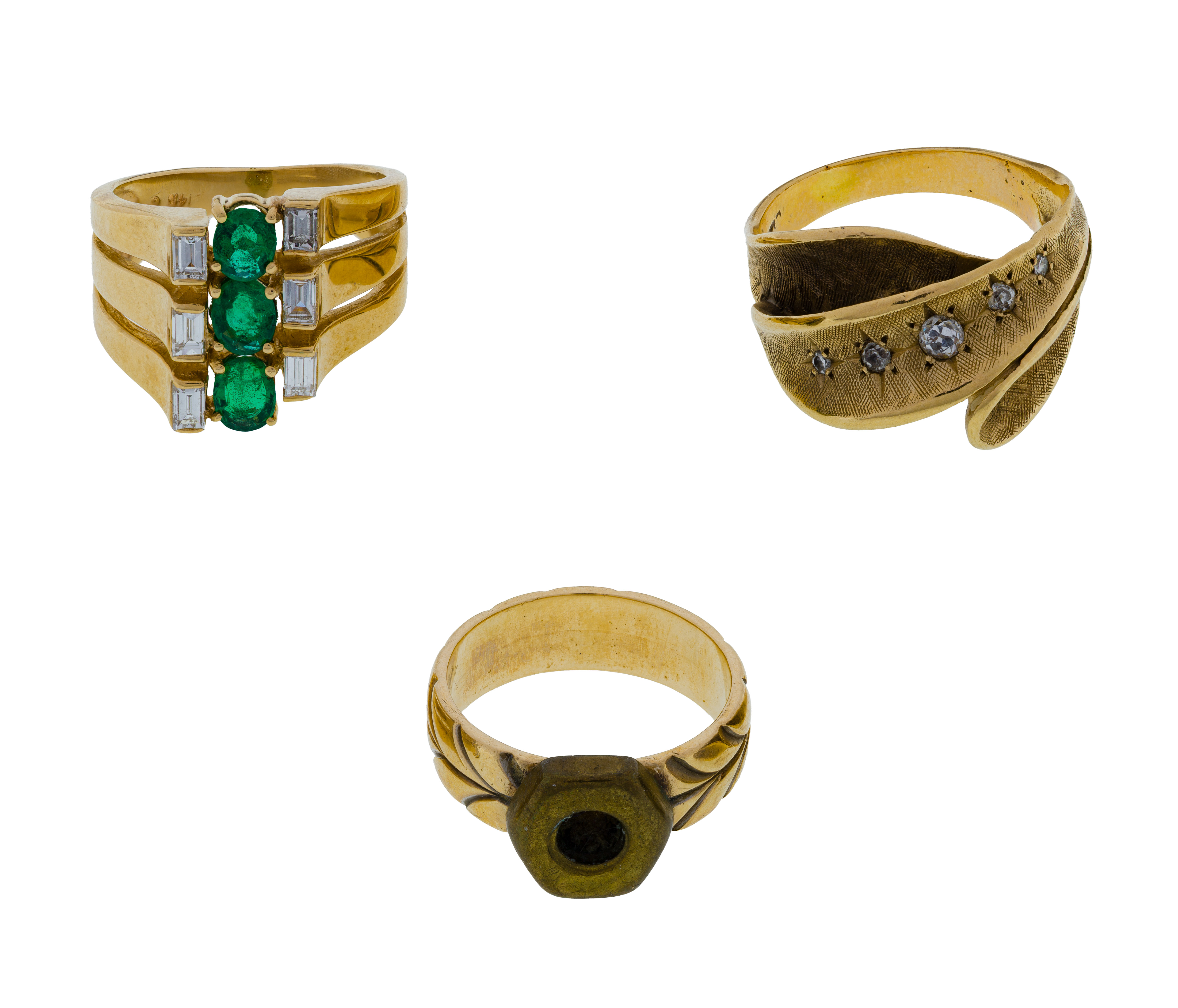 (3) rings including a wave-form having five graduated round cut diamonds, a multi-band-style having three oval cut emeralds flanked by six baguette cut diamonds and a band having a brass nut attached (all marked ’14k’)