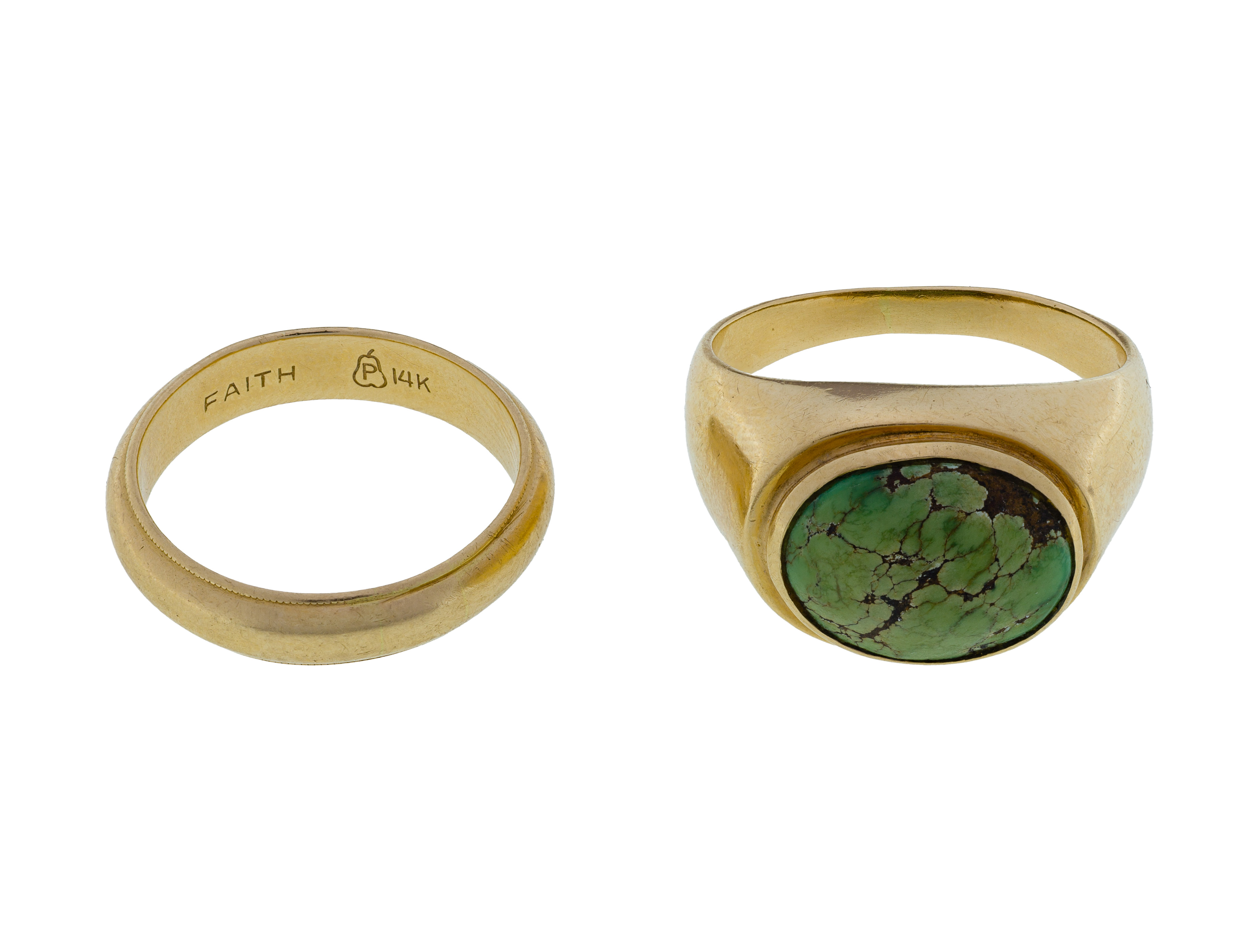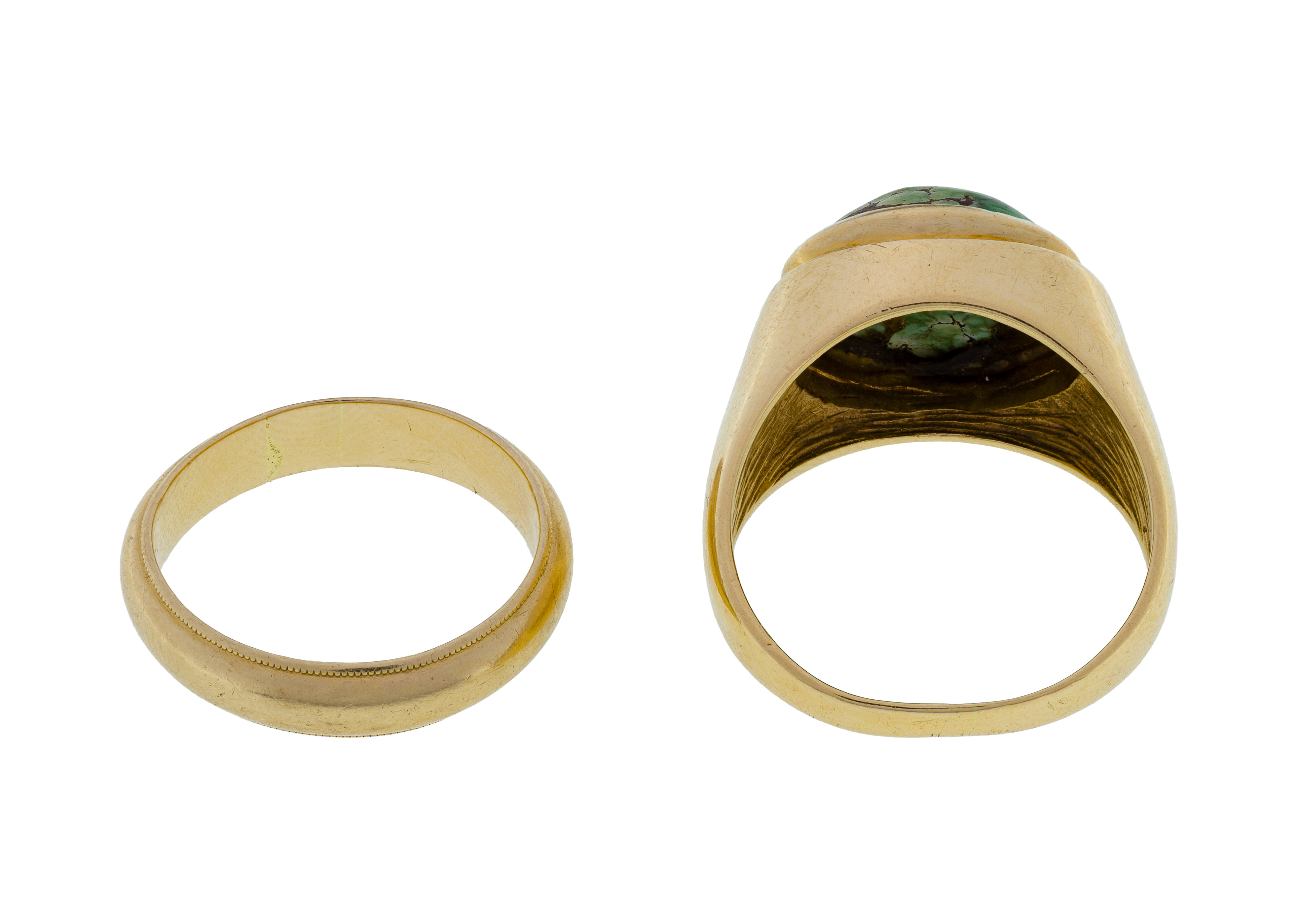 (2) rings including a band (marked ’14k’) and a ring having an oval cut cabochon green turquoise (unmarked 14k)