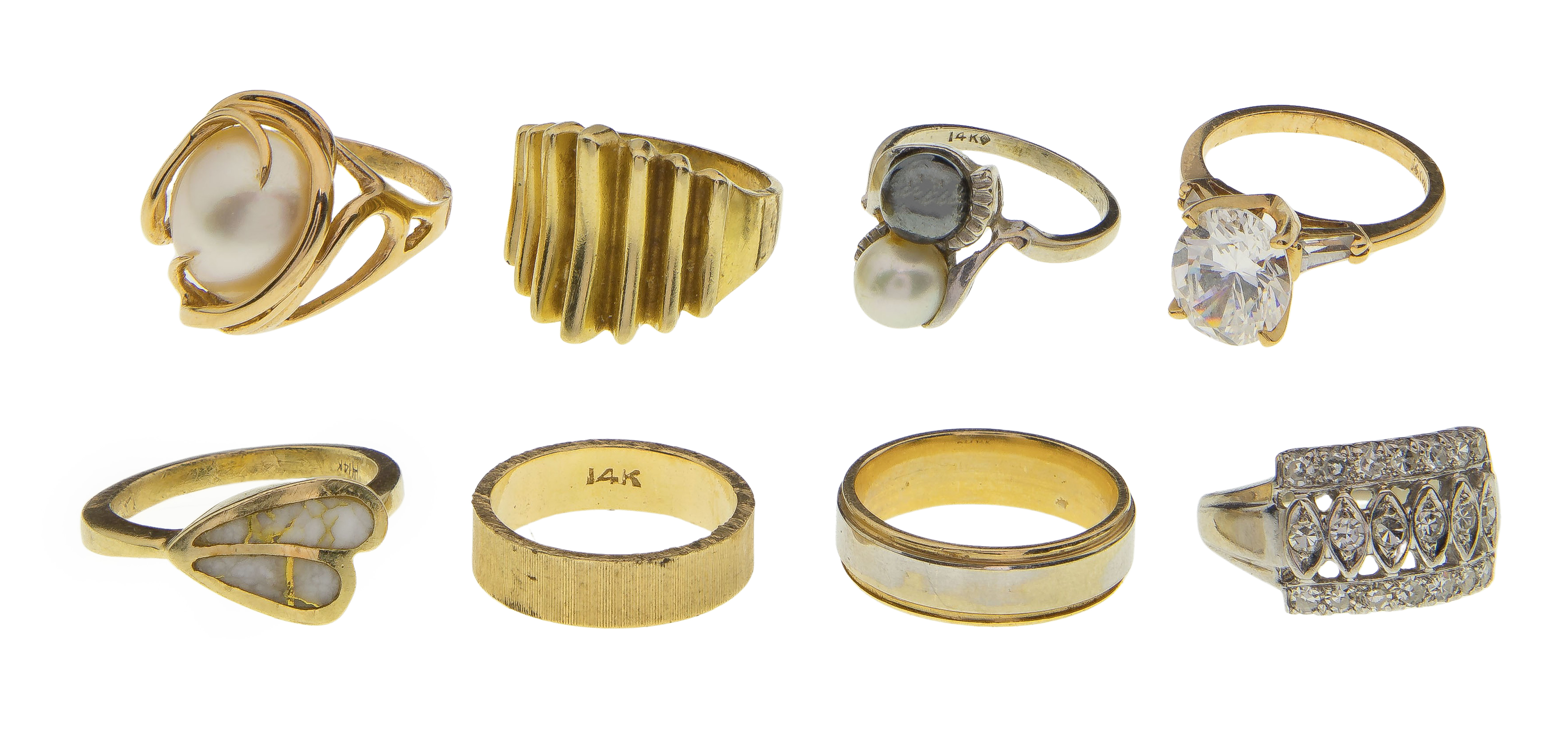 (8) items including a plain band, a ribbed band, a clear crystal solitaire, a white onyx, a diamond accented band, a bi-color band, a double pearl and a mabe pearl (marked ’14k’ / ‘585’)