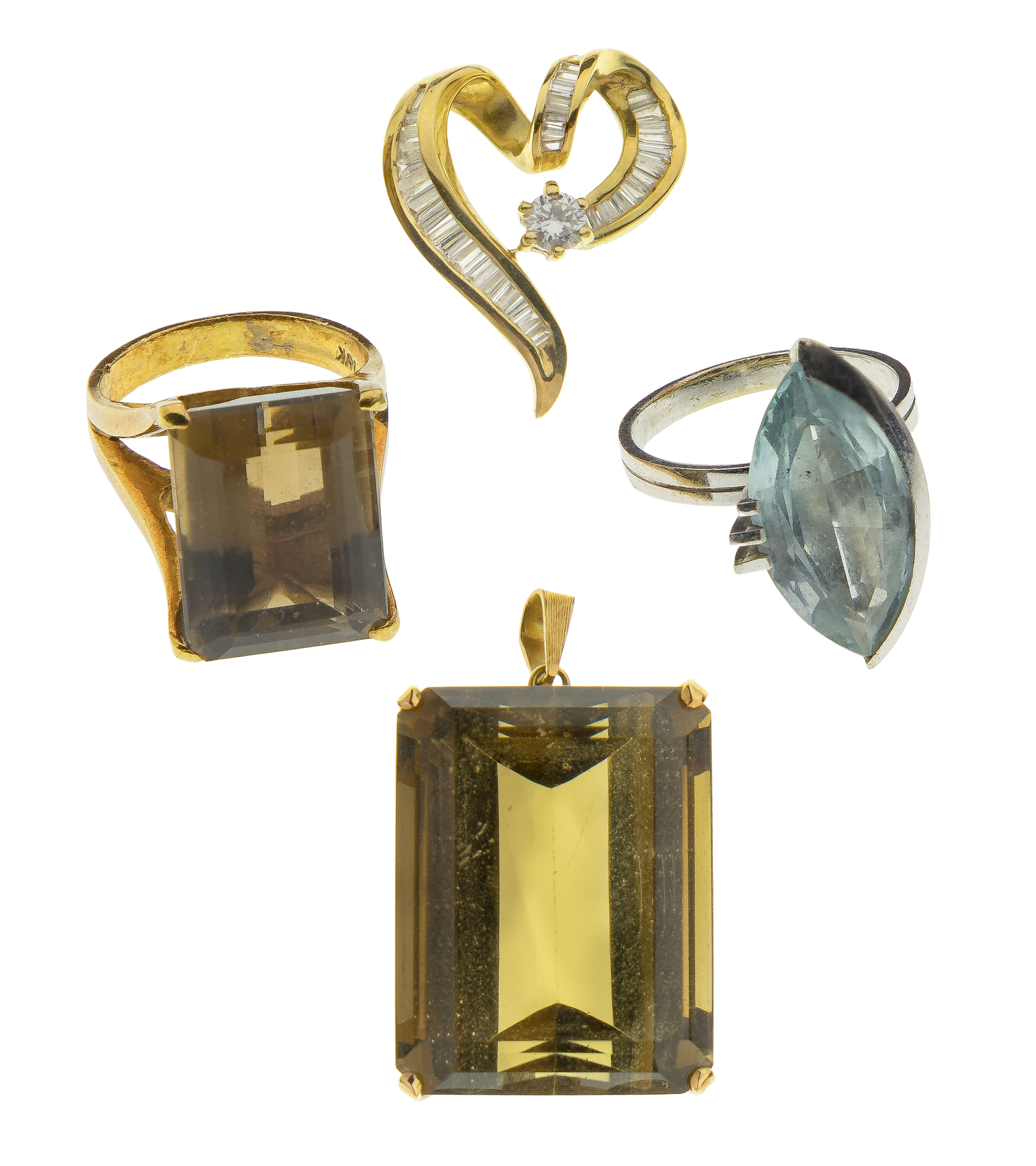 (4) items including an approximately 16mm by 12mm topaz statement ring, an approximately 26mm by 20mm matching pendant, a marquise cut blue topaz statement ring and a heart slide style pendant having a center round cut diamond accented by baguette cut diamonds (most marked ’18k’ / ‘750’)