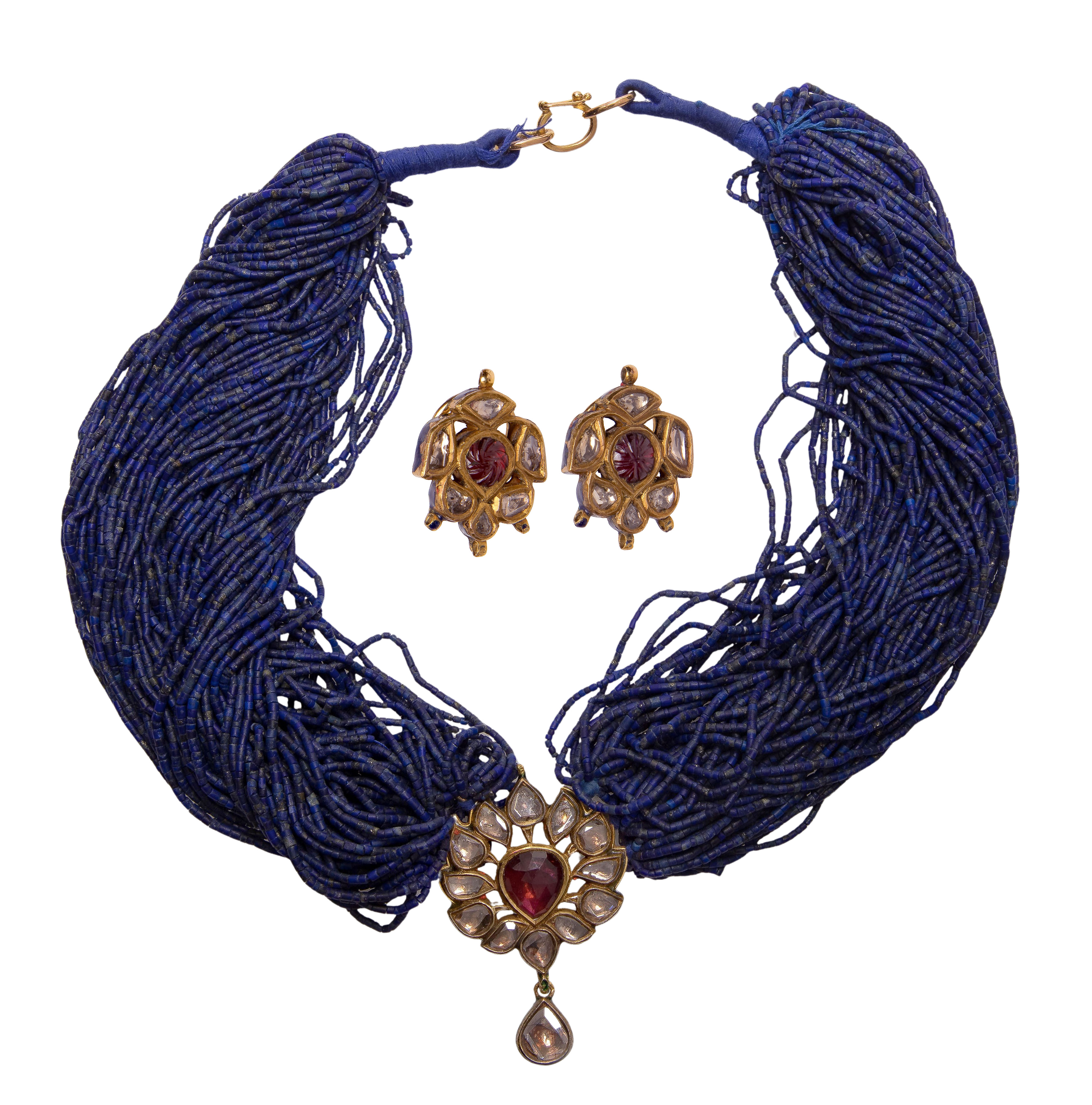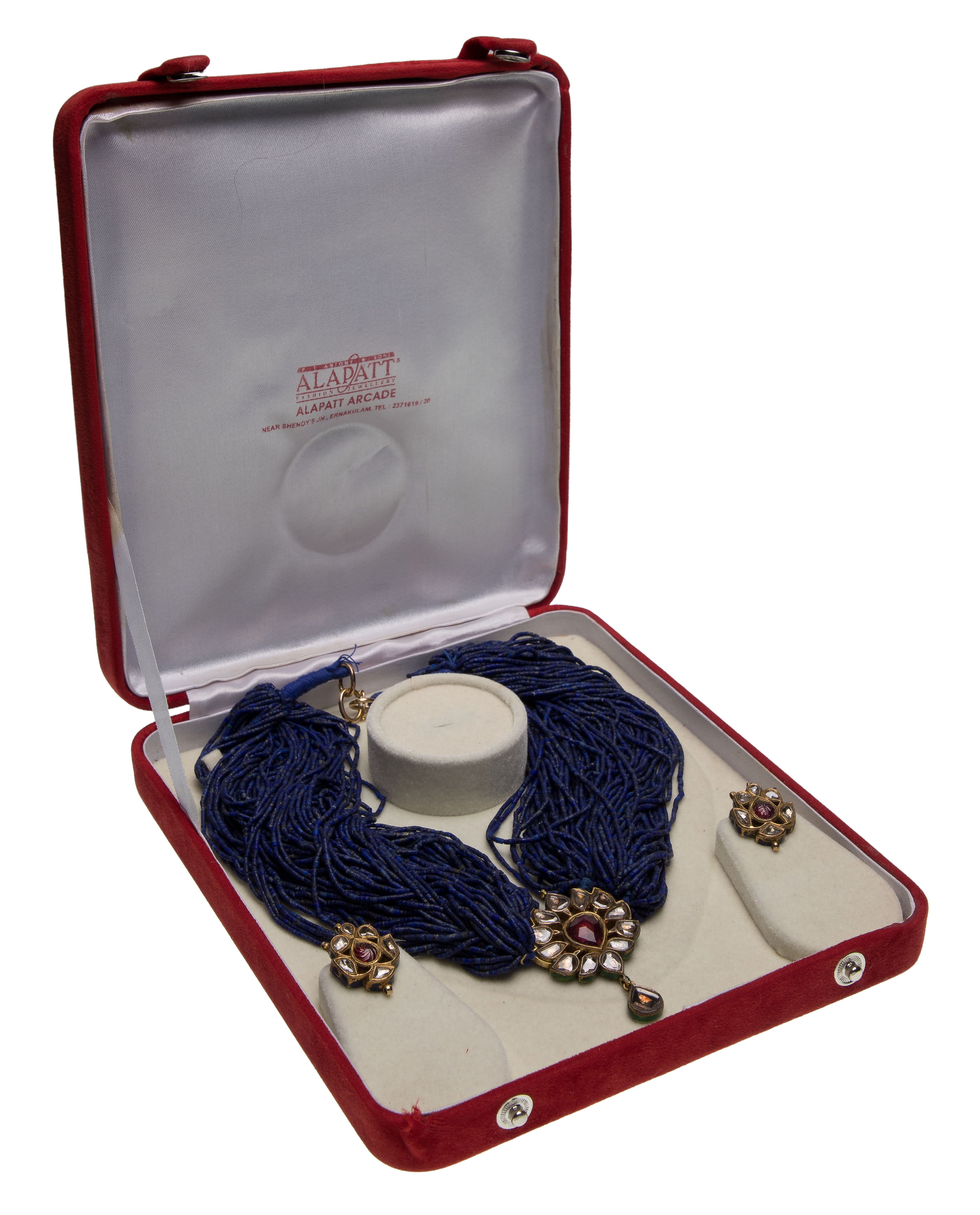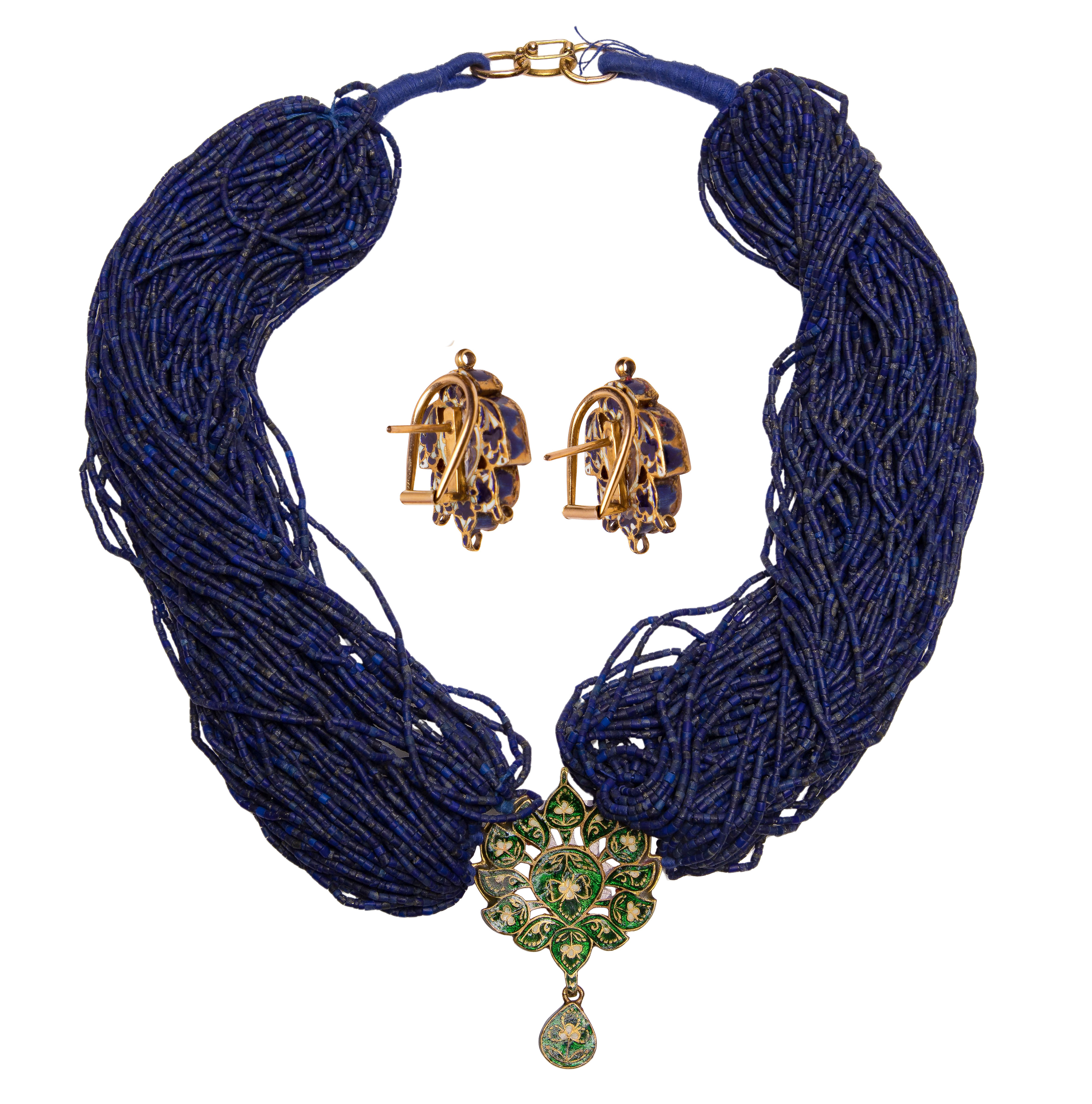 Indian Mughal style diamond and gemstone pendant with enameled back having matching French clip pierced earrings, in presentation case