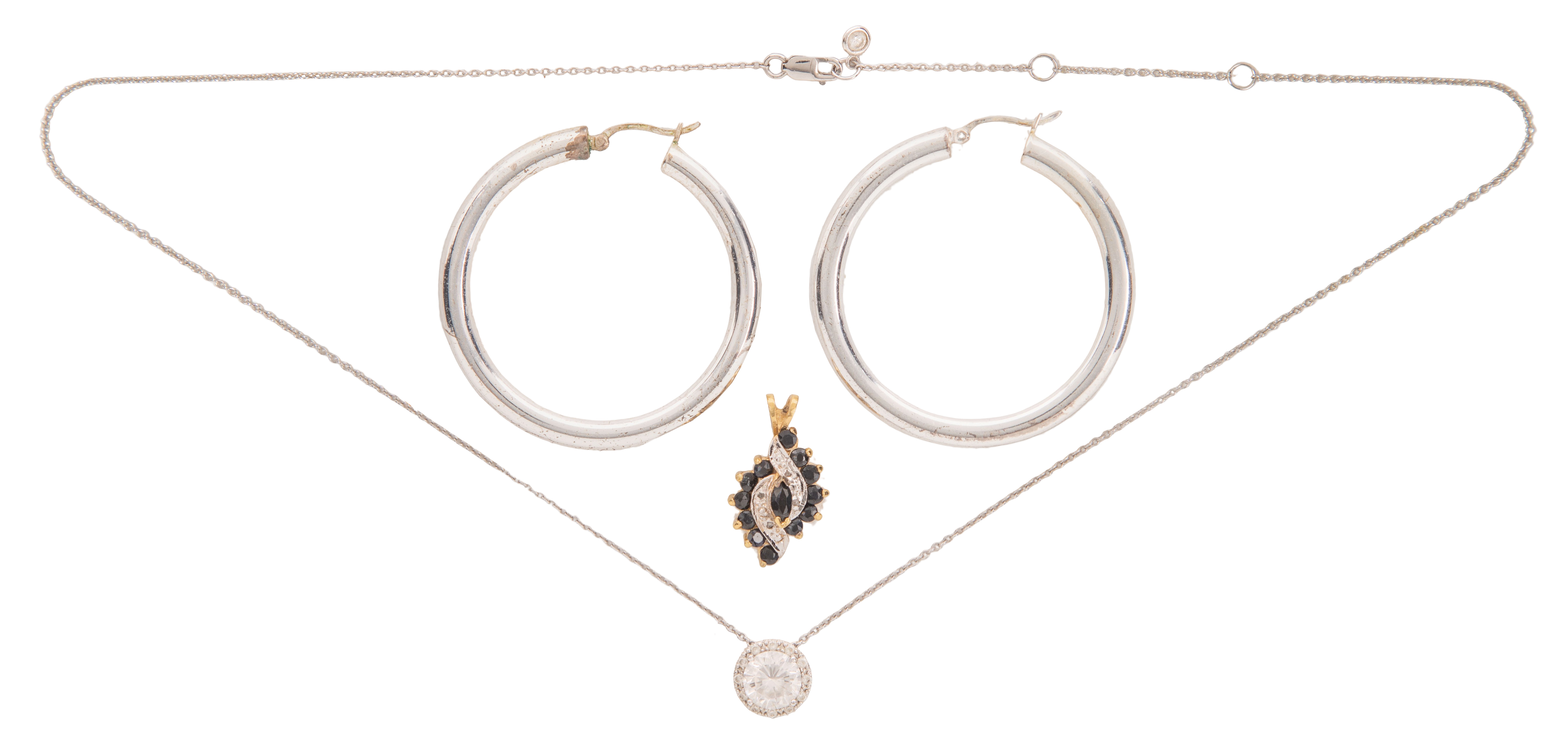Approximately (7.5) pounds including a pair of pierced hoop earrings, a crystal pendant on necklace and a pendant having sapphires (all marked ‘925’ / ‘sterling’) as well as costume necklaces, bracelets, pendants, earrings and fashion wristwatches