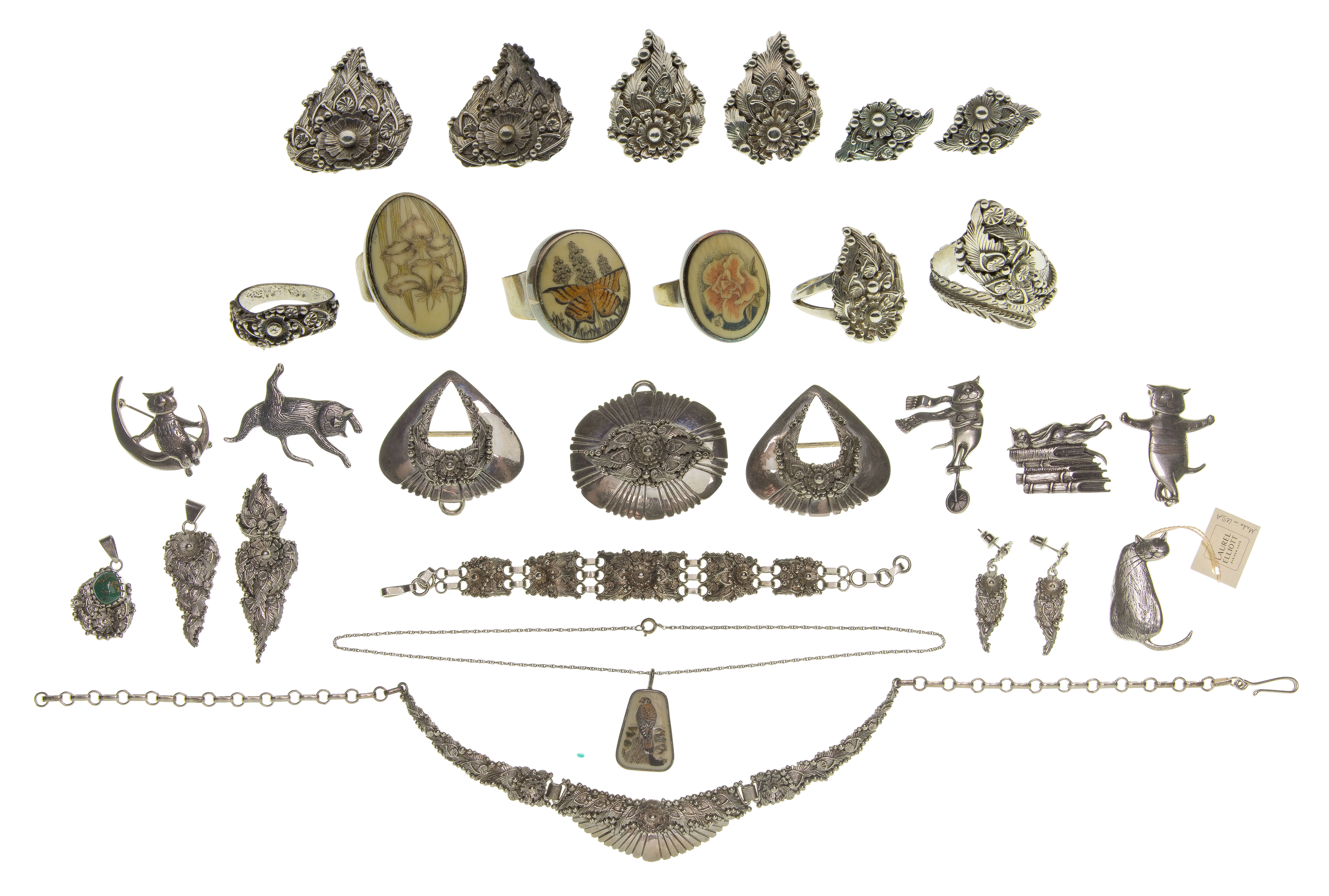Including a necklace, a bracelet, (4) pairs of pierced earrings, (3) pendants, (3) rings, all signed, and an unsigned pendant and belt buckle attributed to the artist; together with rings, pins and necklace (most marked ‘925’ / ‘sterling’)