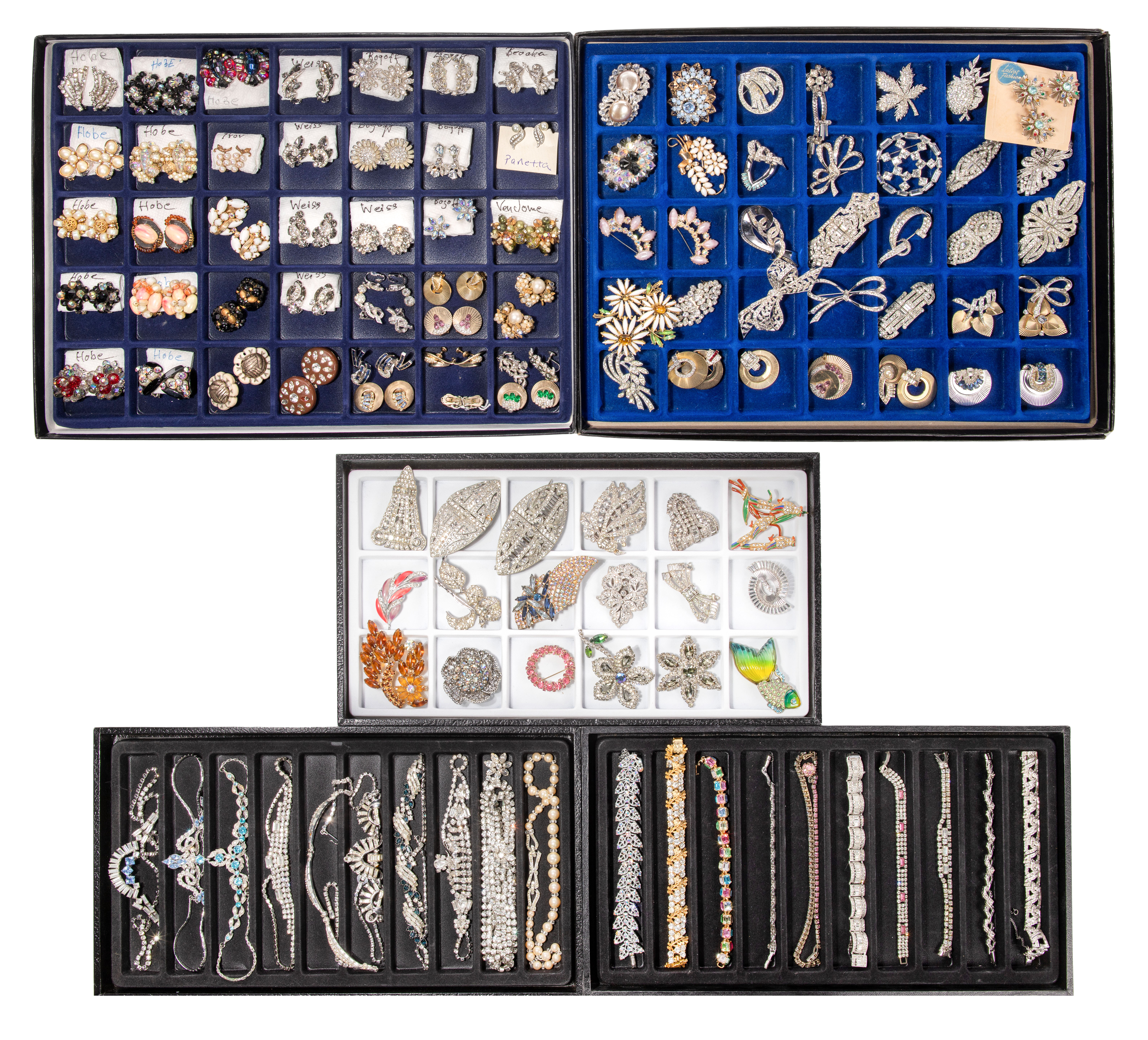 Over (100) items including sterling clipmates, trembler bird brooch as well as brooches, bracelets, necklaces and pairs of earrings, makers including Weiss, Reja sterling, Trifari, Bogoff, Vendone and Hobe