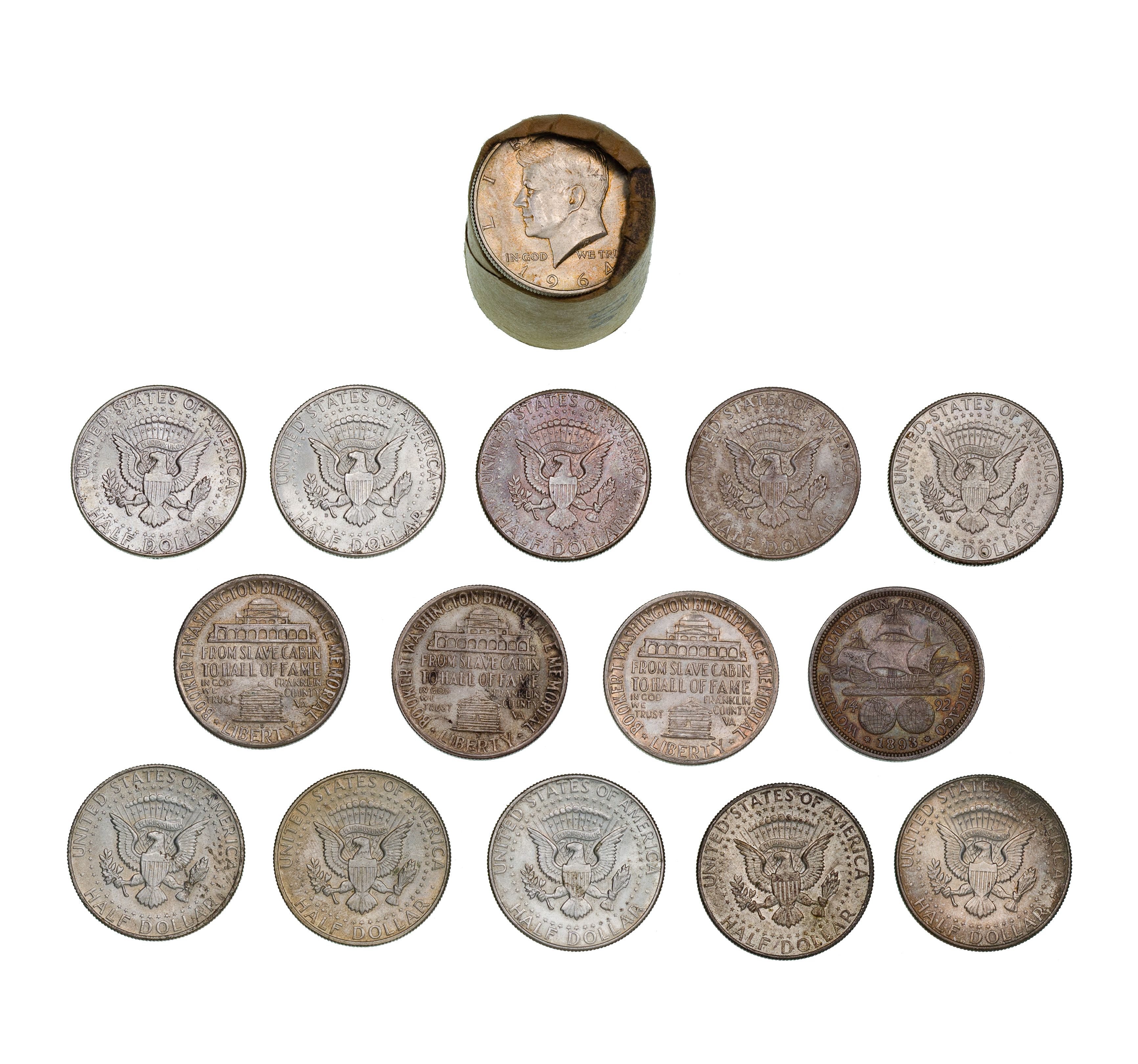$14.00 face value US 90% silver including (25) Kennedy 50c, (3) Booker T. Washington 50c and a Columbus 50c as well as $2.50 face value US 40% Kennedy 50c