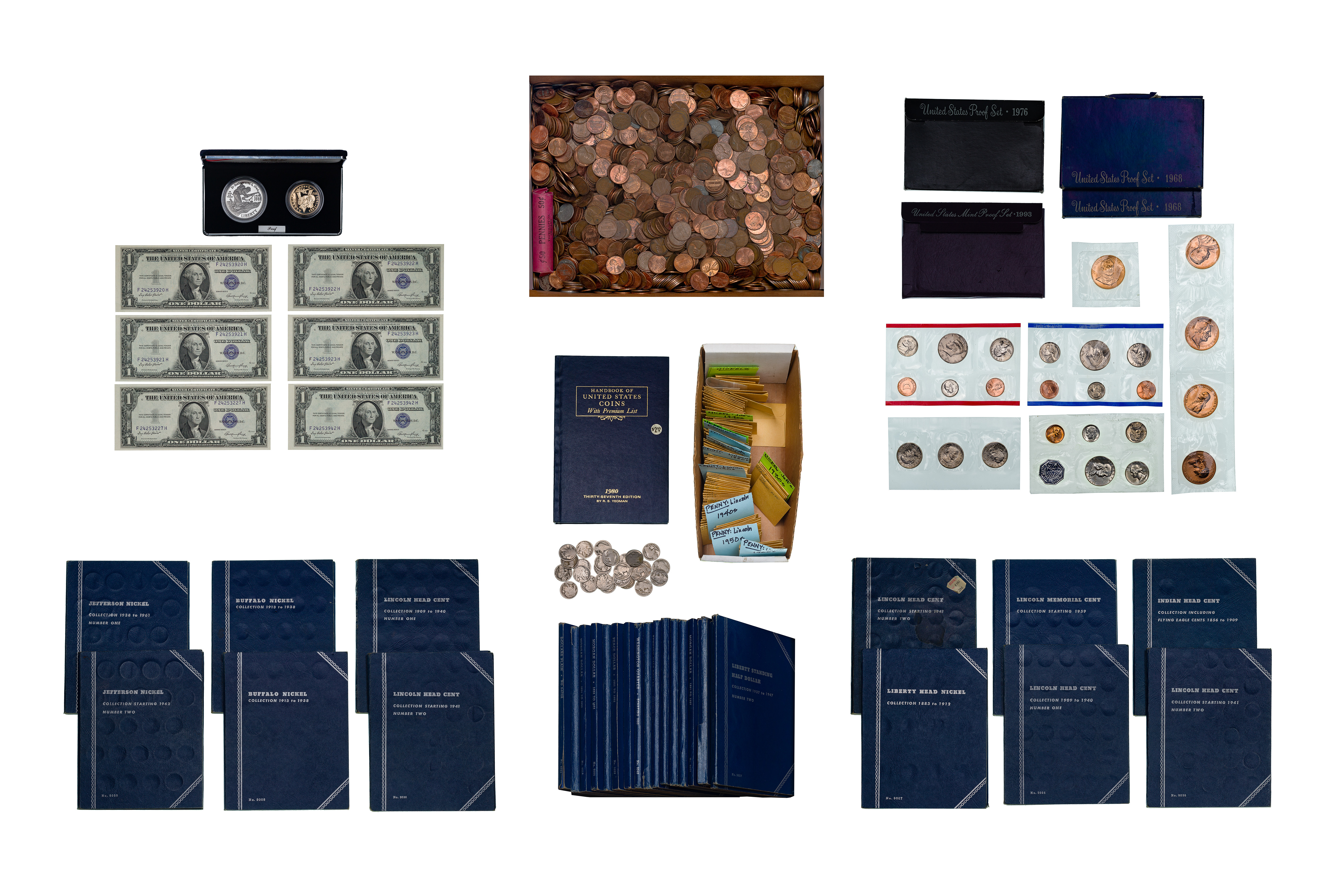 Including a 1957 mint set, (2) 1968 proof sets, a 1976 proof set, a 1993 proof and (2) mint sets, (12) partial coin set albums, a 1979 Susan B. Anthony type set, approximately (23) pounds of Lincoln Wheat and Memorial 1c, assorted Buffalo and Jefferson 5c, (6) 1935-E silver certificates, a World War II anniversary coin set, (4) presidential bronze commemorative, a John Wayne commemorative and (17) empty Whitman coin folders