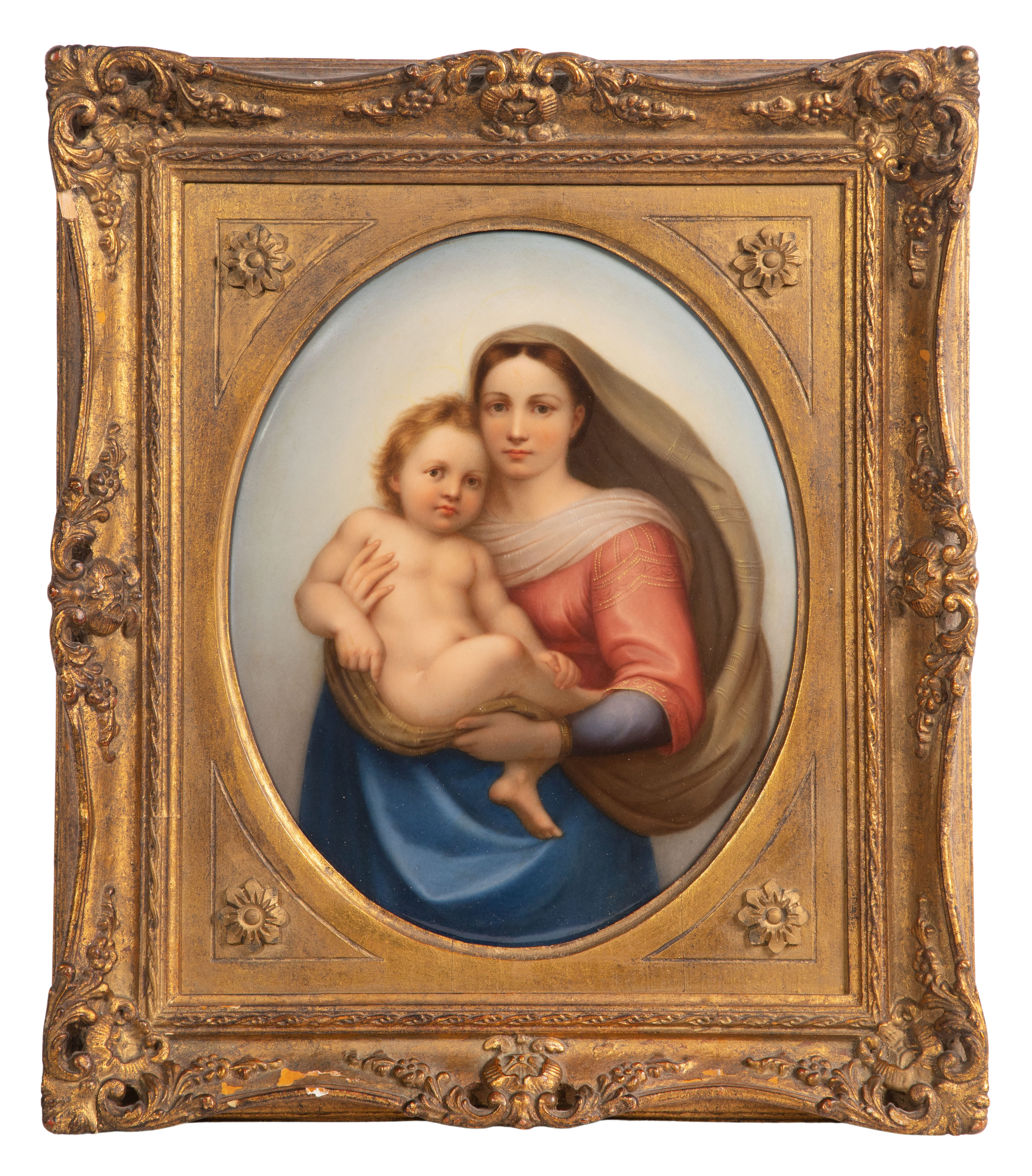 Painted porcelain plaque depicting the Sistine Madonna after Raphael, impressed mark verso in a gold-tone painted composite frame