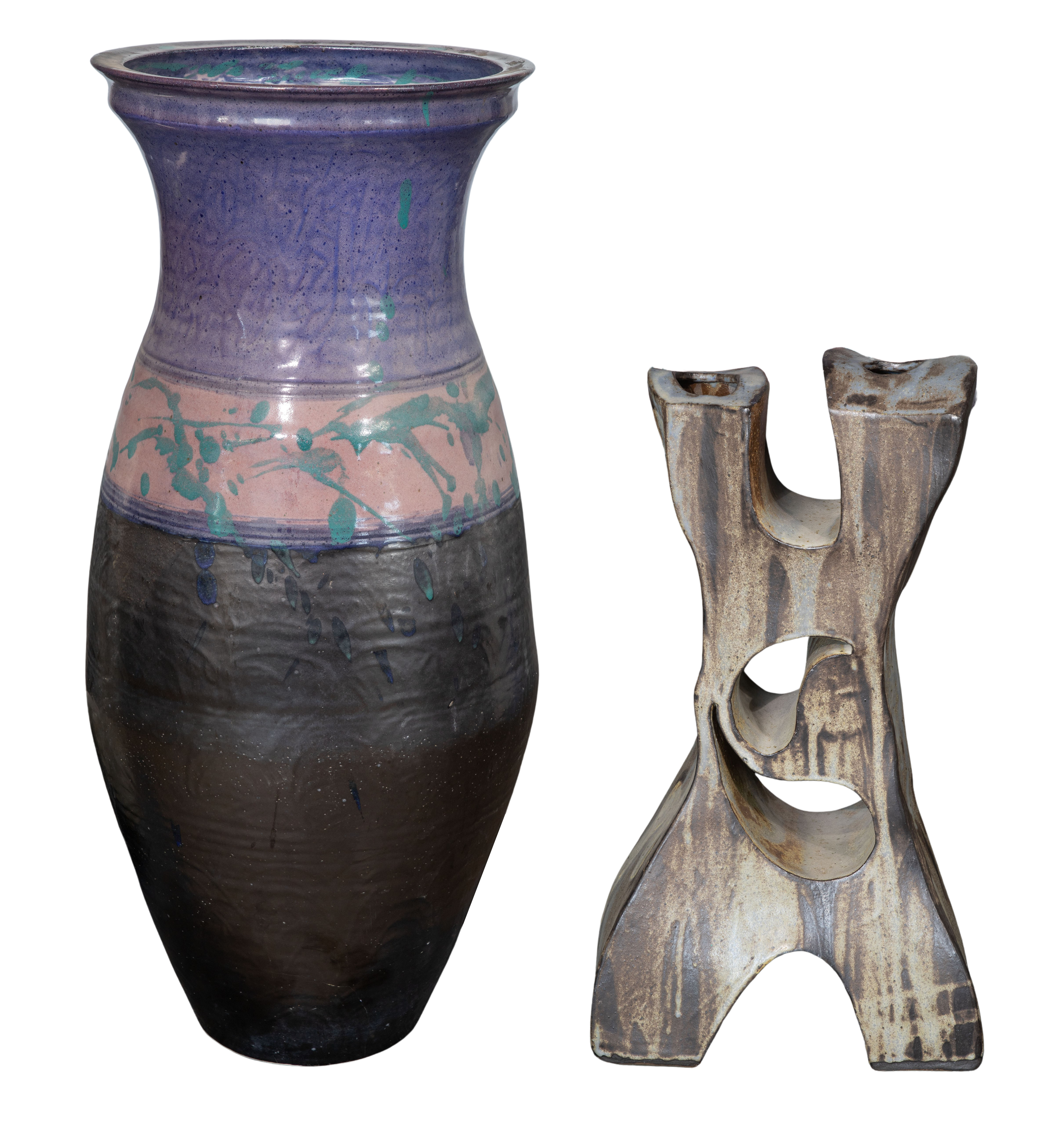 (2) floor vases, including a Paul Jeselskis having a purple and black glaze, signed on underside, as well as an unsigned double vase having a yin and yang motif
