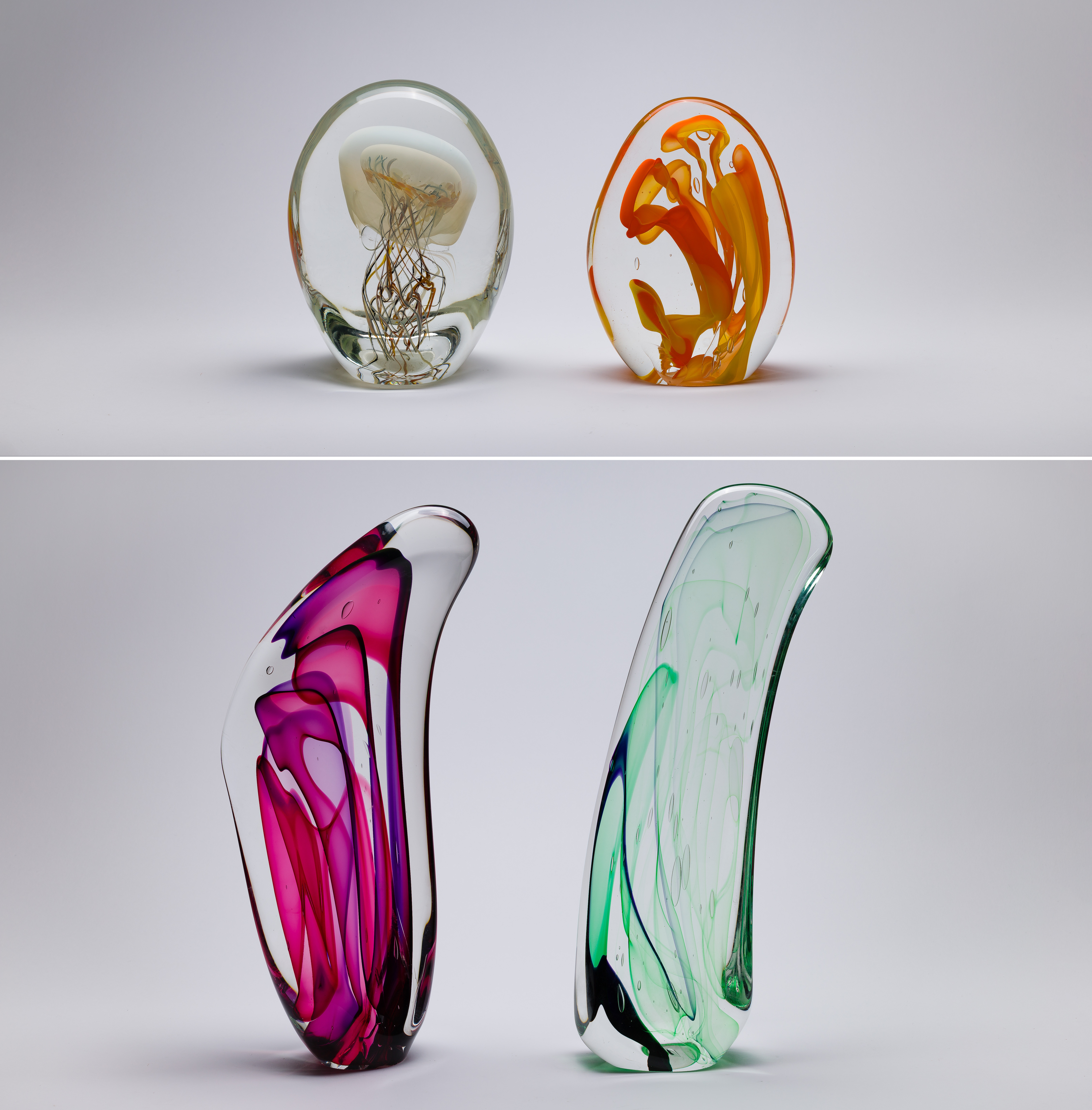 (4) undated items, unsigned, including (2) oval shaped, and (2) elongated flat front, all having color threads throughout, one oval appearing to be a jelly fish