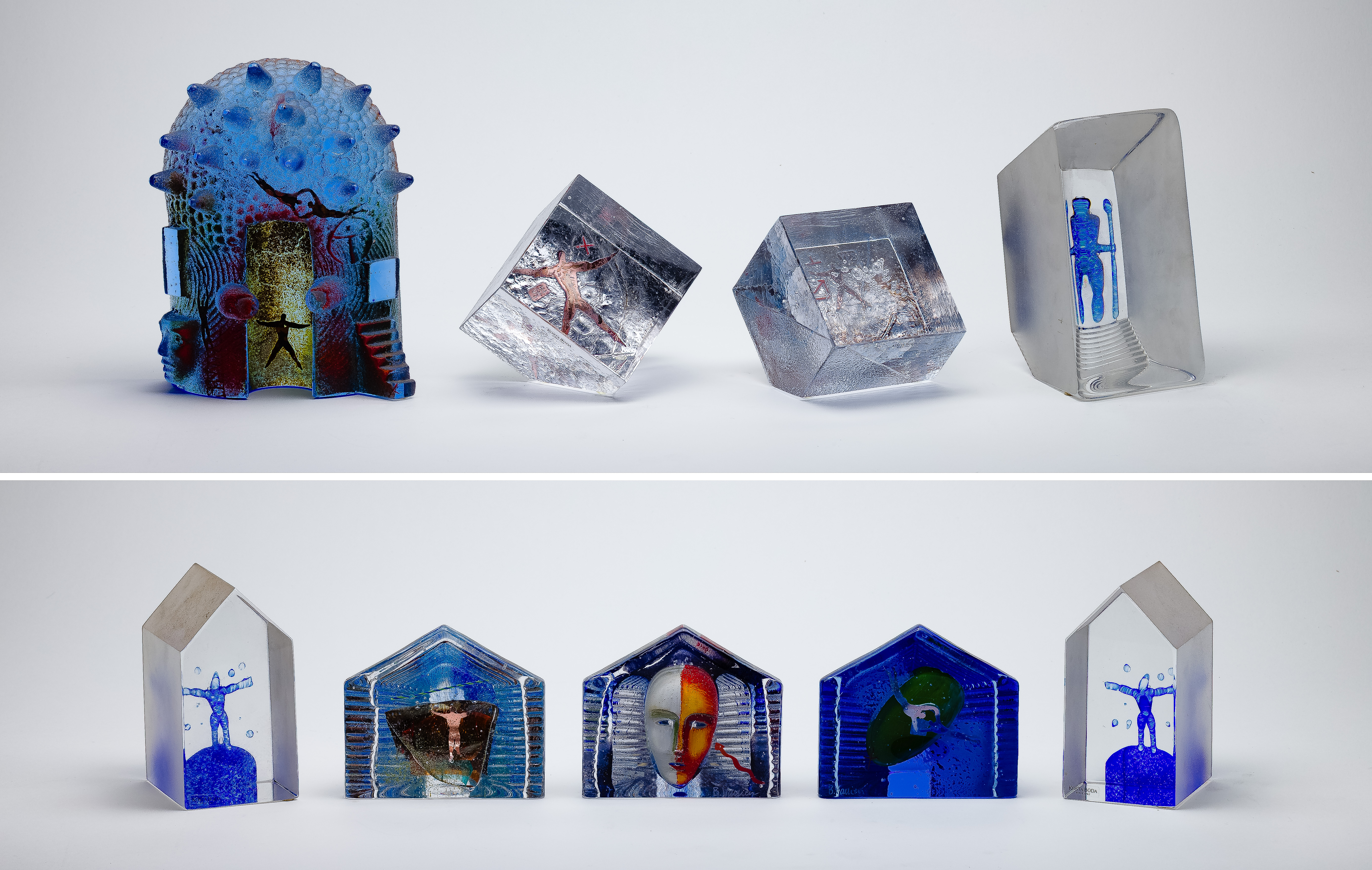 (9) items, most having silhouettes of figures encased in shaped blocks, including ‘The Portal’ having engraved #9/60 underside, ‘The Messenger’, ‘On Top’ and others from the ‘Viewpoints’ series, as well a ‘House with a Face’ related to the ‘Brains’ series, some having engraved marks, some retaining Kosta Boda labels, (2) retaining original boxes