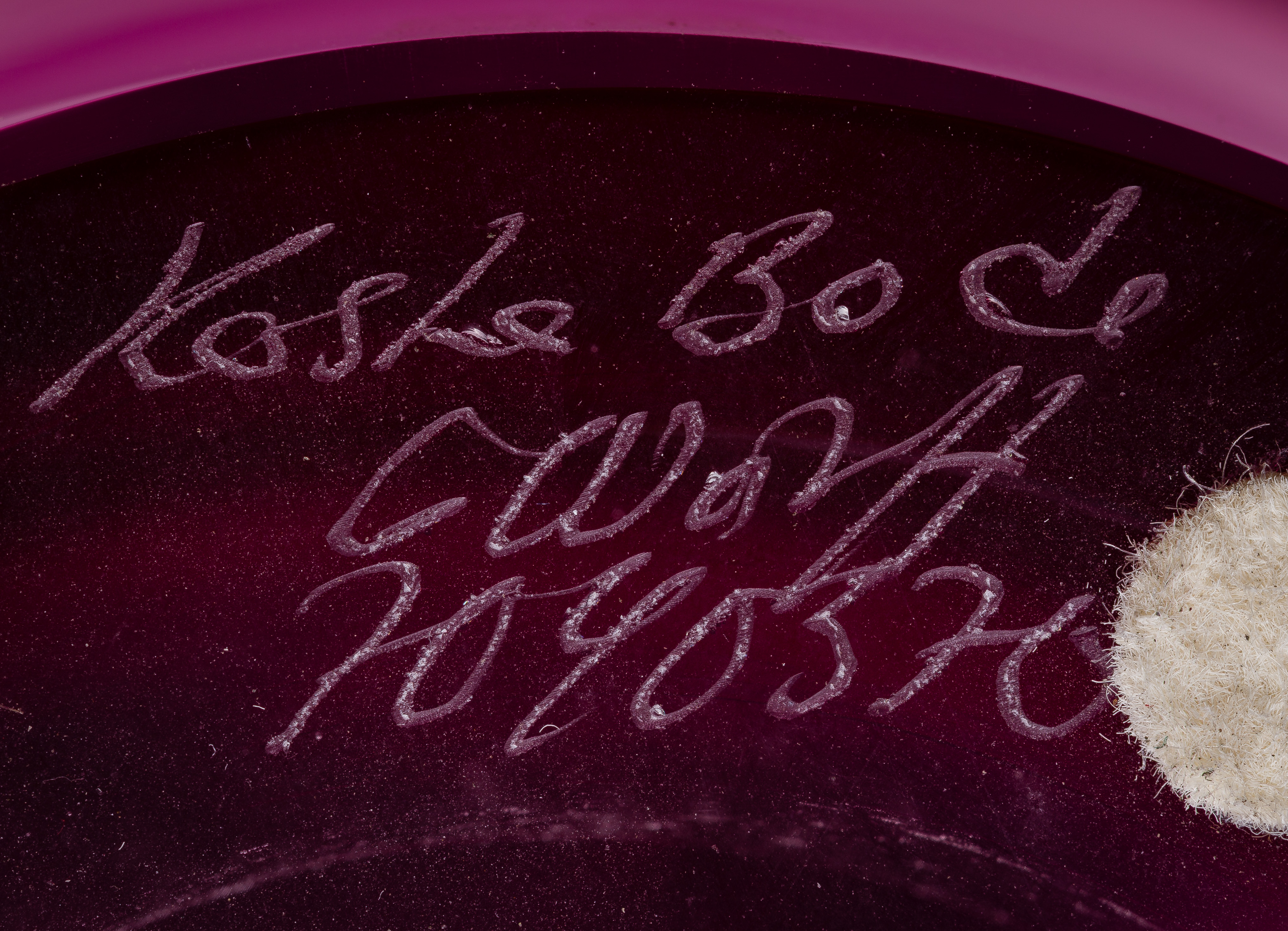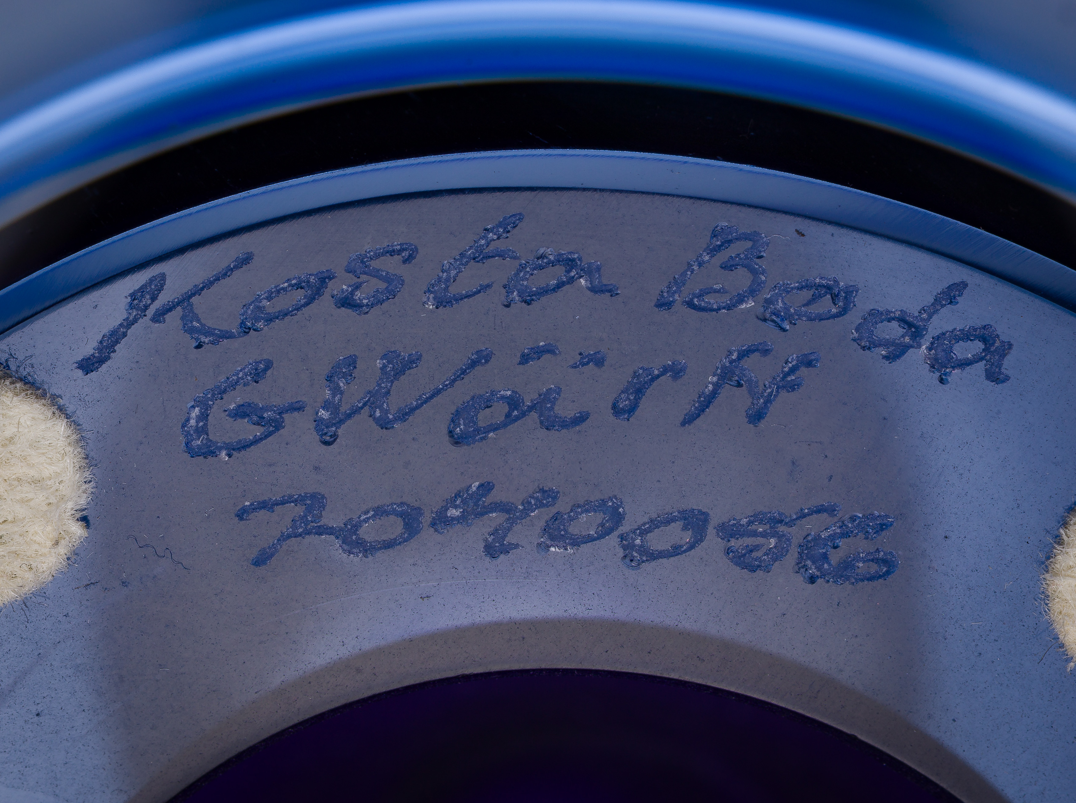 (5) total items including (2) aubergine vases, a cobalt blue vase (all having rows of controlled bubbles) and a yellow centerpiece, all having engraved signatures underside, some retaining Kosta Boda labels; together with an Orrefors aubergine bowl having engraved mark