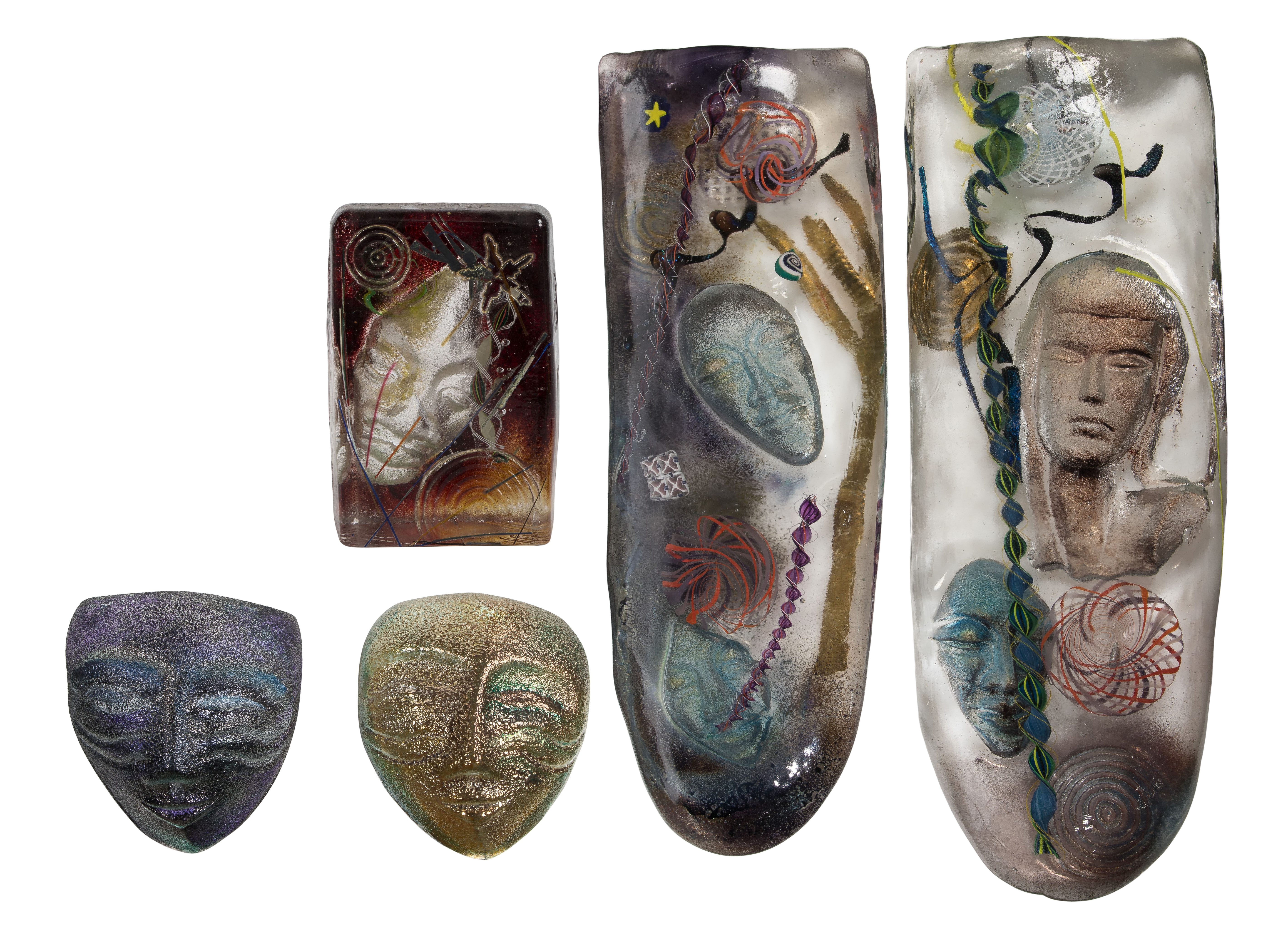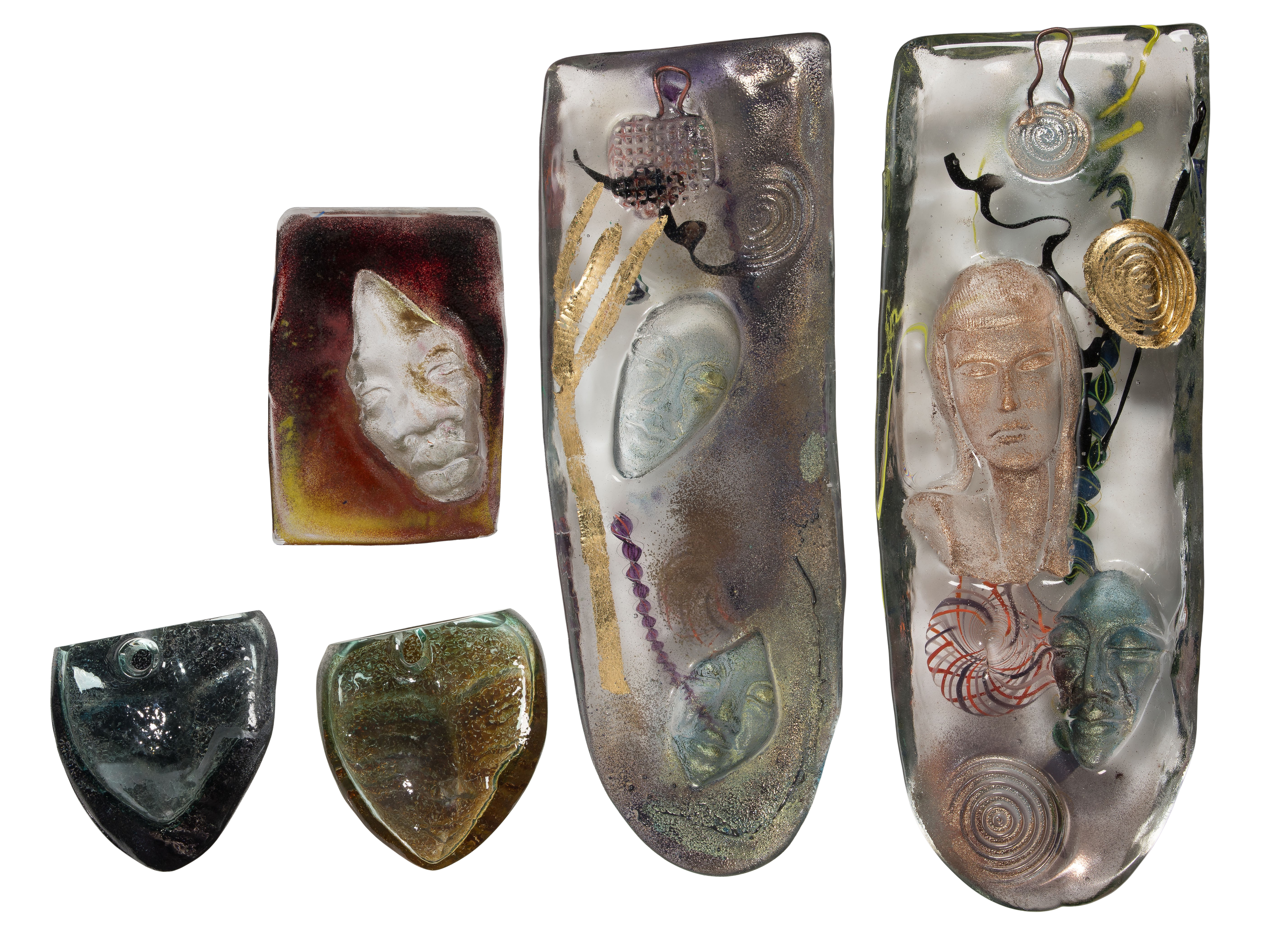 (5) items including (4) wall hangings and a sculpture, one signed by artist, two signed with studio name and two attributed