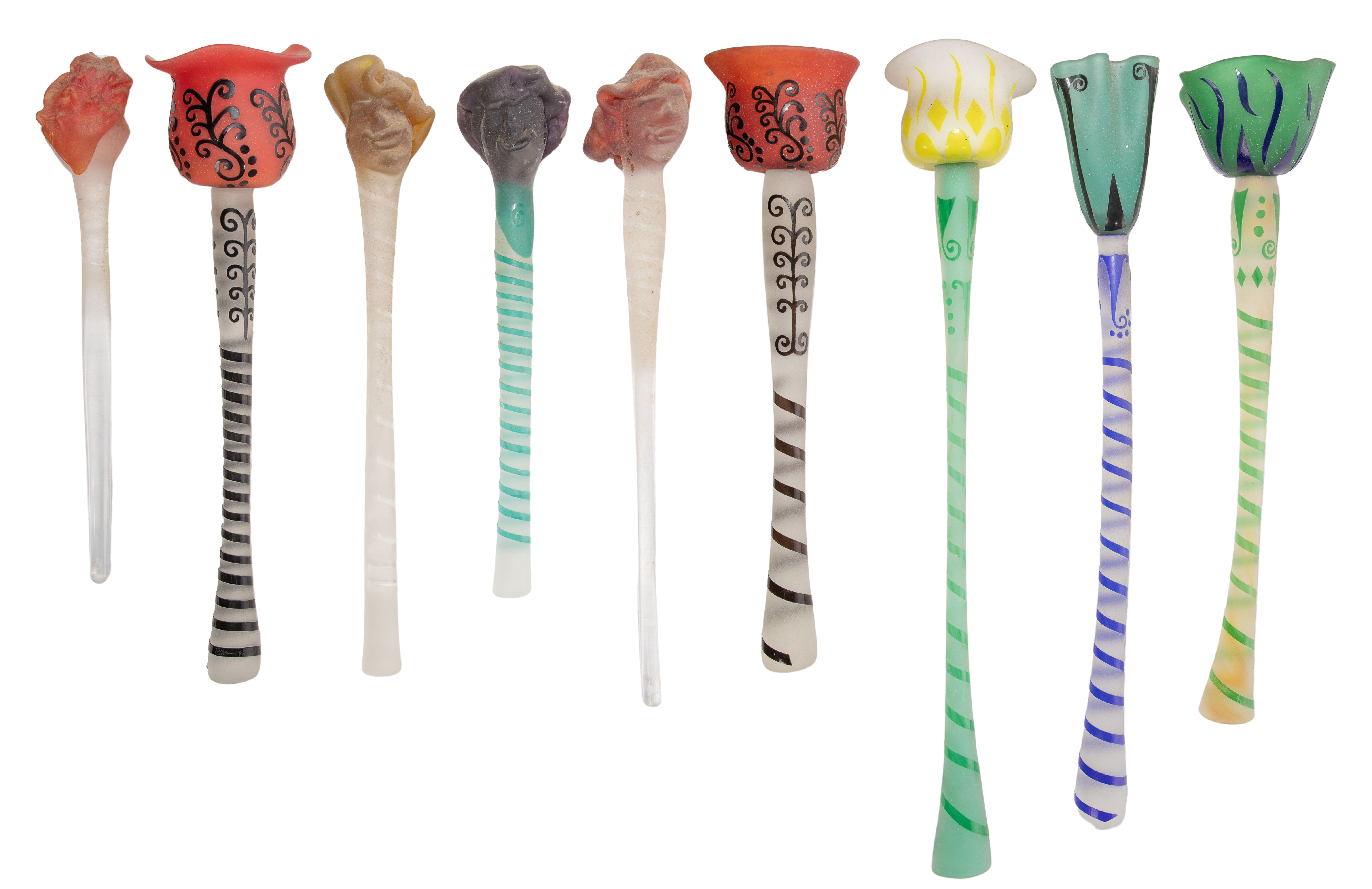 (9) scepter style items, (4) topped with various colored heads having grotesque faces and (5) having floral tops, some having engraved signatures