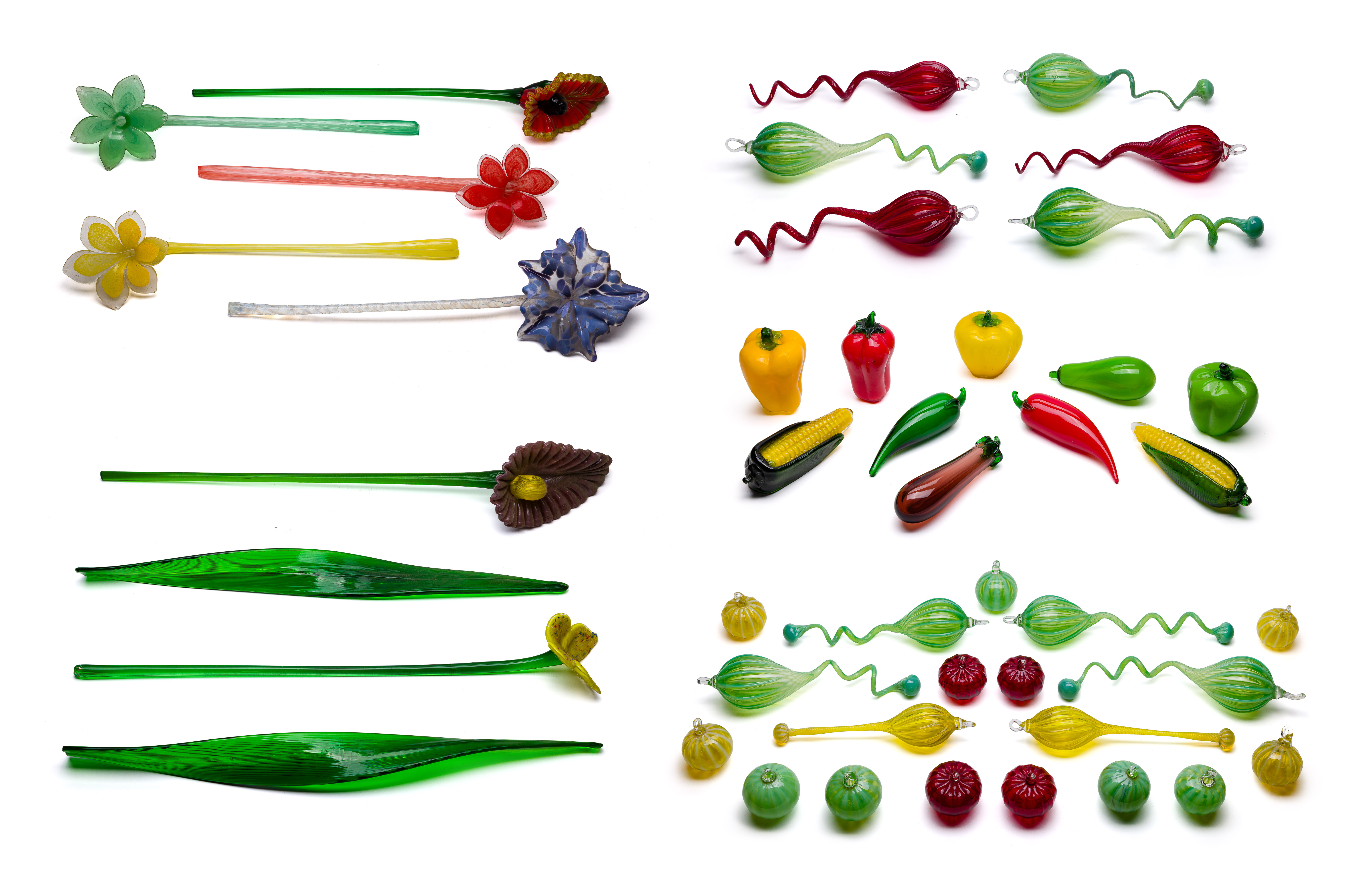 Condition: one small green swirl ornament having a broken hook loop, some items having chips to the edges