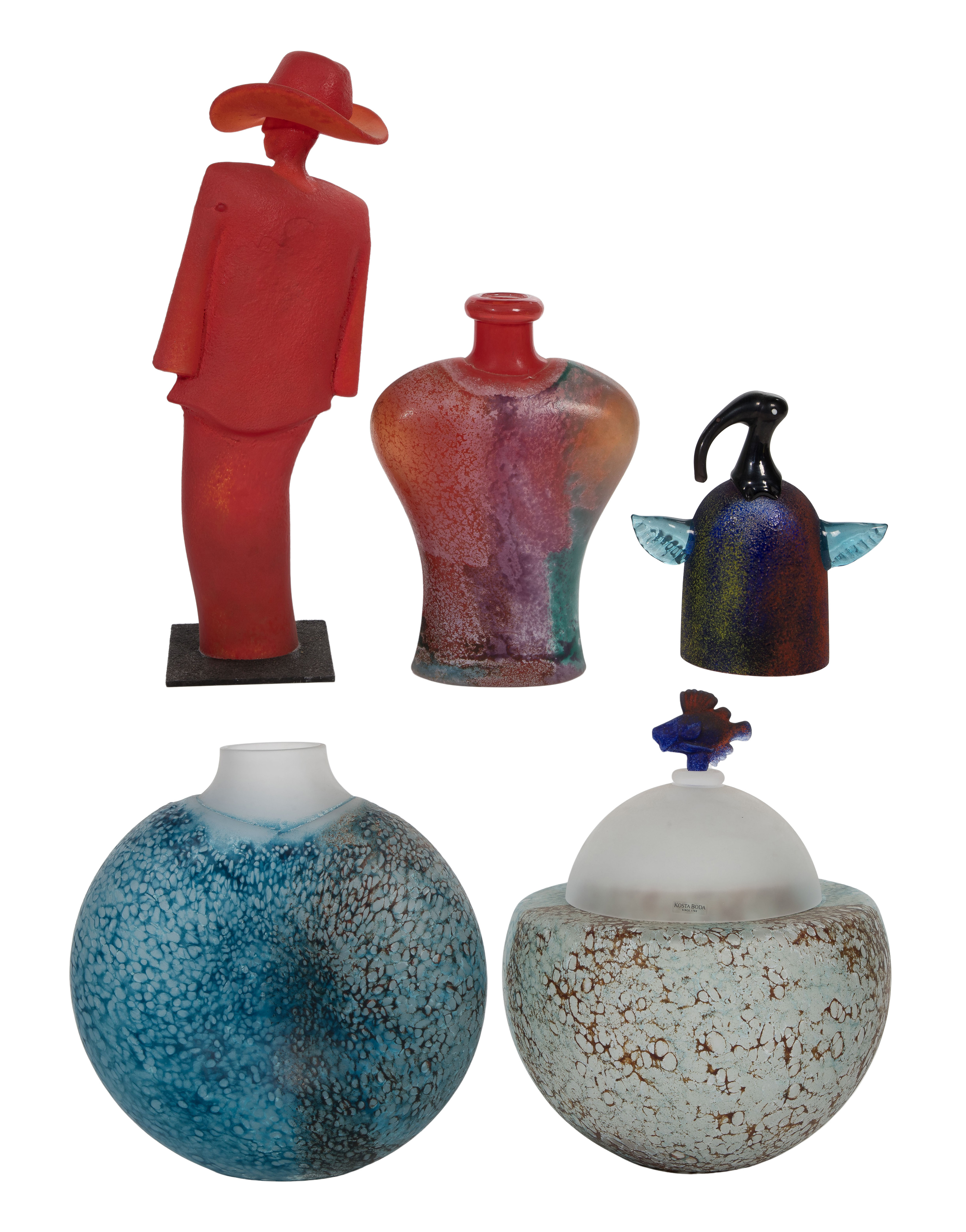 (5) items of various colors including a figural sculpture, an avian form, a broad-shouldered bottle vase, a compressed globular form vase and a covered jar having a fish form finial, some having engraved marks underside, some retaining Kosta Boda labels